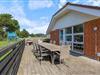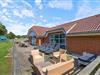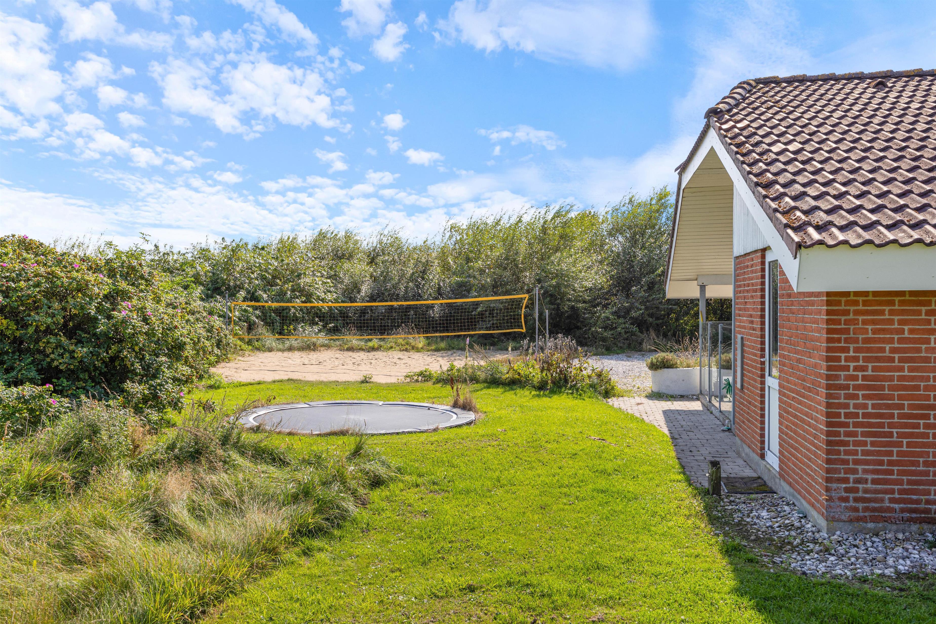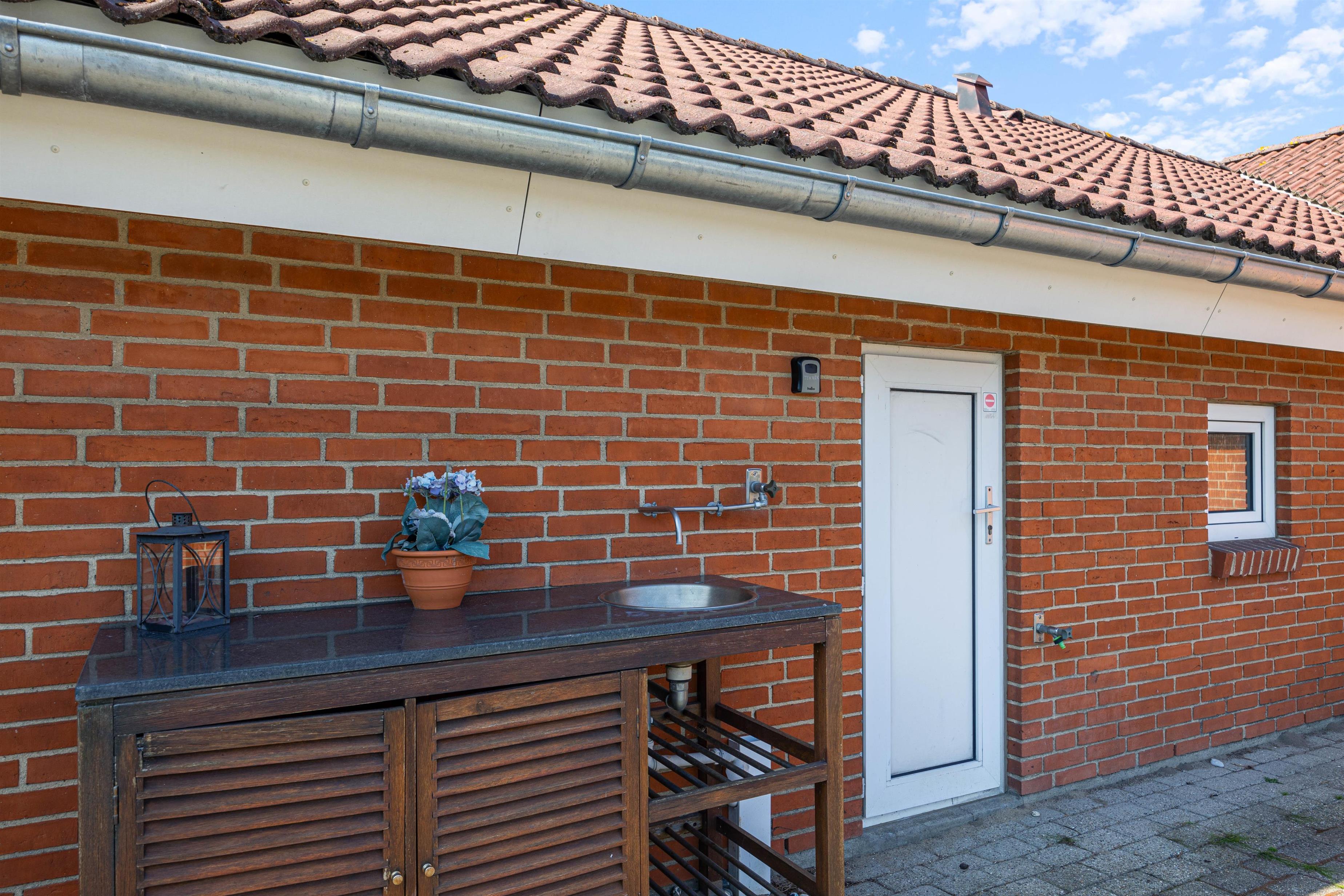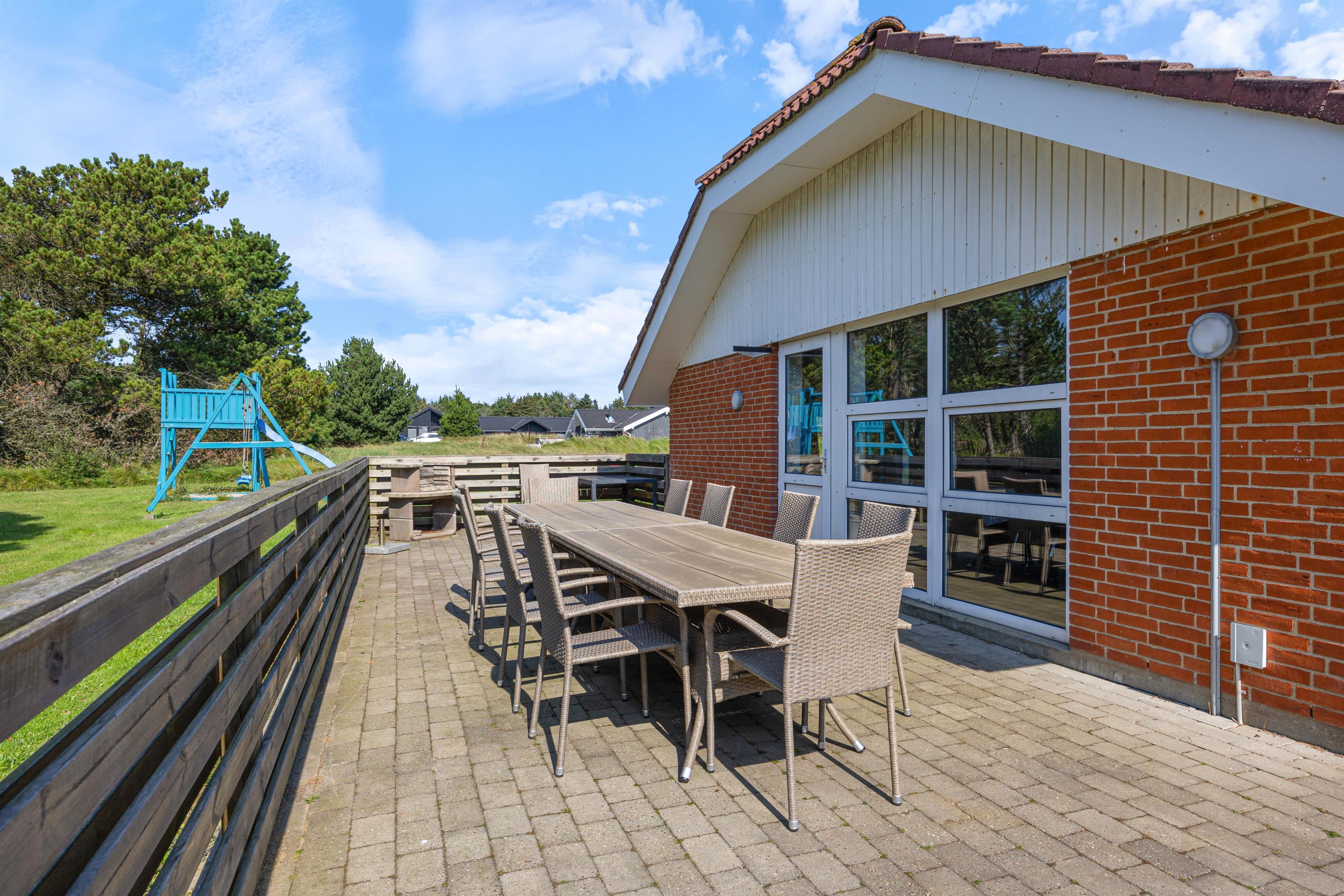 Fra køkkenet er der adgang til den overdækkede terrasse, som er delvist afskærmet. Her kan alle finde deres yndlingsplads, selv hvis det regner. Mens I sætter jer til rette i havemøblerne, kan børnene boltre sig på gyngen eller bygge fantastiske sandslotte i sandkassen. Om aftenen kan I runde en dejlig feriedag af med en lækker grillaften.
