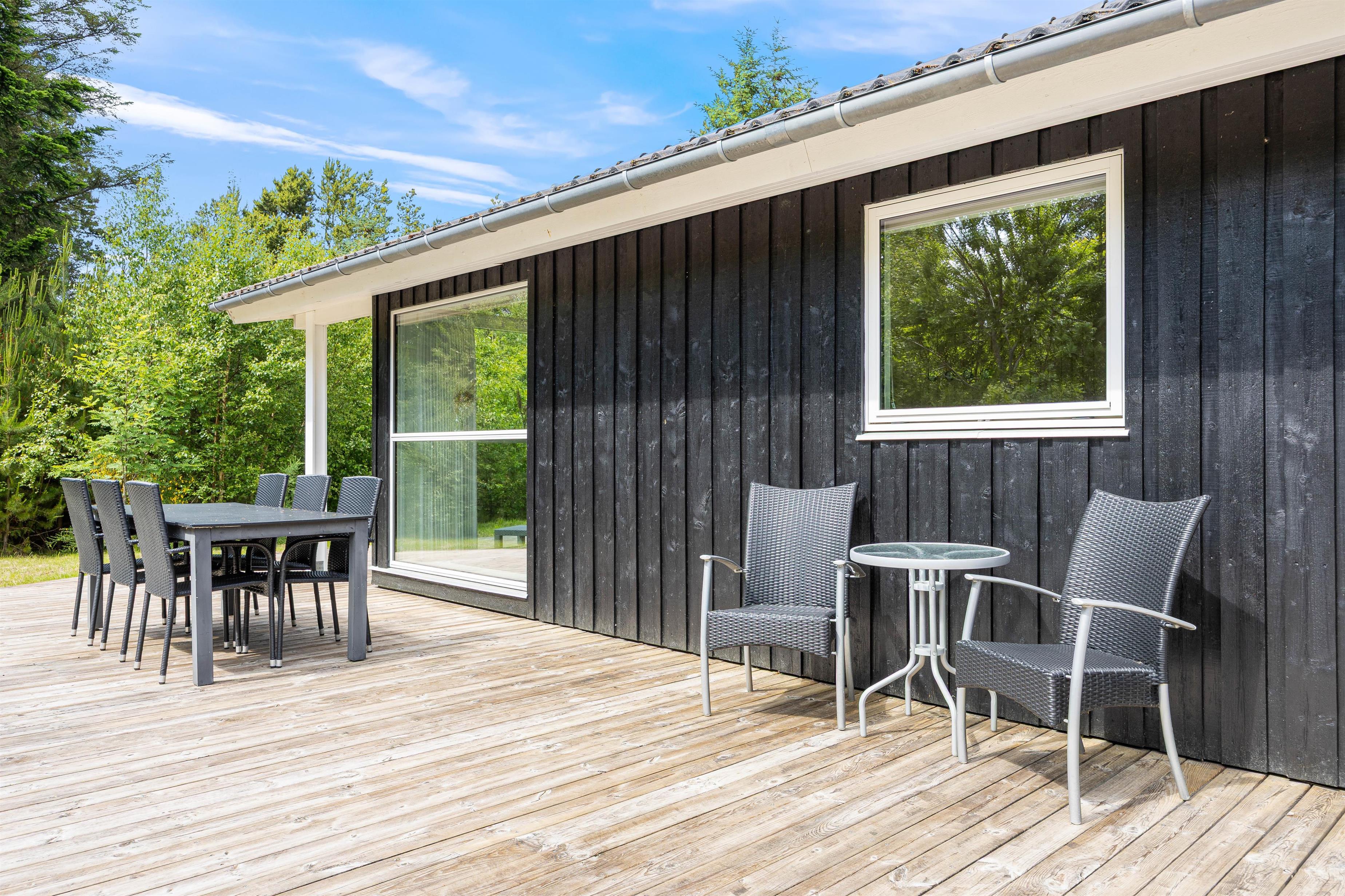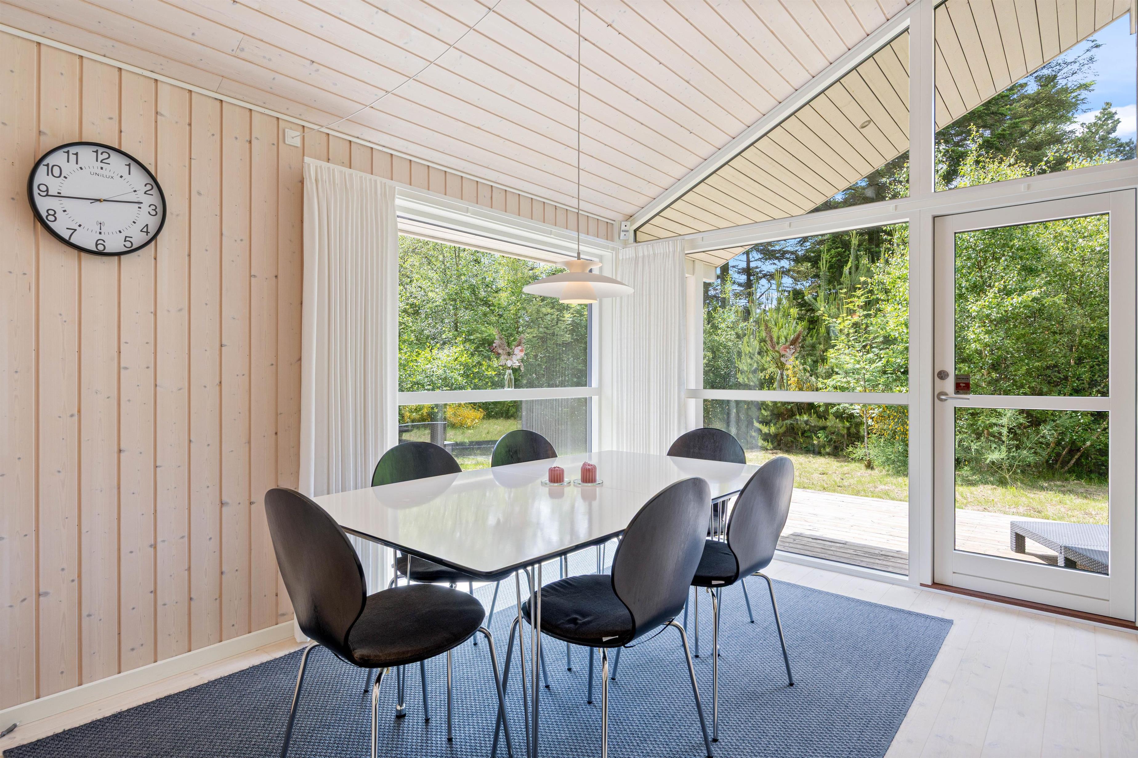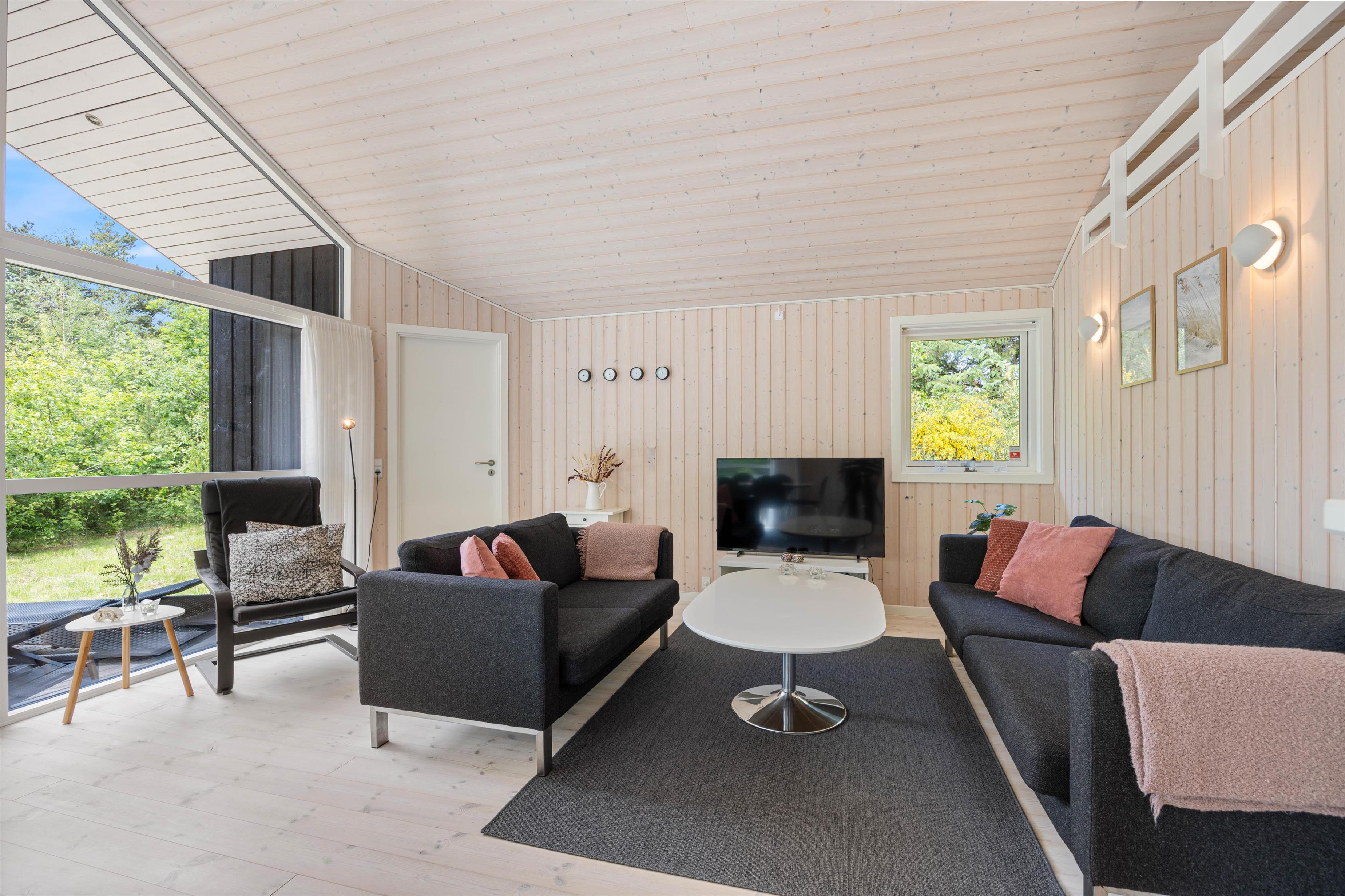Hele feriehuset er meget lyst indrettet, hvor de mørke møbler skaber et godt modspil til den ellers lyse stil. De store vinduer lukker masser af lys ind og giver en flot udsigt til den omkringliggende natur. Hele køkkenalrummet føles større, end det egentlig er, og det skyldes den gode indretning og loftet, som går hele vejen til kip. Stueafdelingen er hyggelig og velegnet til en aften foran fjernsynet eller med en god bog. Her er der mulighed for at streame jeres yndlingsserie via et Chromecast.