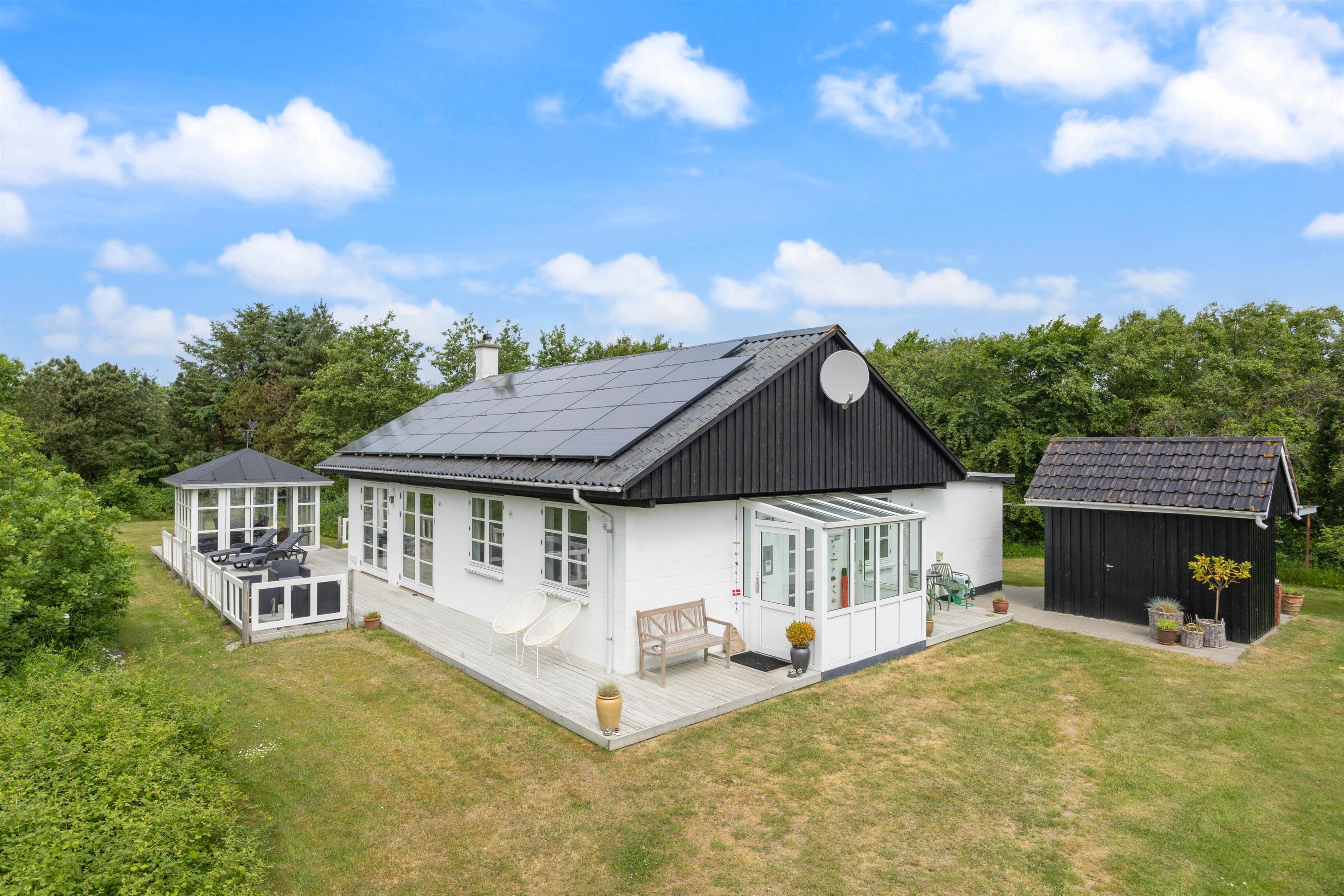 Det hvide sommerhus stråler i solens skær, mens de grønne træer i baggrunden omfavner grunden og strækker sig mod den blå himmel. Med fuglesang og bladenes rislen som det eneste, der bryder stilheden, er den fredfyldte sommerhusferie garanteret.