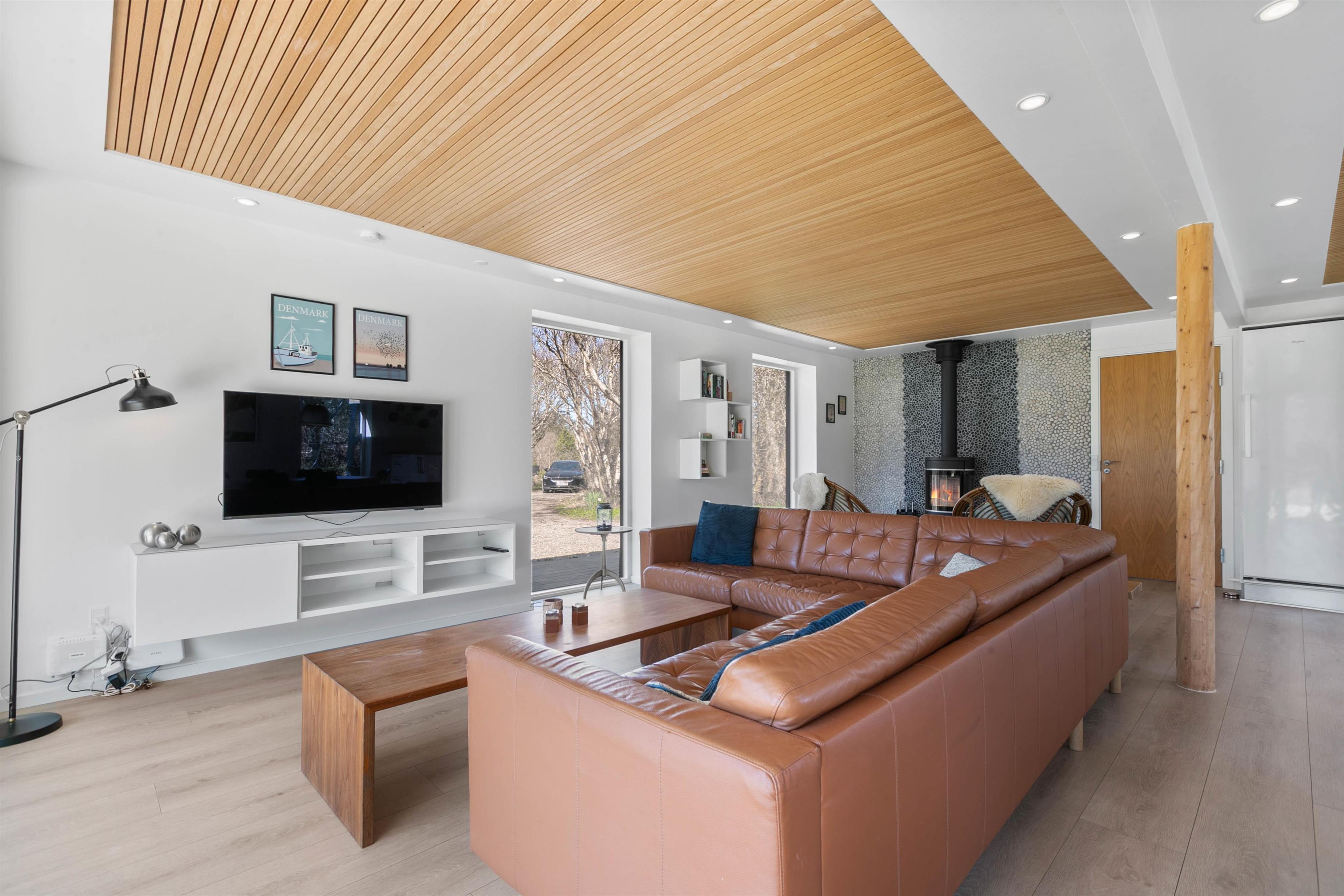 I stuen sørger brændeovnen for at gøre indretningen ekstra hyggelig: Brændeovnen står året rundt klar til at varme jer igennem indendørs, mens vildmarksbadet sørger for varm afslapning udendørs. På badeværelset er der gulvvarme, sådan at I ikke fryser tæerne om morgenen.