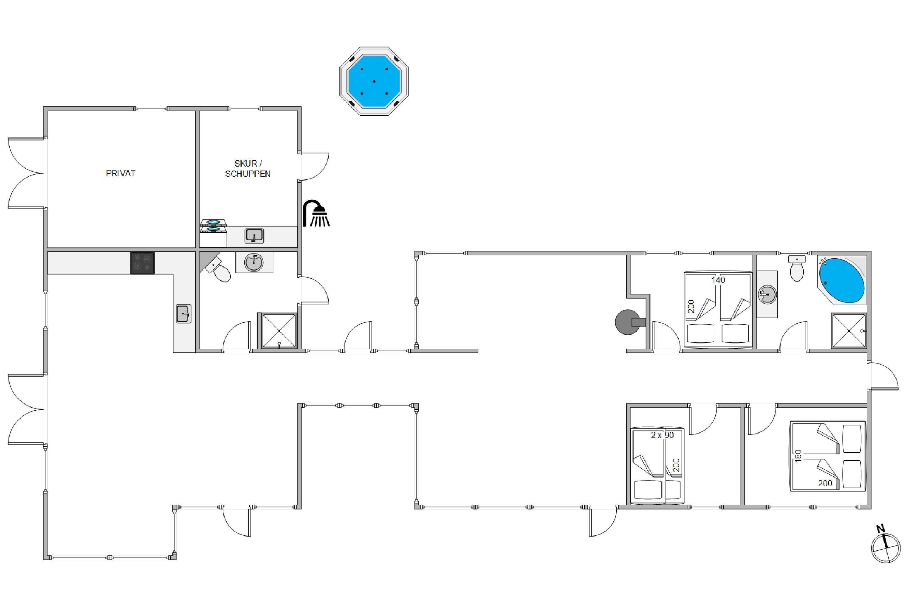 Da feriehuset er nybygget i 2024 vil I derfor blive mødt af en moderne indretning, når I træder ind i feriehuset. Sommerhuset består af 2 afdelinger, der er forbundet med en entre. Det er især praktisk, hvis I skal arrangere en spilleaften sammen, og børnene allerede sover, da køkken og spiseplads ligger i den ene halvdel af feriehuset, mens stue og soveværelser ligger i den anden halvdel. De to badeværelser i feriehuset er placeret med ét i hver afdeling af feriehuset. Hele sommerhuset er udstyret med gulvvarme, så I slipper for at få kolde fødder. Biopejsen i stuen er med til at give en hyglig stemning i feriehuset.