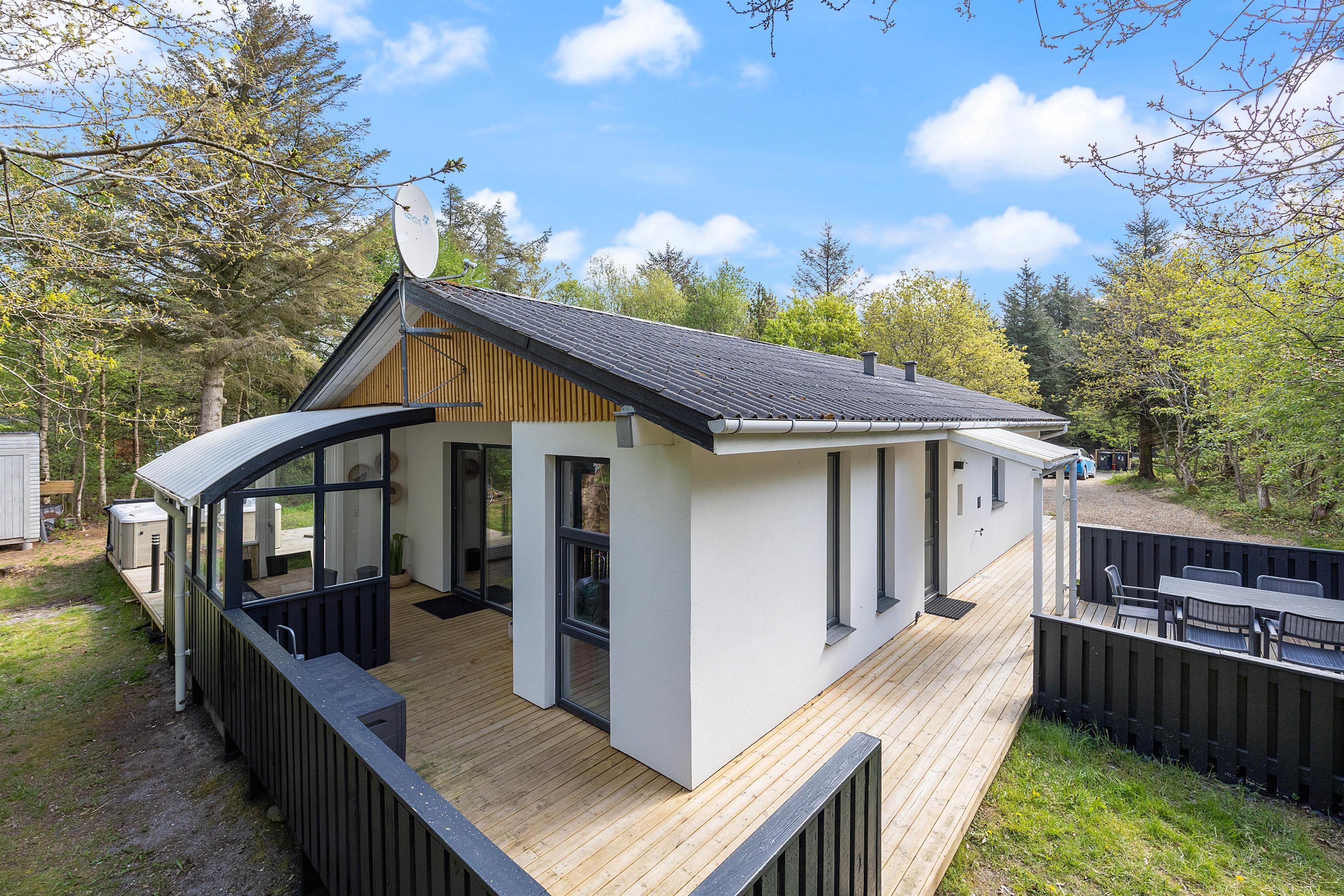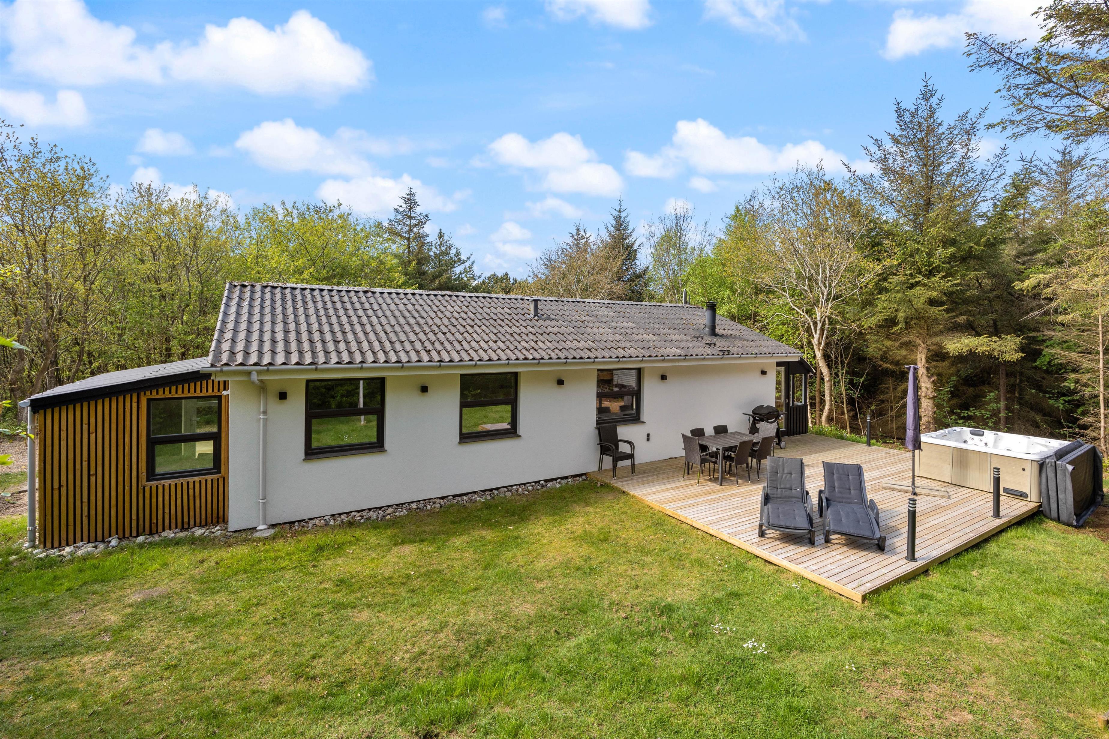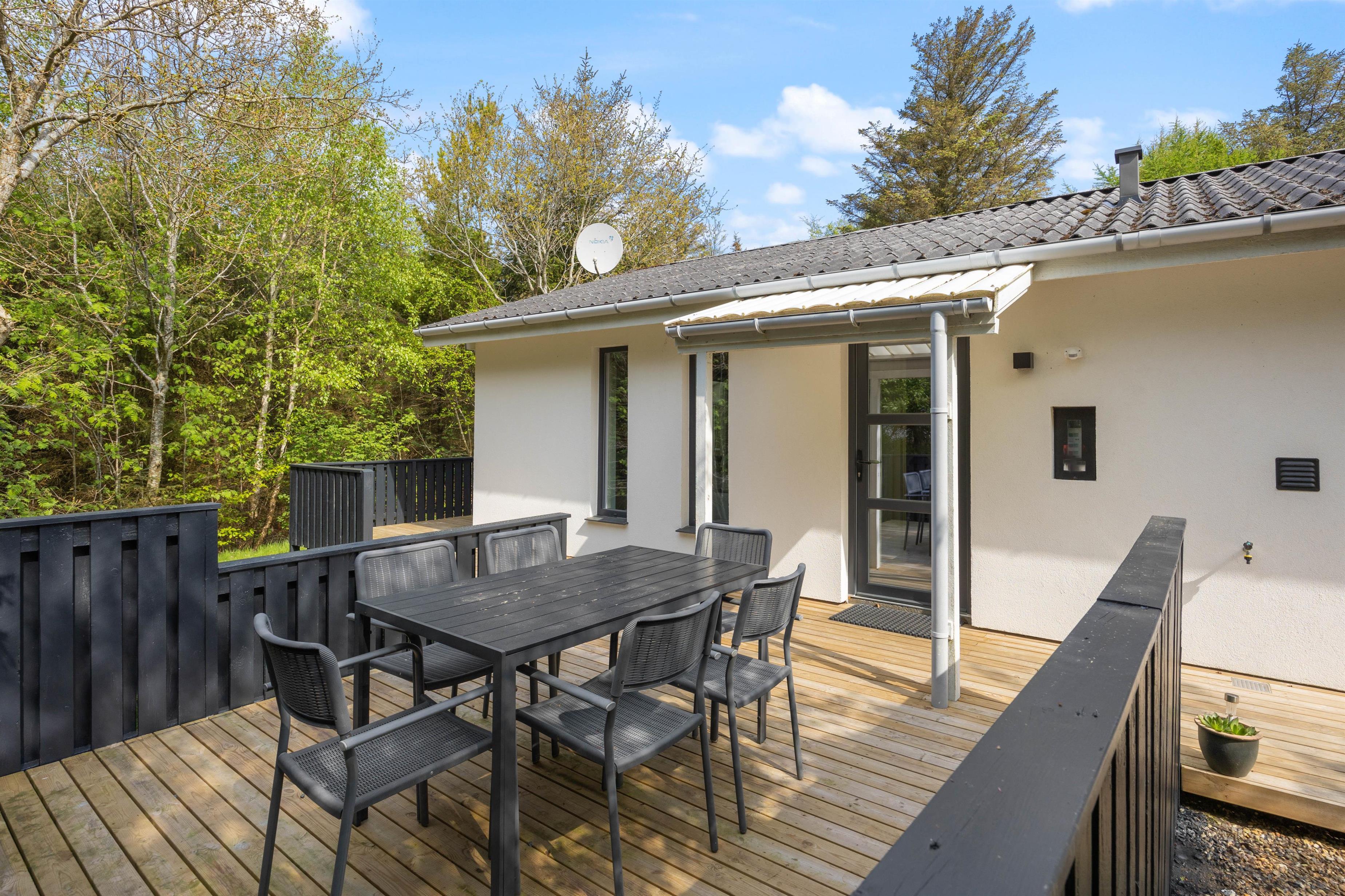 Derudover har sommerhuset en fantastisk træterrasse, der strækker sig ud i den smukke naturgrund. Denne terrasse er fyldt med dejlige kroge, hvor du kan nyde skøn feriemad fra grillen. Forestil dig at grille saftige bøffer, friske grøntsager og smagfulde marinader, mens du nyder det omkringliggende landskab og den friske duft af naturen. Det er den ultimative udendørs spiseoplevelse. På terrassen finder du også solvogne, der inviterer dig til at slappe af og nyde solens varme stråler.