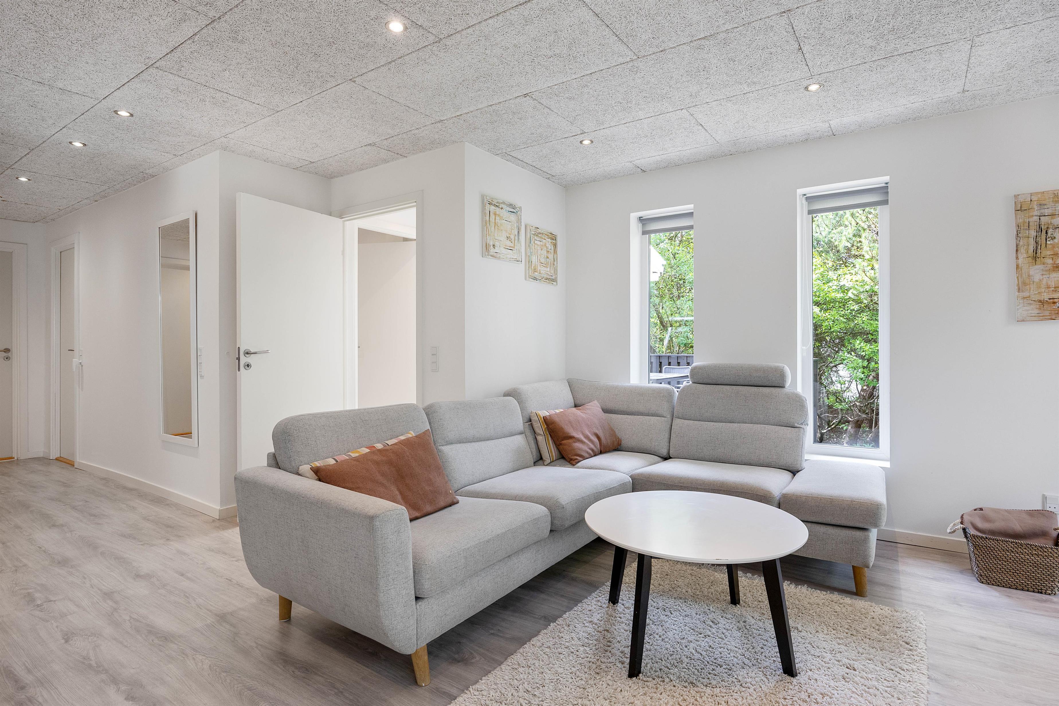 Når du træder ind i sommerhuset, vil du straks bemærke det lyse og moderne køkken, som er indrettet med stil. Det er en fryd at lave mad her, og det er et perfekt sted at samles omkring madlavningen. I stuen finder du en dejlig hyggekrog med brændeovne, der både sikrer varme og hygge på kølige aftener. Forestil dig at sidde foran flammerne og slappe af efter en dag med udendørs aktiviteter. Det er den perfekte atmosfære at skabe gode minder i.