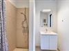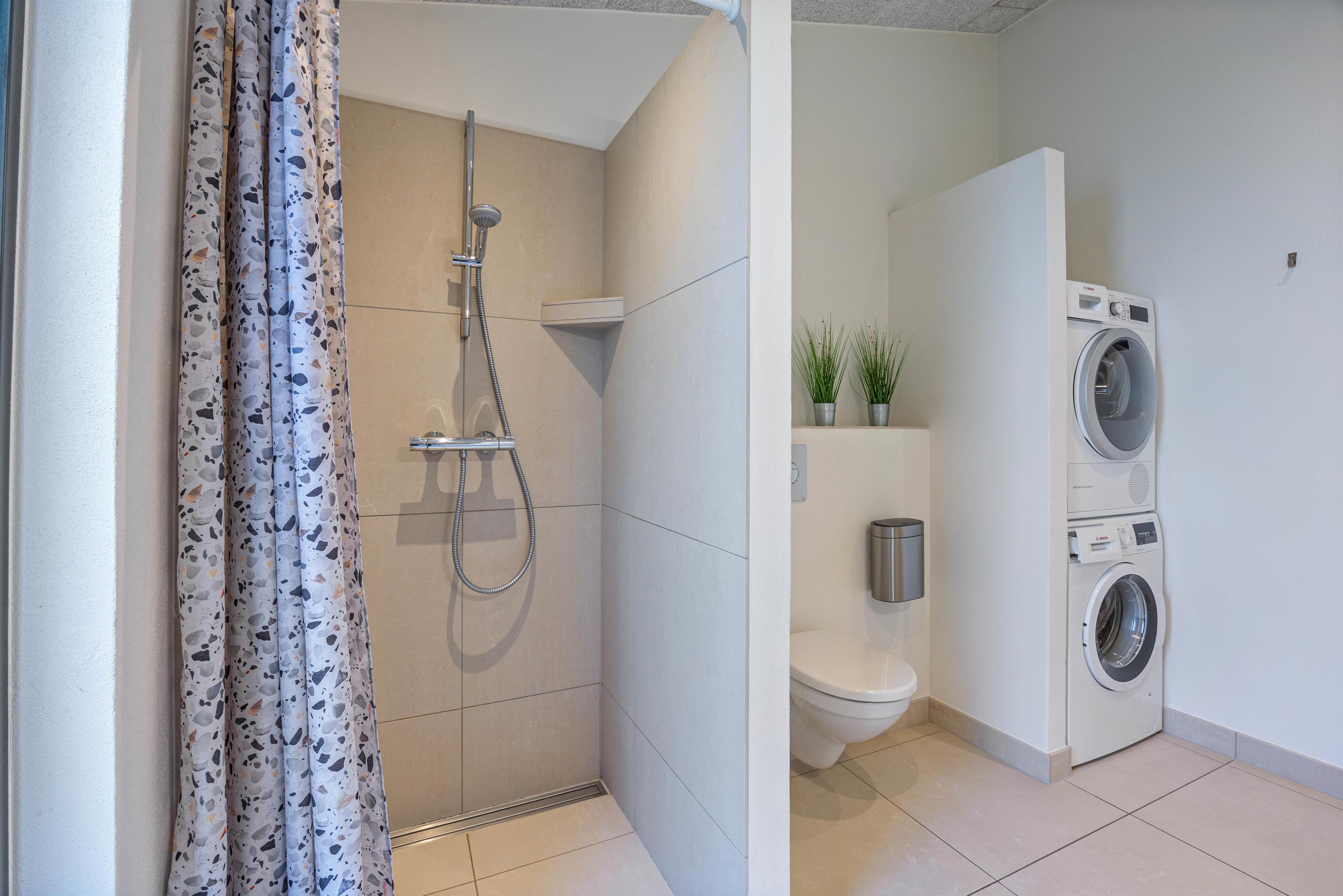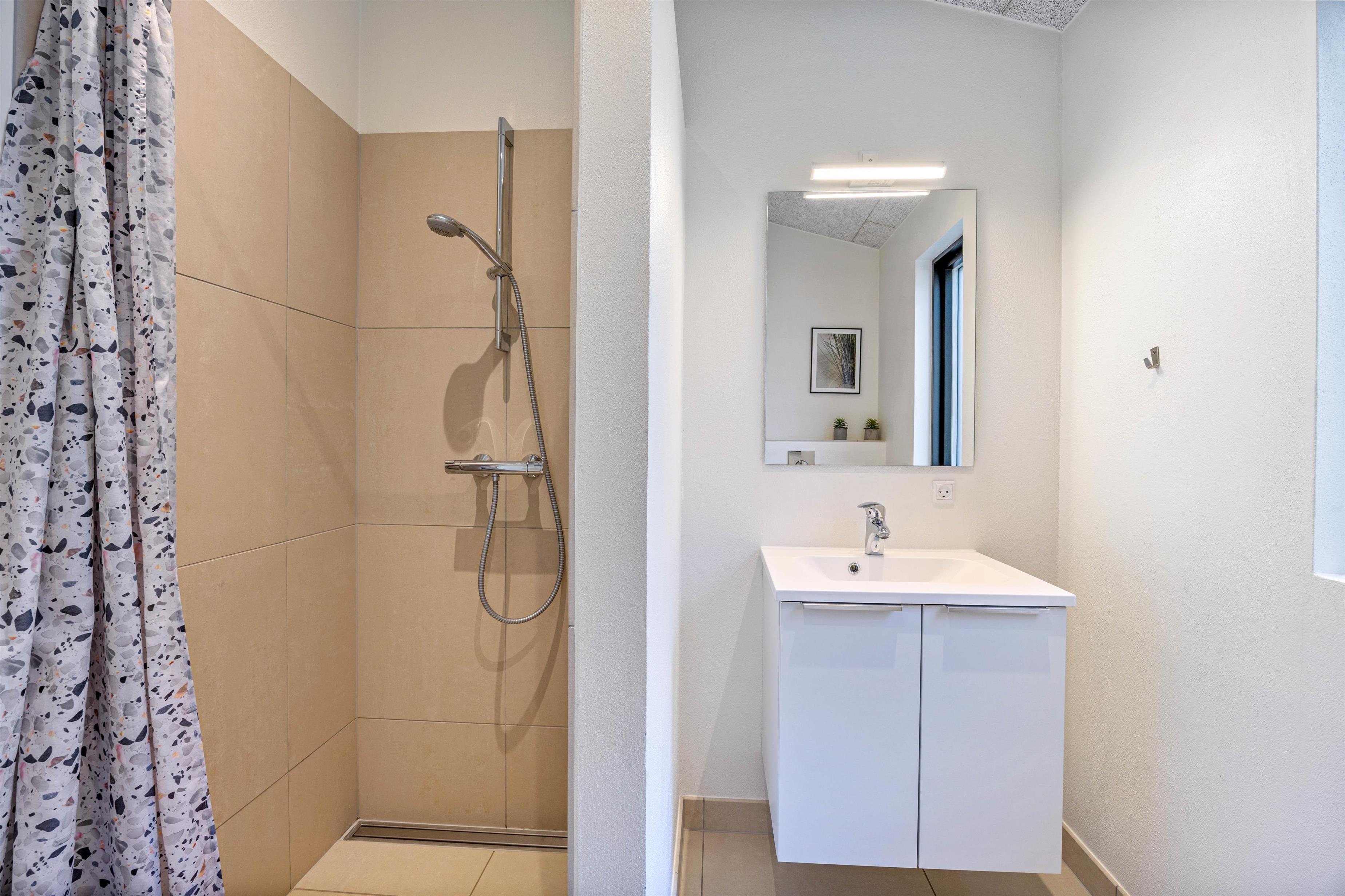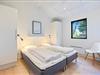Master bedroom med eget badeværelse og udgang til udendørs sauna på Brunbjergvej 8