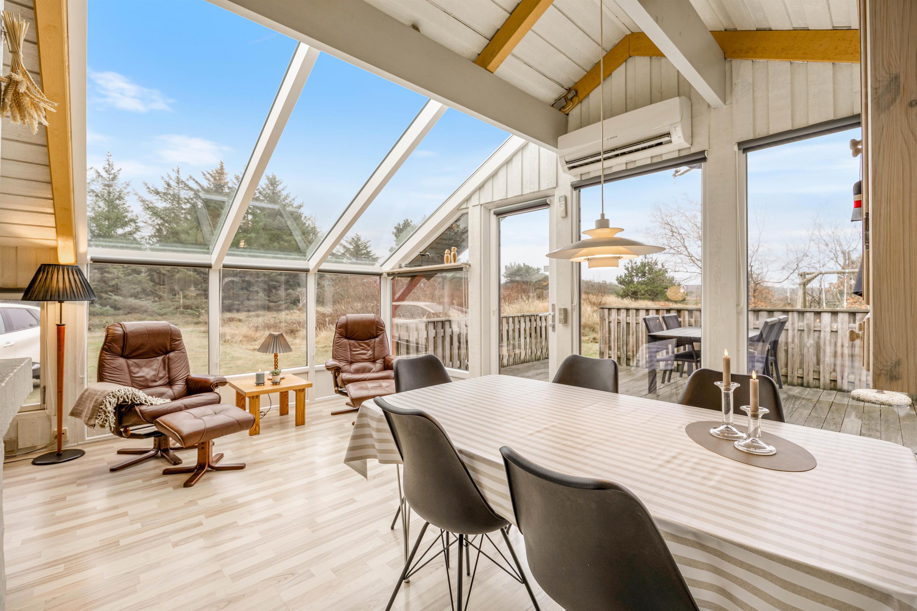 Fra sofaen kan I nyde det smukke lysindfald, der træder ind af de store vinduespartier. Lyset reflekteres på bedste vis rundt i det højloftede lokale, hvor der er loft til kip. Jeres øjne vil uden tvivl også blive draget mod de åbne vidder uden for vinduerne. For det er som ren balsam for sjælen at betragte naturen og vejrets skift udenfor.
