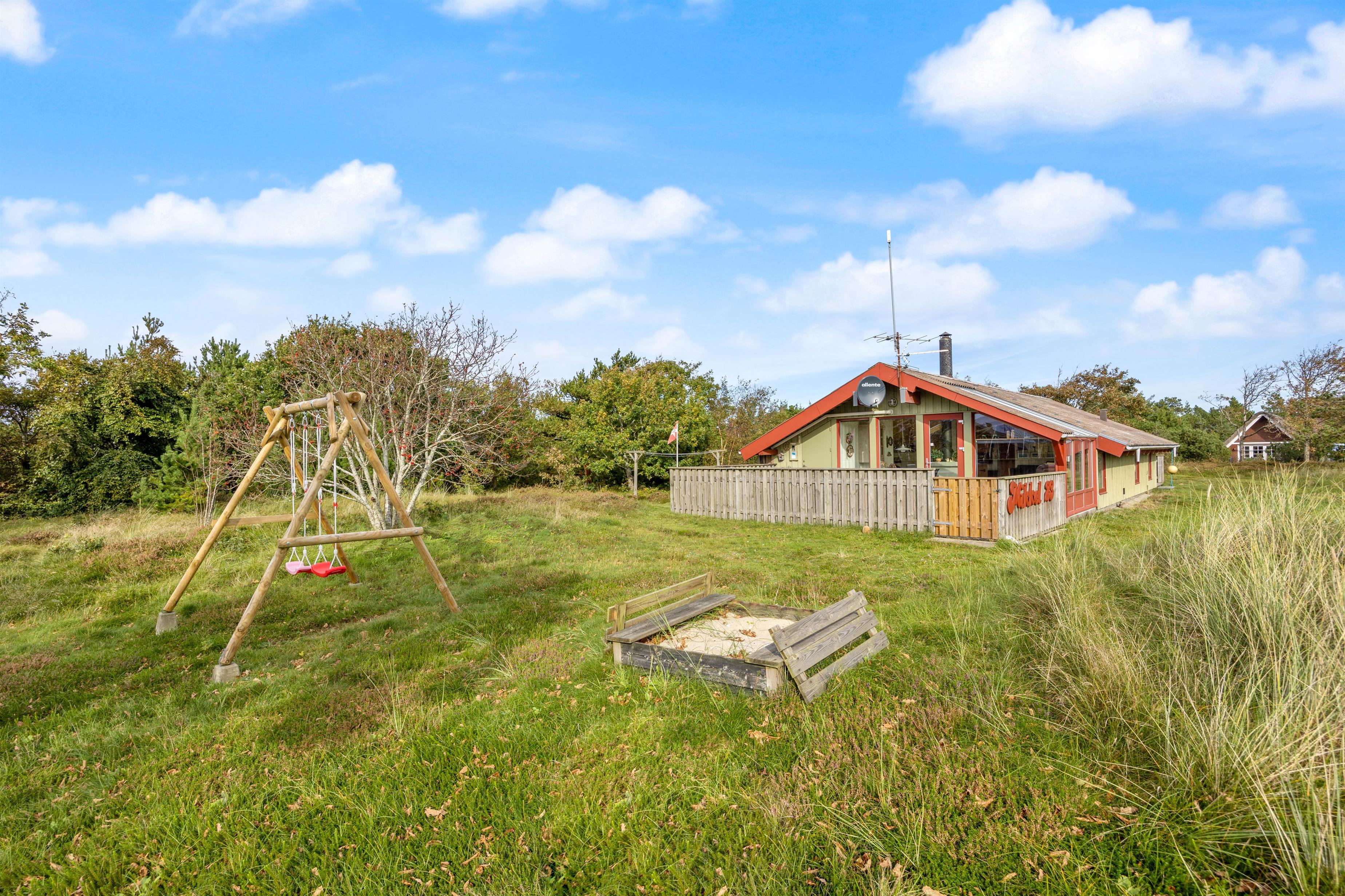 På den store, træbelagte og indhegnede terrasse kan I slappe af i solen i fred og ro, mens børnene boltrer sig på grunden. Der er både gynger og sandkasse – et sikkert hit hos familiens yngste – og legeredskaber, der indbyder til timevis af sjov. Den indhegnede terrasse giver desuden tryghed for både små børn og hunde, så hele familien kan slappe af uden bekymringer.