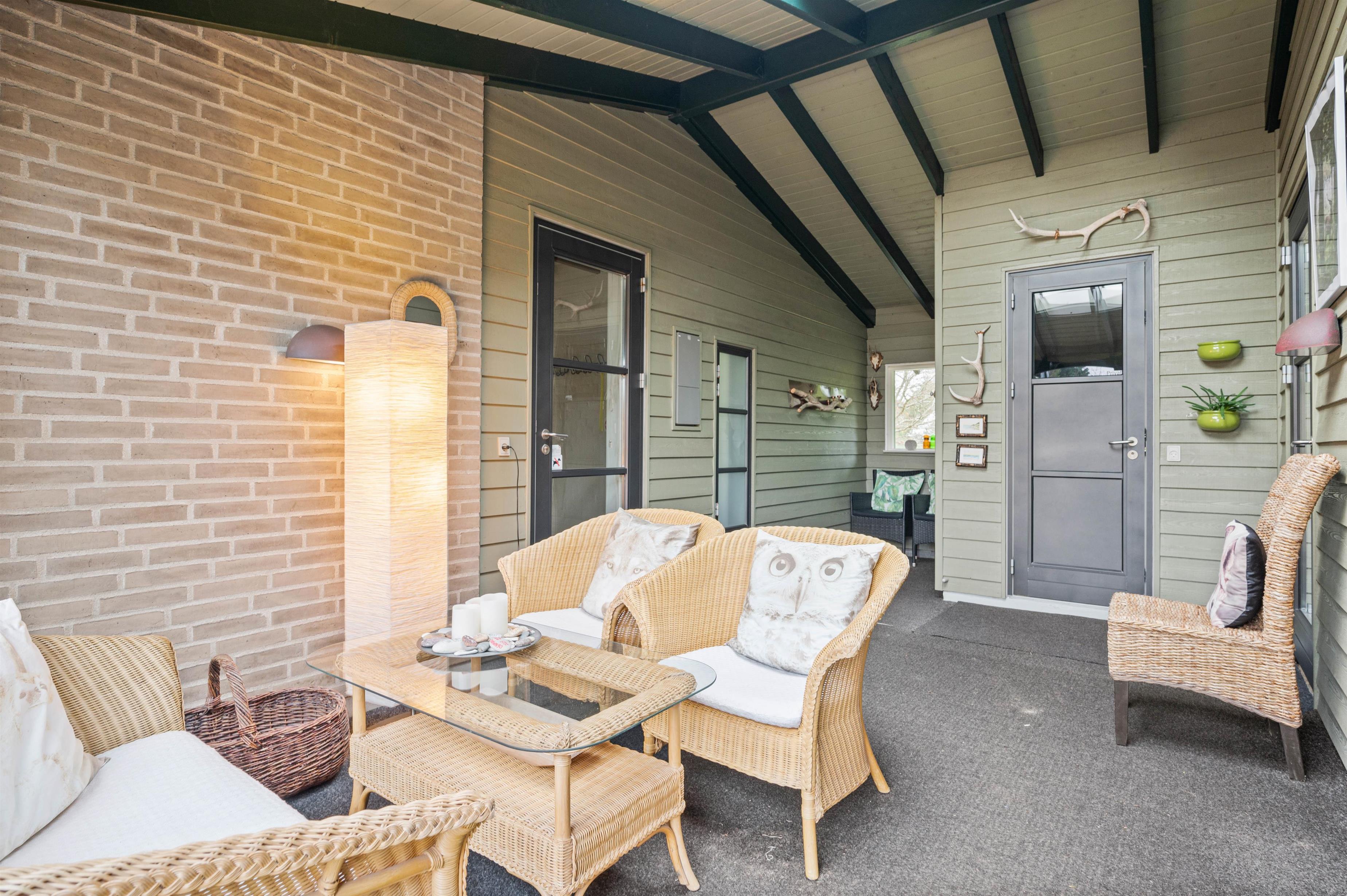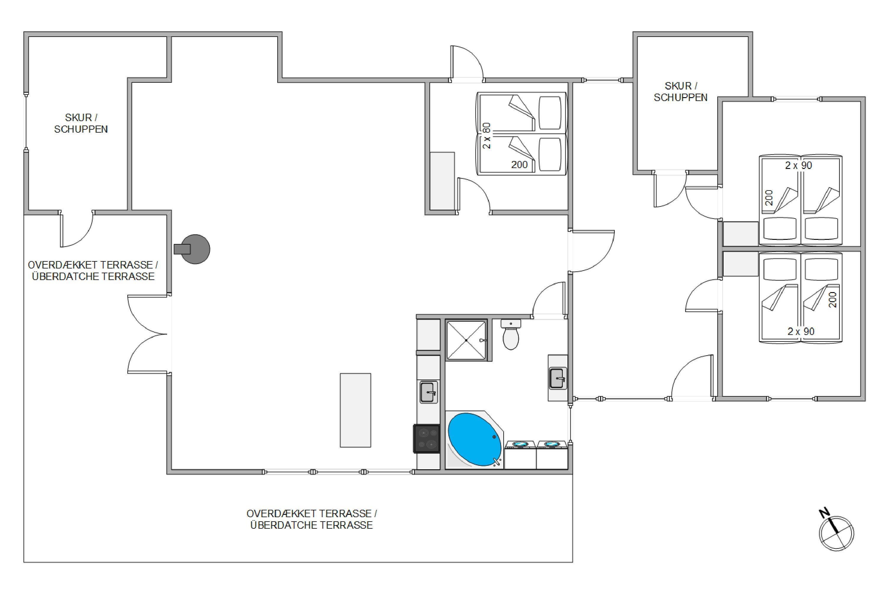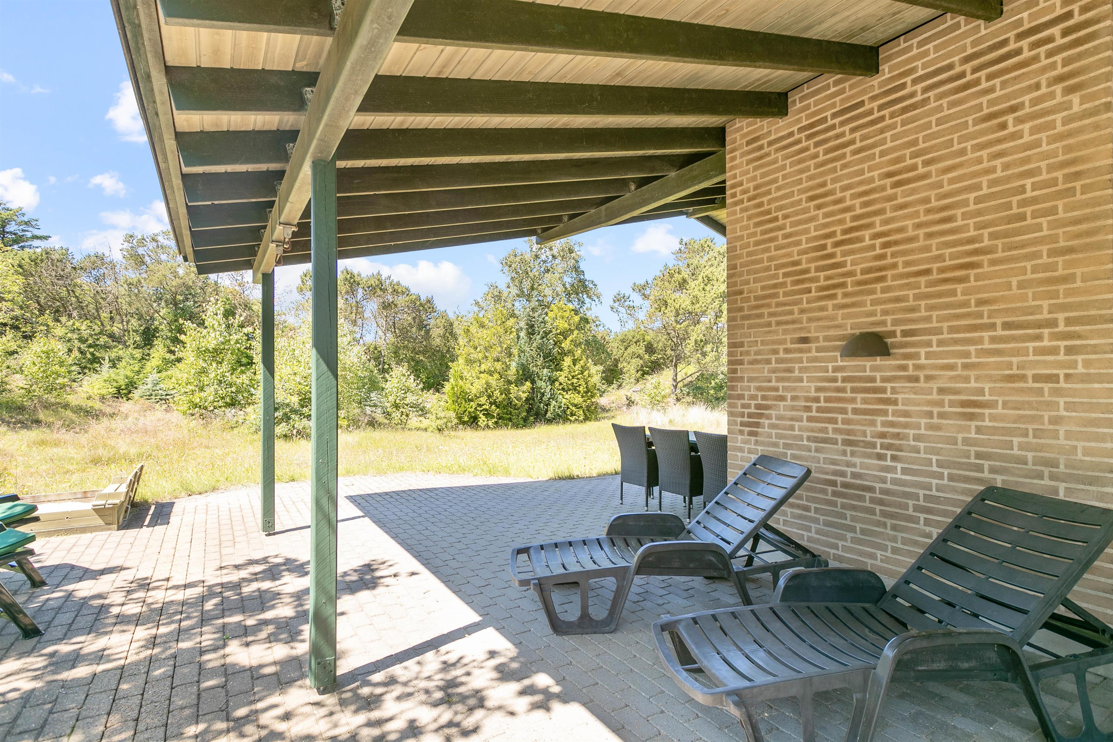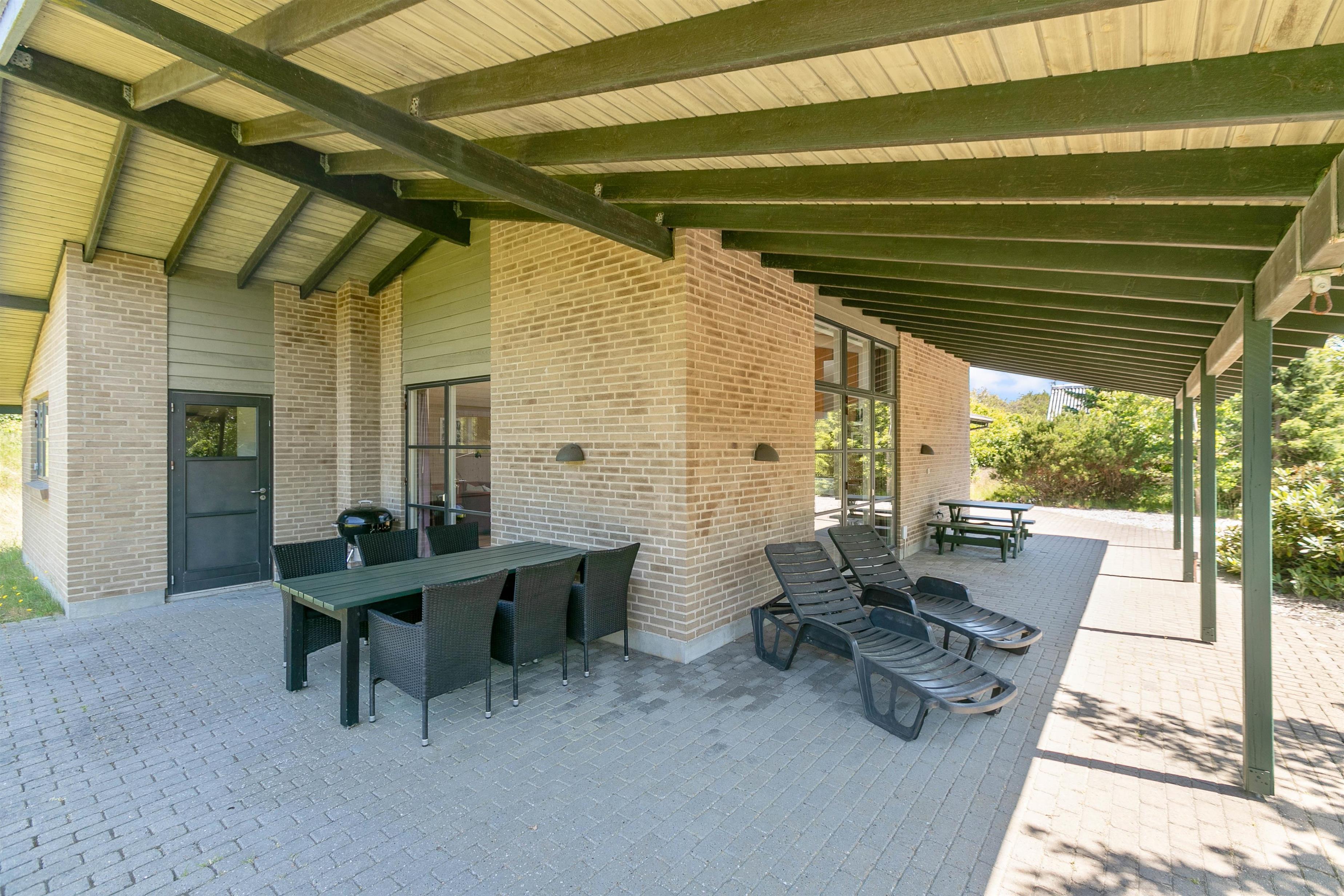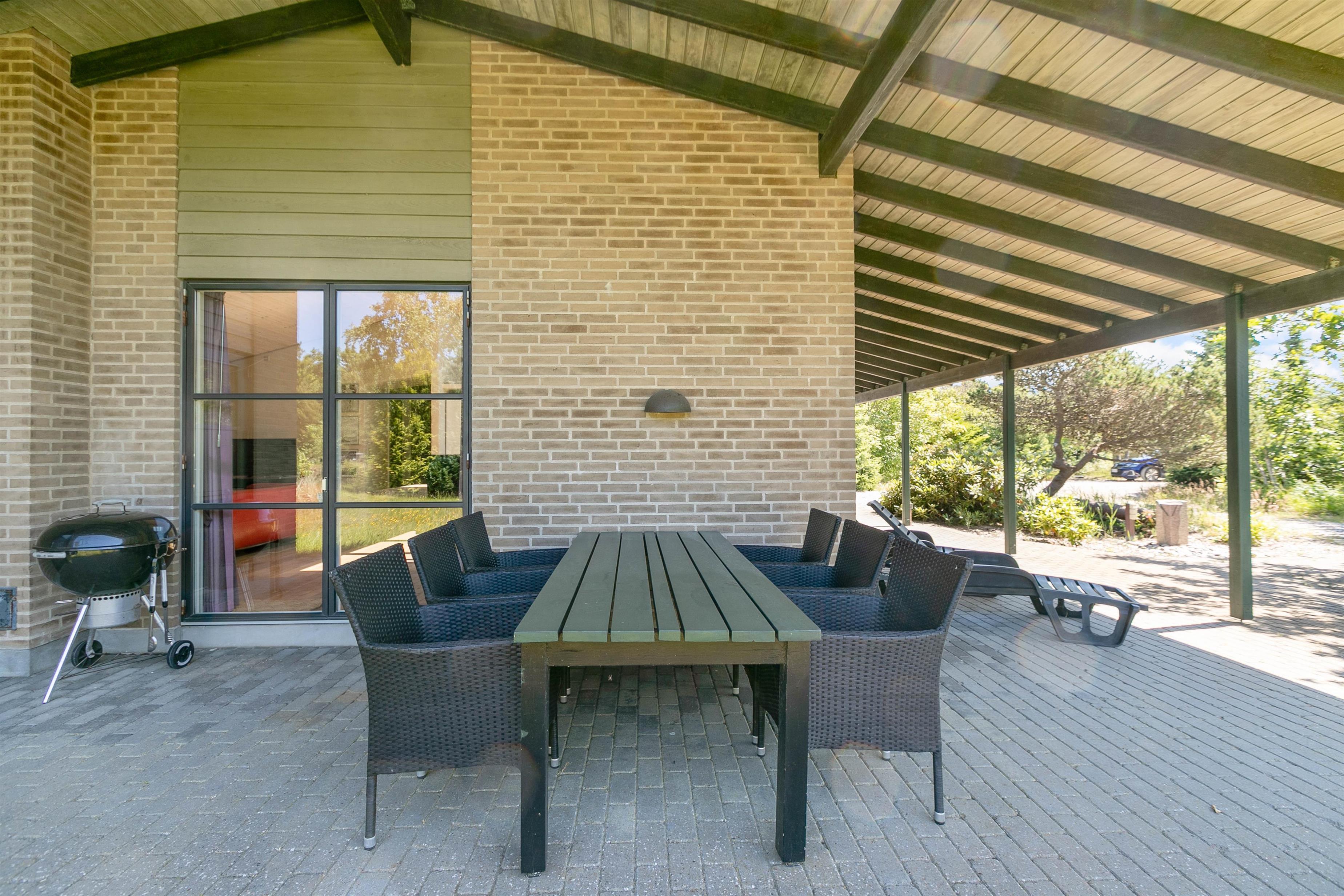 Omkring huset findes flere terrasser – nogle af dem overdækkede – så I kan nyde udelivet i alt slags vejr. Når aftenen falder på, er det oplagt at tænde grillen, hælde et koldt glas op og nyde den skønne natur på den næsten parklignende grund.