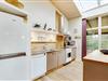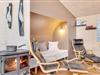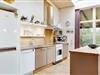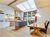 Sommerhusets hjerte er det lyse køkken-alrum i åben forbindelse med stuen. Her er stilfulde møbler, en hyggelig alkove og en brændeovn, der giver varme og atmosfære på kølige dage. Ovenlysvinduet lader lyset strømme ind og fuldender den luftige stemning.