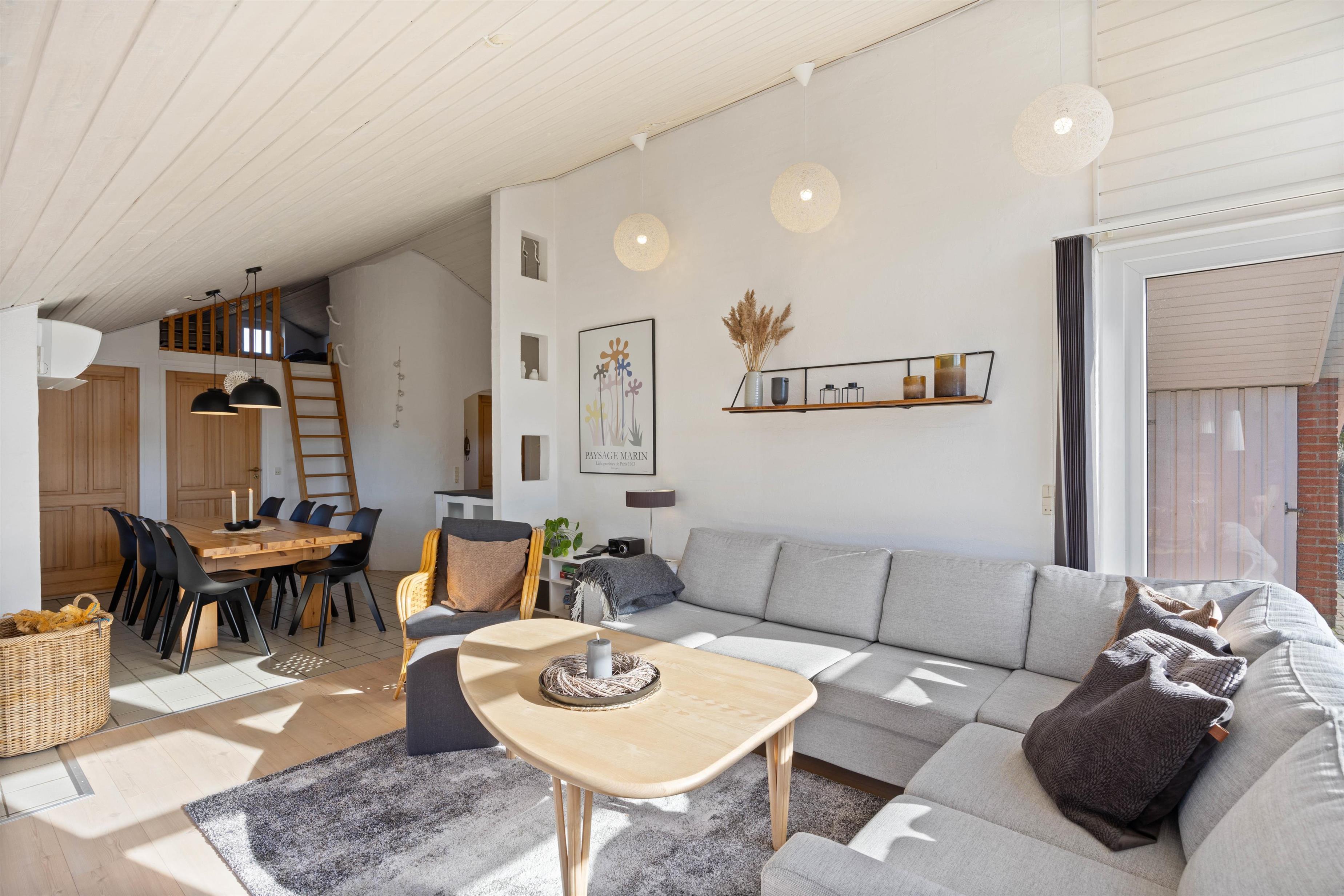 Køkken, stue og spiseplads ligger i åben forbindelse og udgør tilsammen alrummet, der er sommerhusets hjerte, hvor I kan samle hele ferieflokken til hyggelige feriestunder, mens brændeovnen knitrer i baggrunden og fuldender feriestemningen. Fra alrummet har I desuden adgang til en hems, som feriens yngste gæster helt sikkert vil elske.