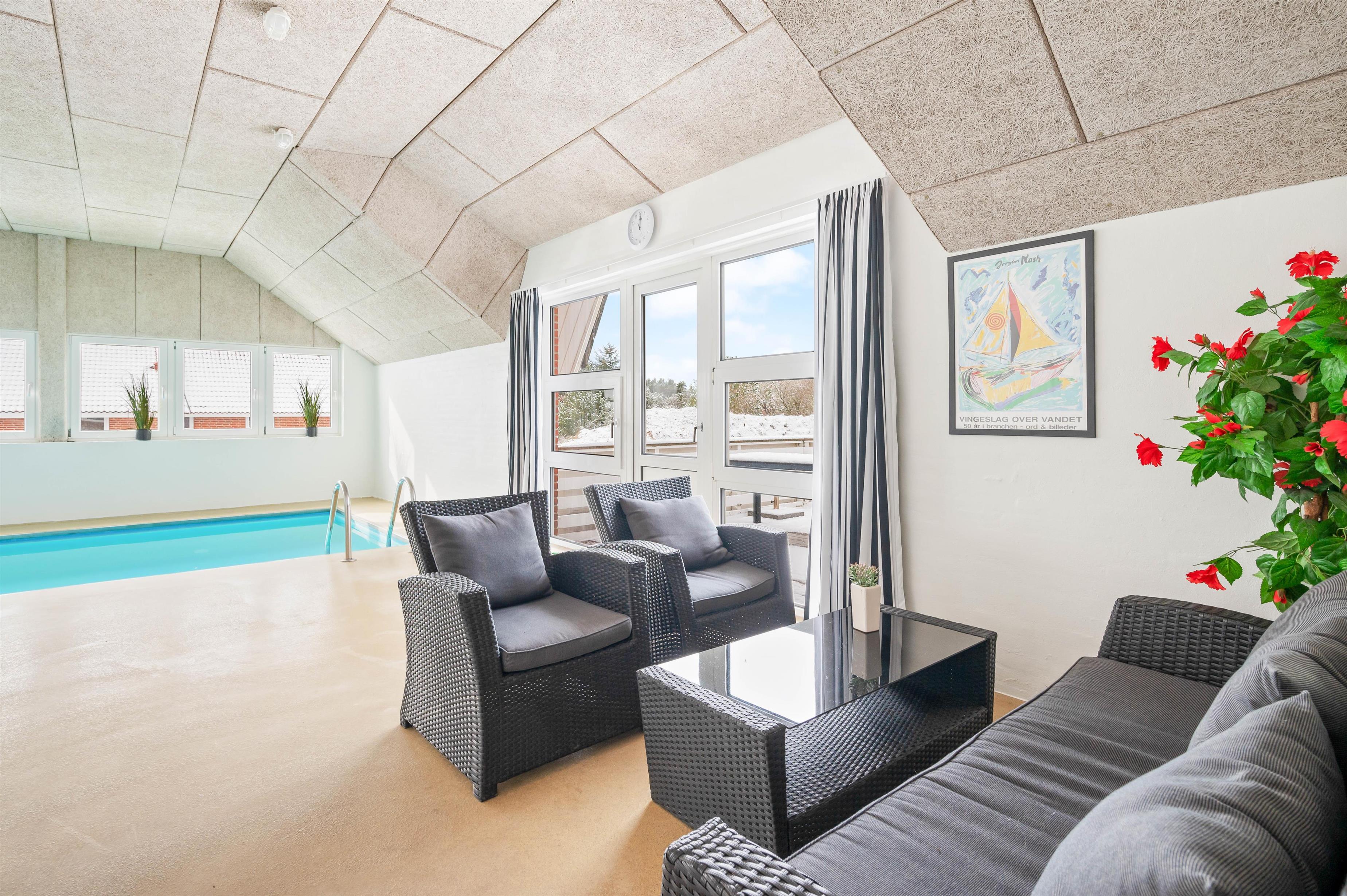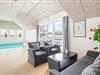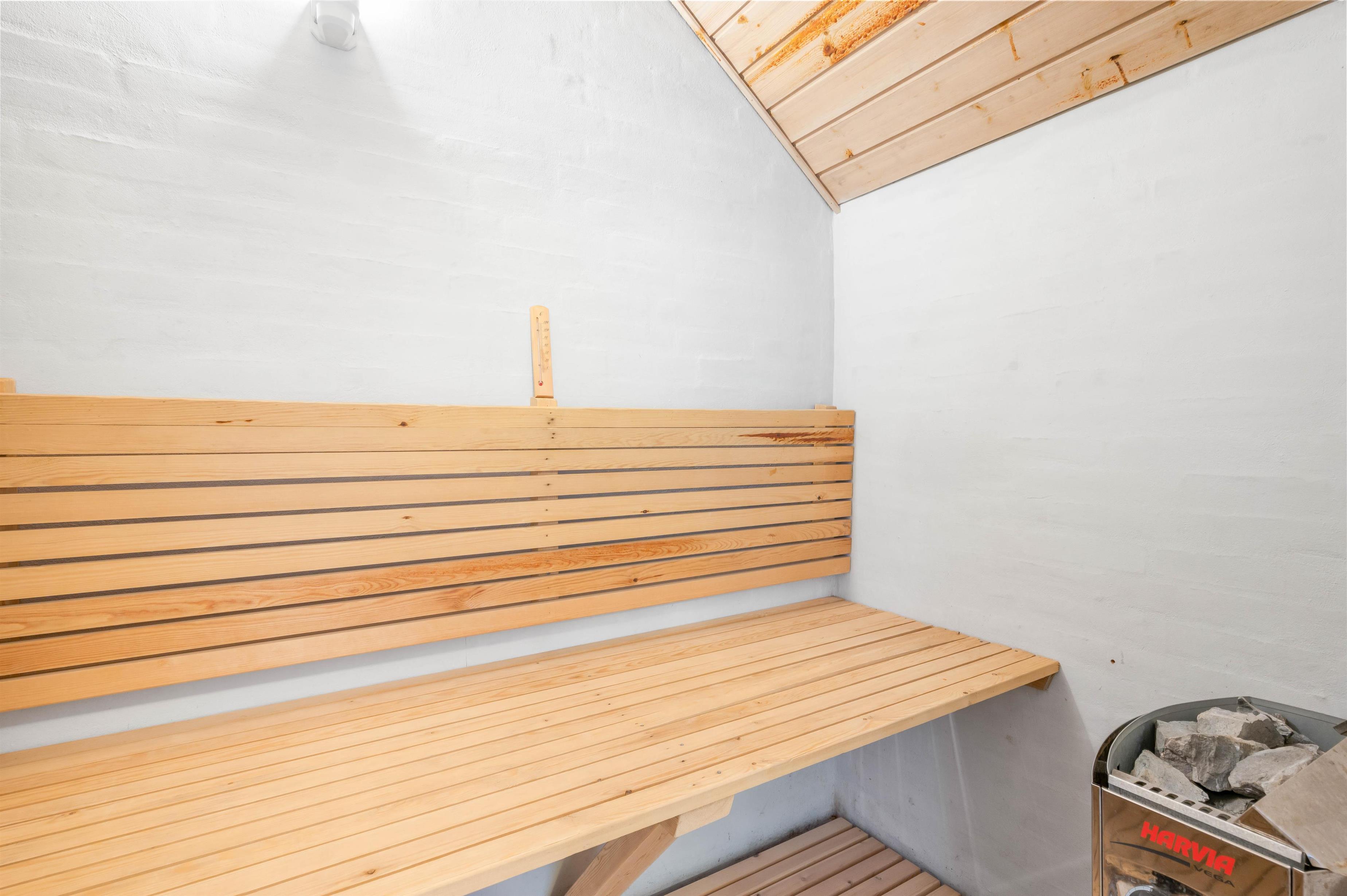 I poolafdelingen findes det ene af husets badeværelser, så man hurtigt kan komme under bruseren. Og herfra er der også adgang til husets sauna, der også har en afstressende effekt på både krop og sjæl. Der er desuden lavet en lille møbleret hyggekrog ved swimmingpoolen, så de voksne kan sidde tørt og godt og holde øje med børnene, men de leger i poolen.