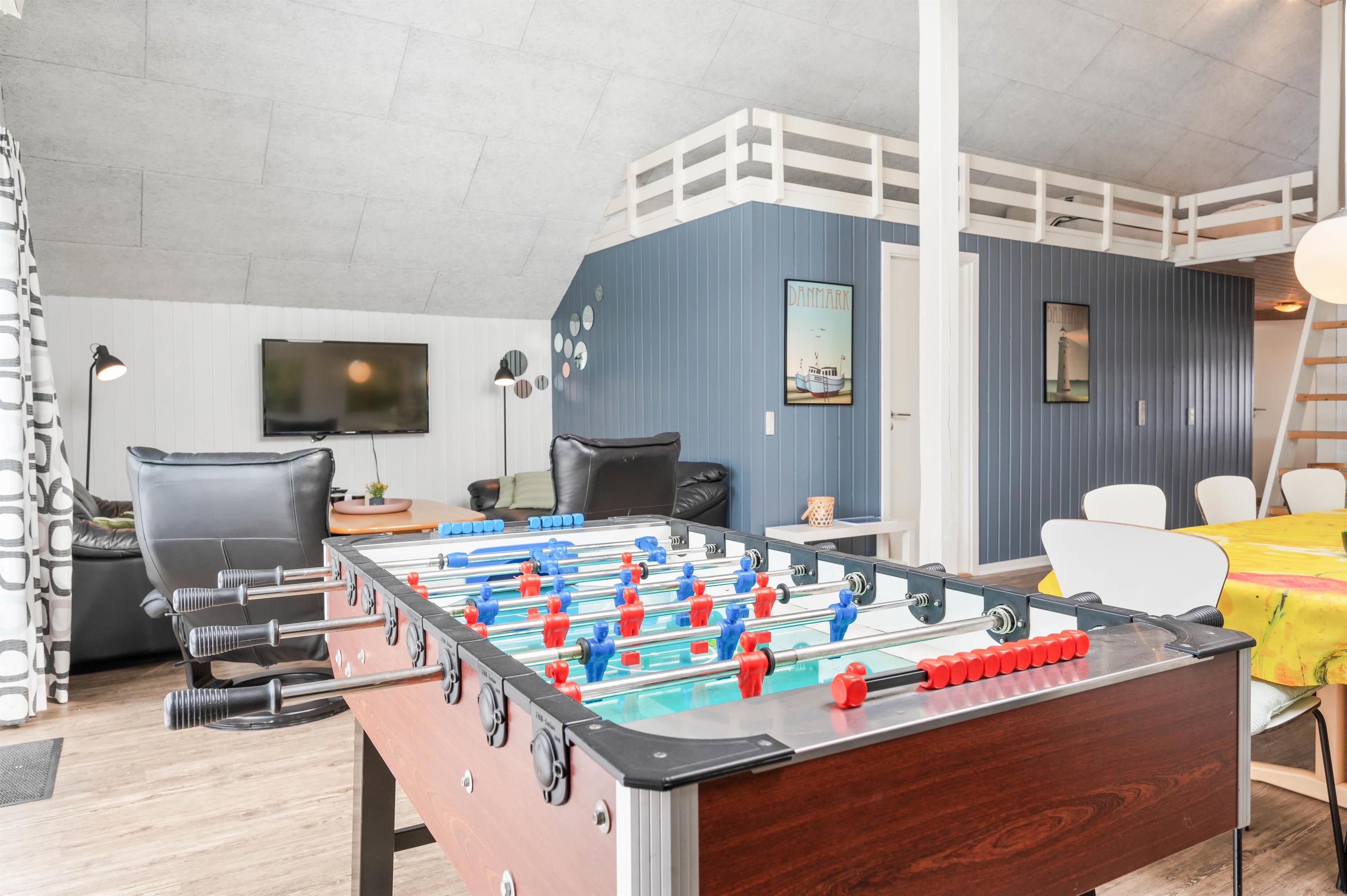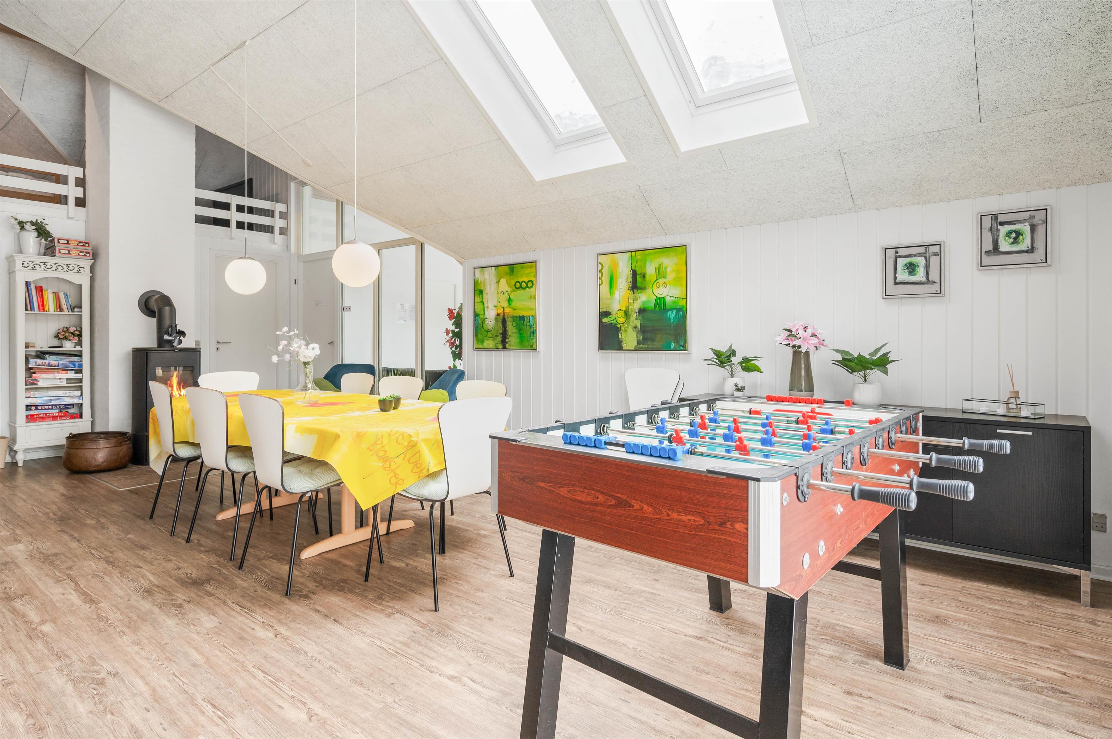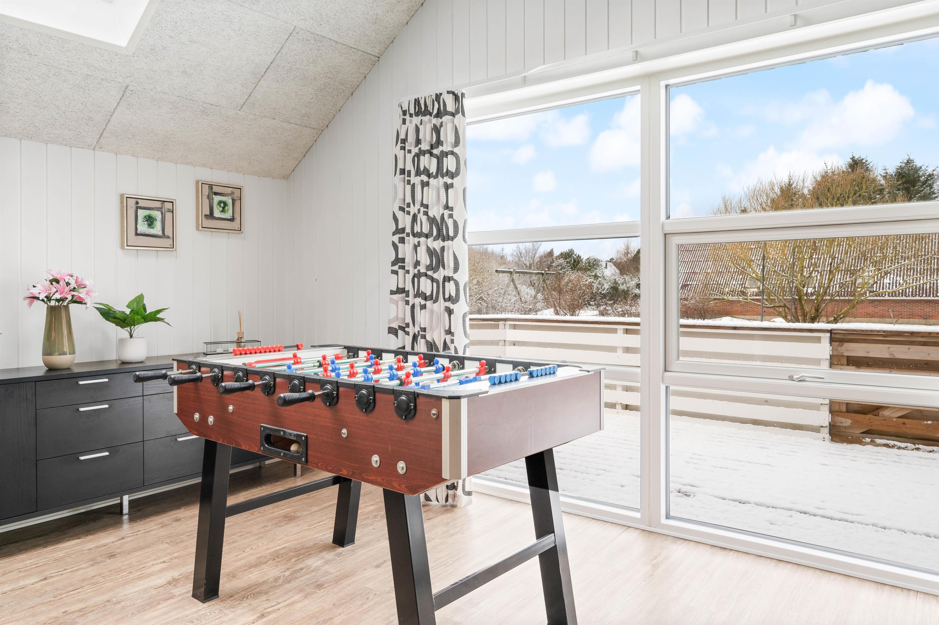 Velholdt sommerhus med dejlig afskærmet terrasse på en stor naturgrund. Huset egner sig især til aktive familier, da det er udstyret med både swimmingpool og bordfodbold – så her kan hele familien dyste mod hinanden i sjove aktiviteter.