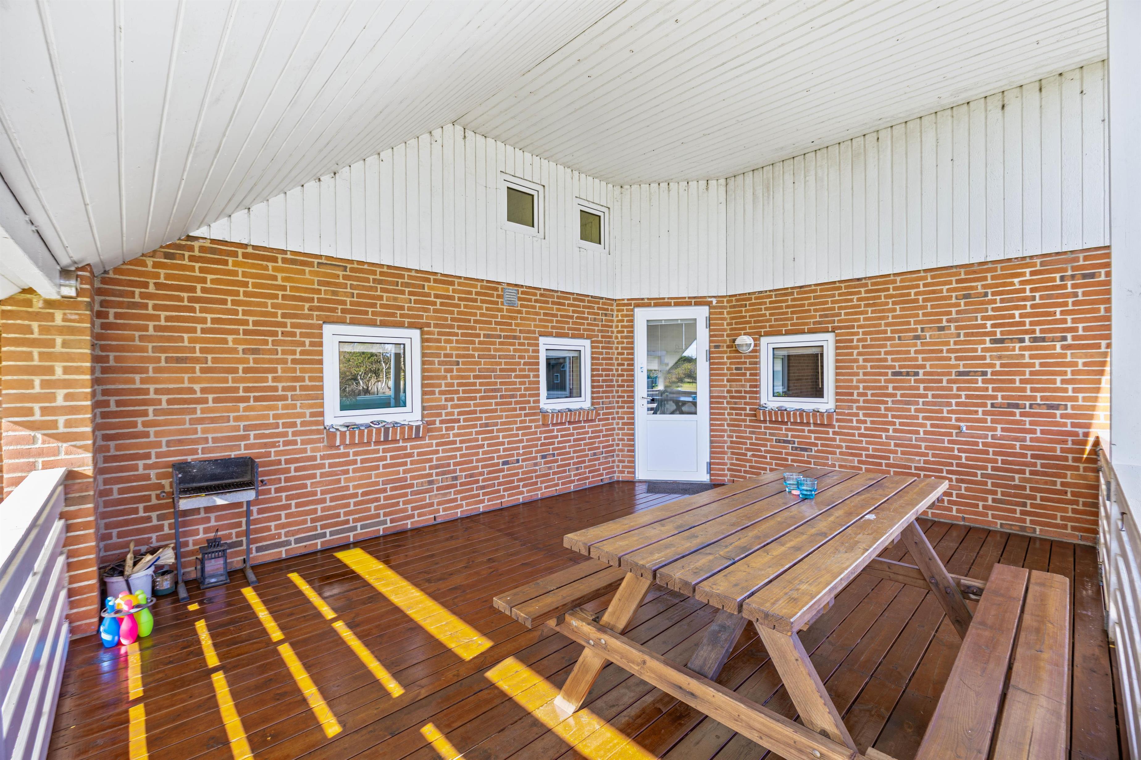 Sommerhuset har to gode terrasser, så det næsten altid er mulig at sidde ude. Dene ene er overdækket og derfor særdeles god til hyggelige grillaftener, hvor man kan sidde i både læ og tørvejr. På den vestlige side af huset er terrassen afskærmet. Herfra er der god udsigt over naturgrunden. For de mindre børn er der desuden opstillet gynge og sandkasse. I det tilhørende skur til sommerhuset finder I desuden en ekstra fryser, som I selv kan sætte til.