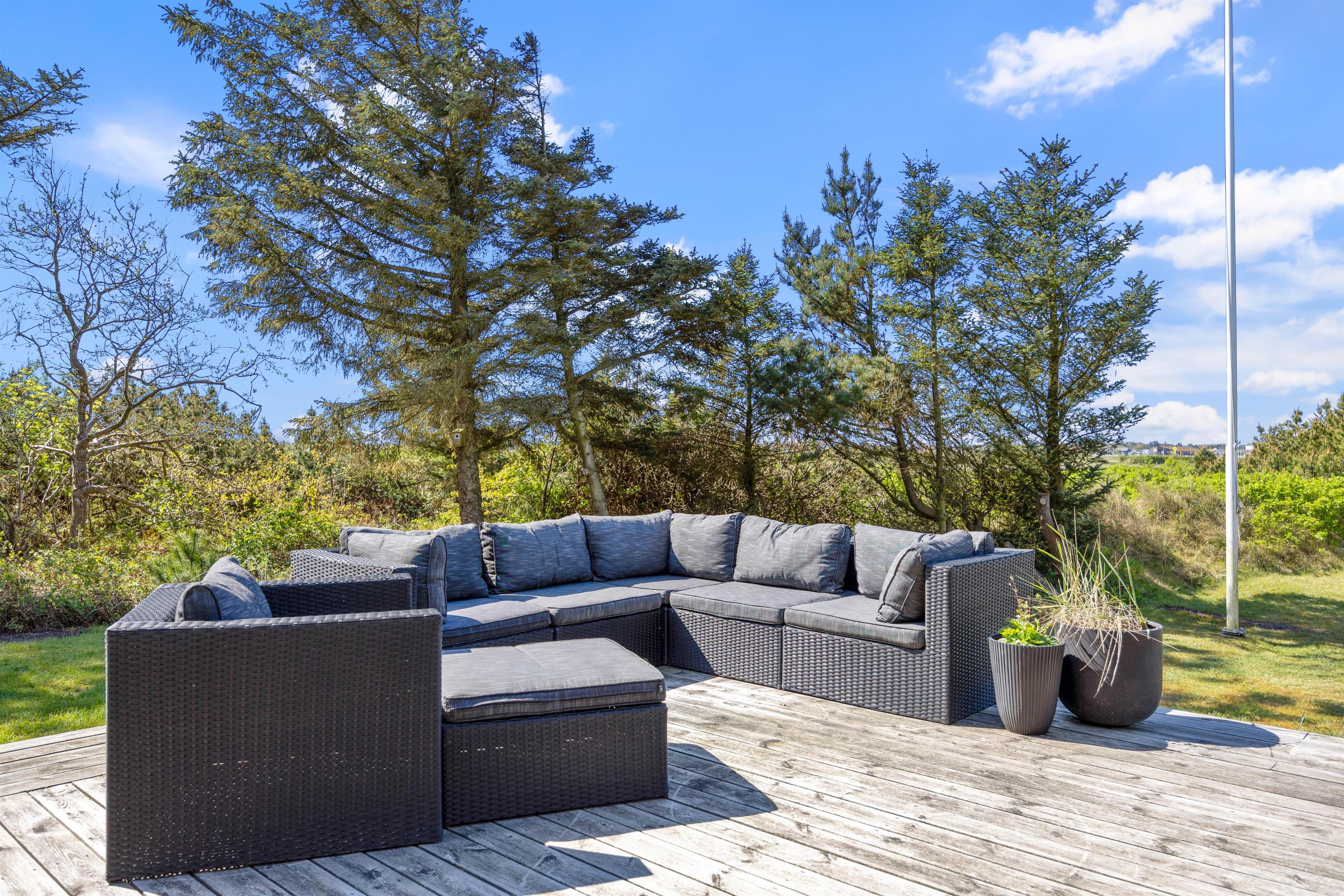 Feriehuset imponerer lige så meget ude, som det gør inde. Med direkte udgang fra stuen, har I adgang til en dejlig stor træterrasse, hvor I tilmed vil opleve en masse ro og en skøn udsigt. Her på terrassen har I også mulighed for at tilbringe en masse god tid, da det naturligvis er med havemøbler og solvogne. De dejlige sommerdag kan eventuelt afsluttes med et festmåltid tilberedt ved hjælp af husets gasgrill.