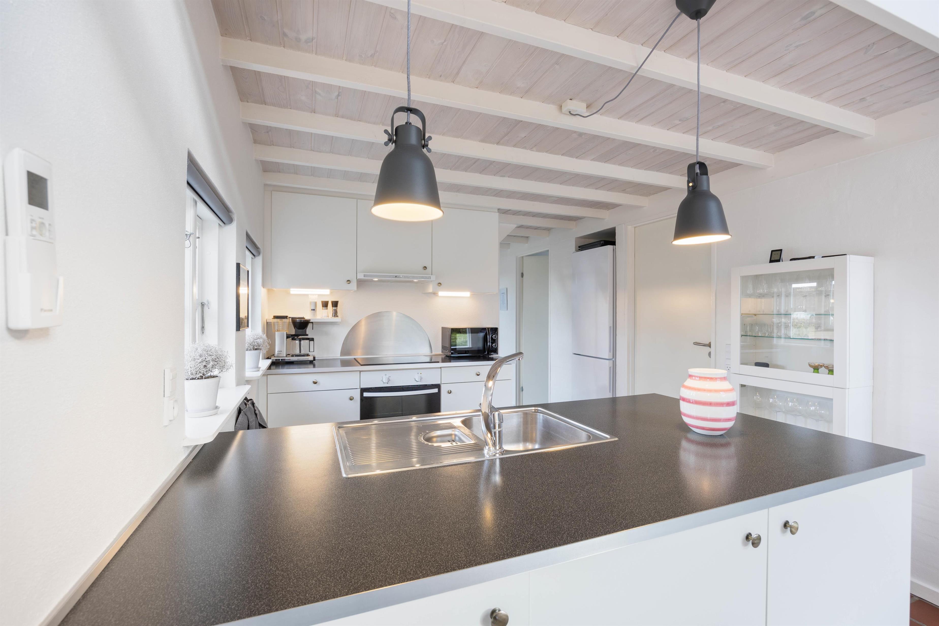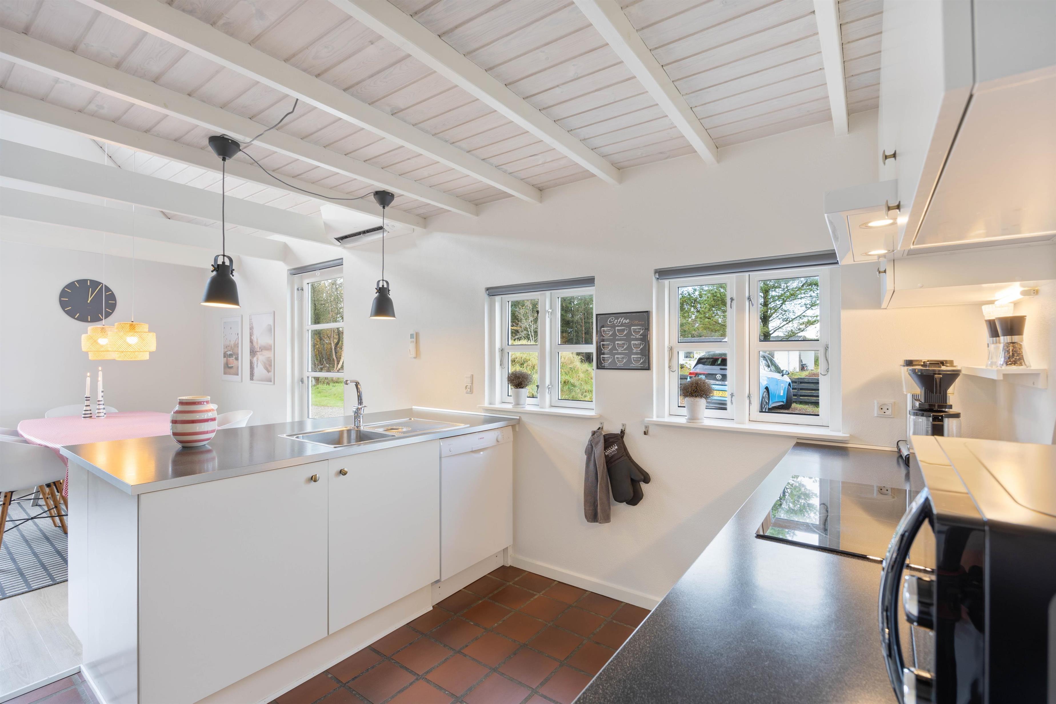 Indenfor på Hybenvej 16 bliver I mødt af en lys og venlig indretning med både loftsbjælker og hvide træpaneler, hvor loftet er ført op til kip, hvilket bidrager til en god rumfornemmelse. De store vinduespartier bidrager til et skønt lysindfald og en god rumfornemmelse, hvor I helt sikkert hurtigt vil føle jer hjemme med det samme. Det lyse og funktionelle køkken er i åben forbindelse med spise-/opholdsstuen, der har både brændeovn og varmepumpe. Brændeovnen sørger for ægte sommerhusstemning og varmepumpen samt gulvvarmen i klinkerne sørger for et behageligt indeklima.