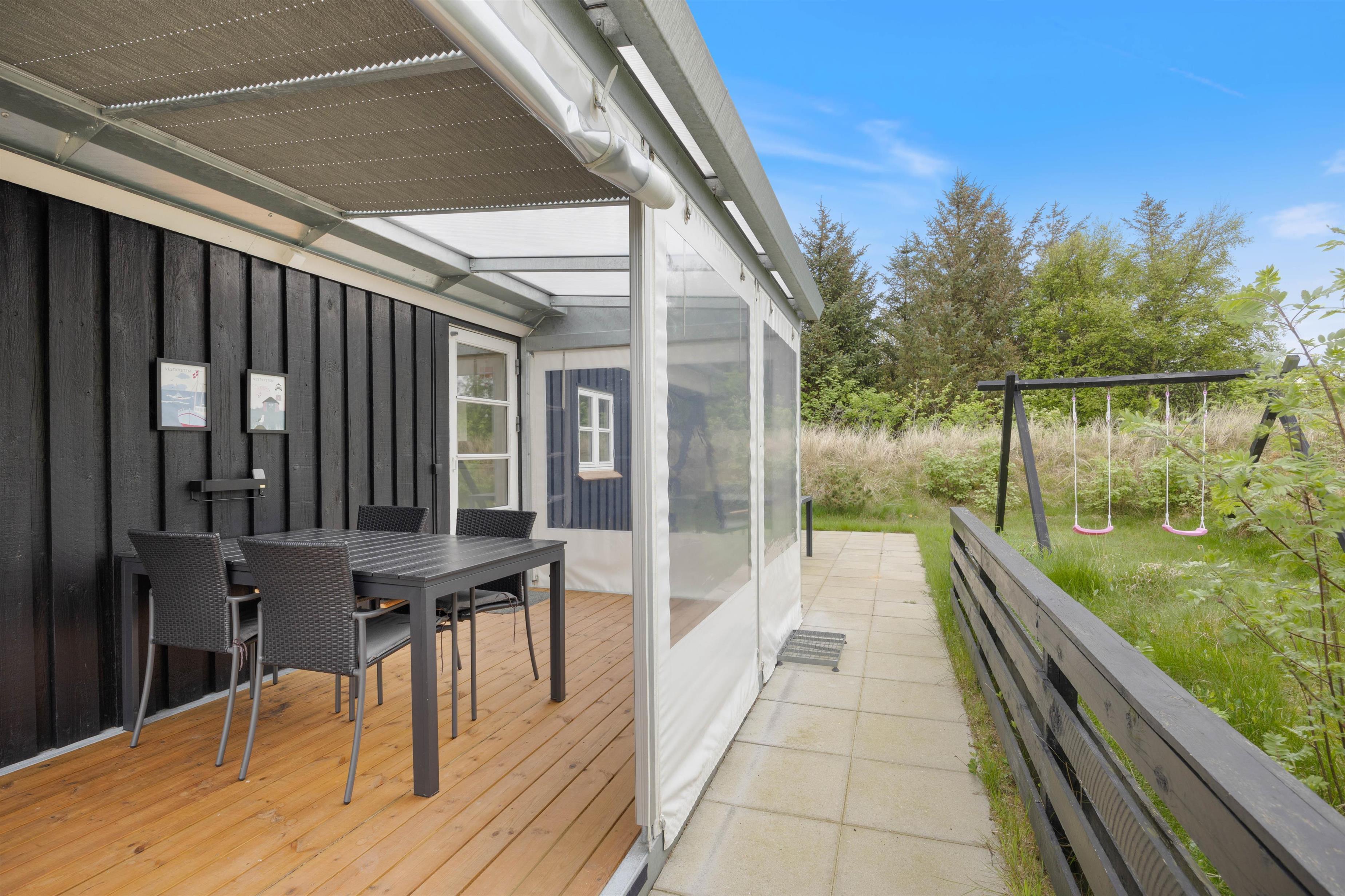 Sommerhuset ligger på en 2132 m2 stor fredfyldt naturgrund. For de mindste i familien vil gyngestativet uden tvivl være et stort hit. I mellemtiden kan de voksne sidde på terrassen, der til dels er overdækket, og her kan de tilberede et dejligt måltid mad over grillen, mens de nyder en kølig drink eller en kop varm kaffe.