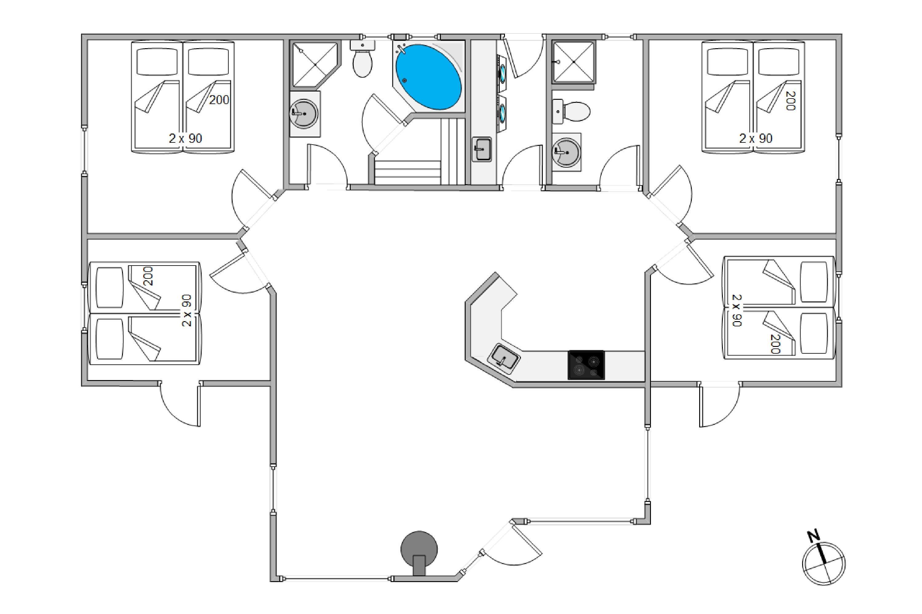 Feriehuset byder på fire rummelige soveværelser med dobbeltsenge, ideelt til familier eller grupper på op til otte personer. Med to moderne badeværelser, begge med brusenicher og behagelig gulvvarme, får alle gæster optimale rammer for komfort og velvære under opholdet.