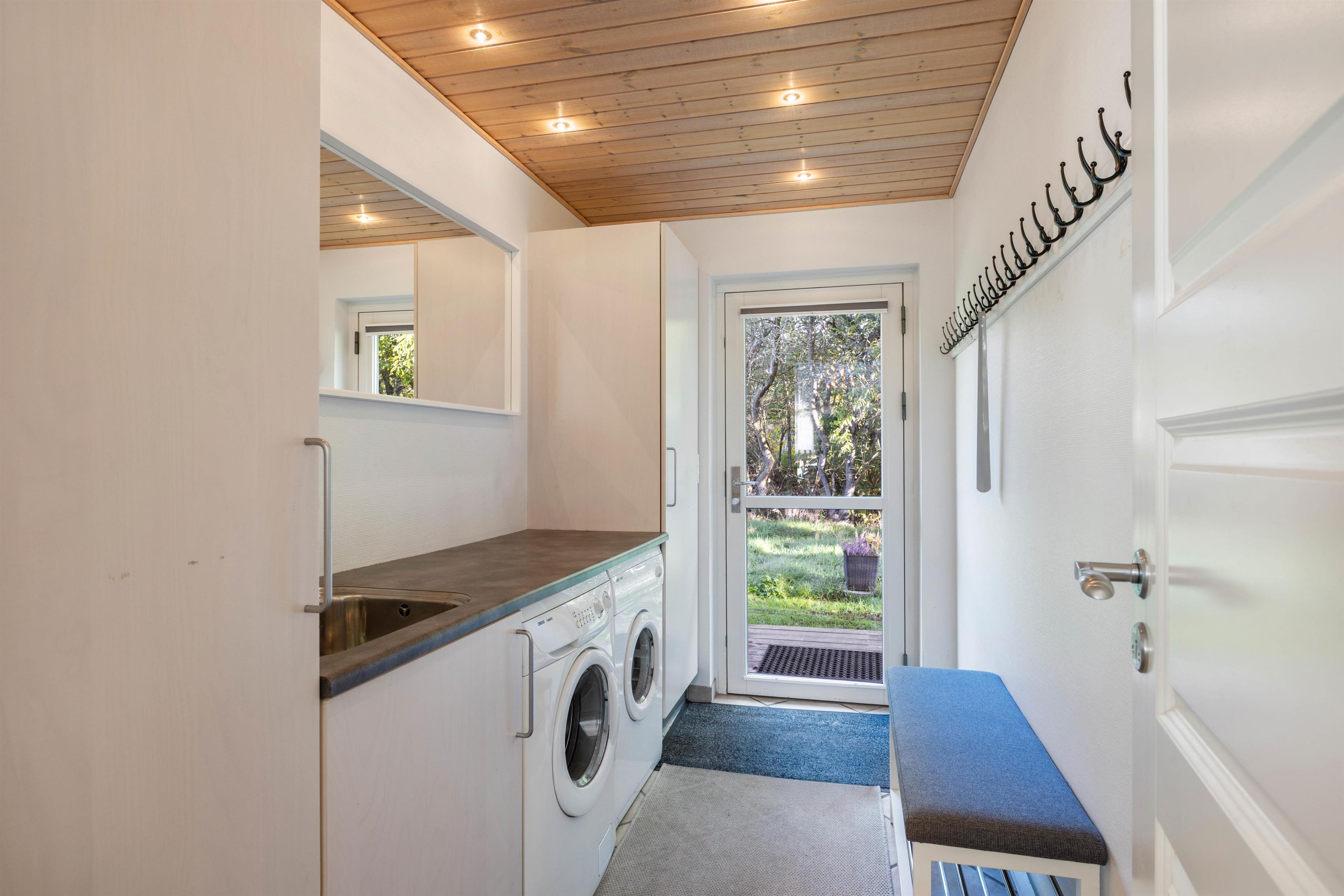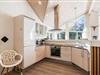 Det lyse og åbne opholdsrum er husets hjerte og samlingspunkt. Brændeovnen kan ses og nydes både fra spiseområdet, i sofaerne og fra det åbne samtalekøkken. Køkkenet er stort, veludstyret og har naturligvis opvaskemaskine.