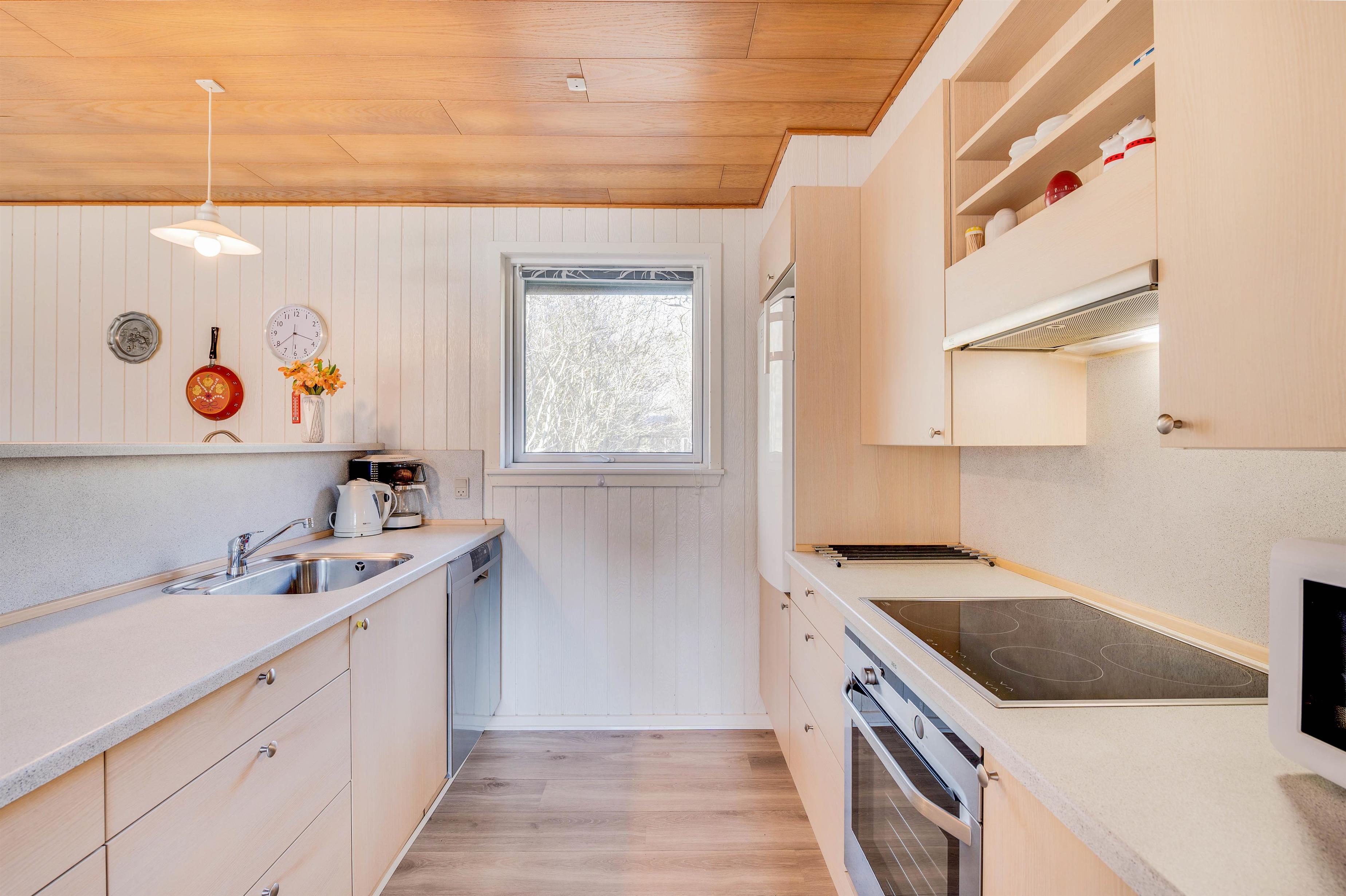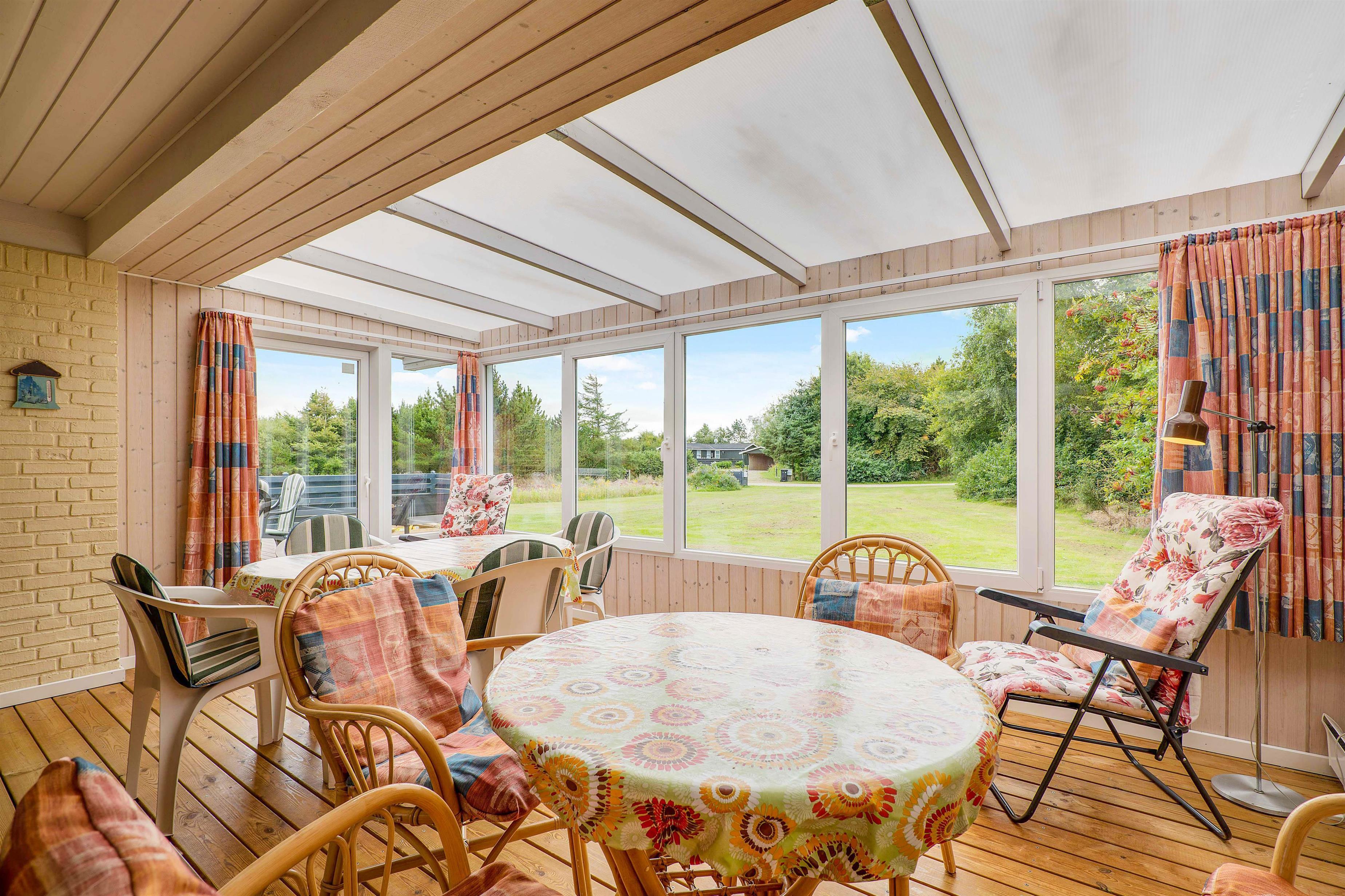 Det charmerende sommerhus i Lodbjerg Hede er indbegrebet af hyggelig sommerhusstemning. Her kan I slappe af i de bløde sofaer, der kalder på at blive indtaget til boglæsning eller en lille lur. Sofagruppen har direkte udsyn til den hyggelige udestue, der er ideel til at nyde morgenens første kop kaffe.