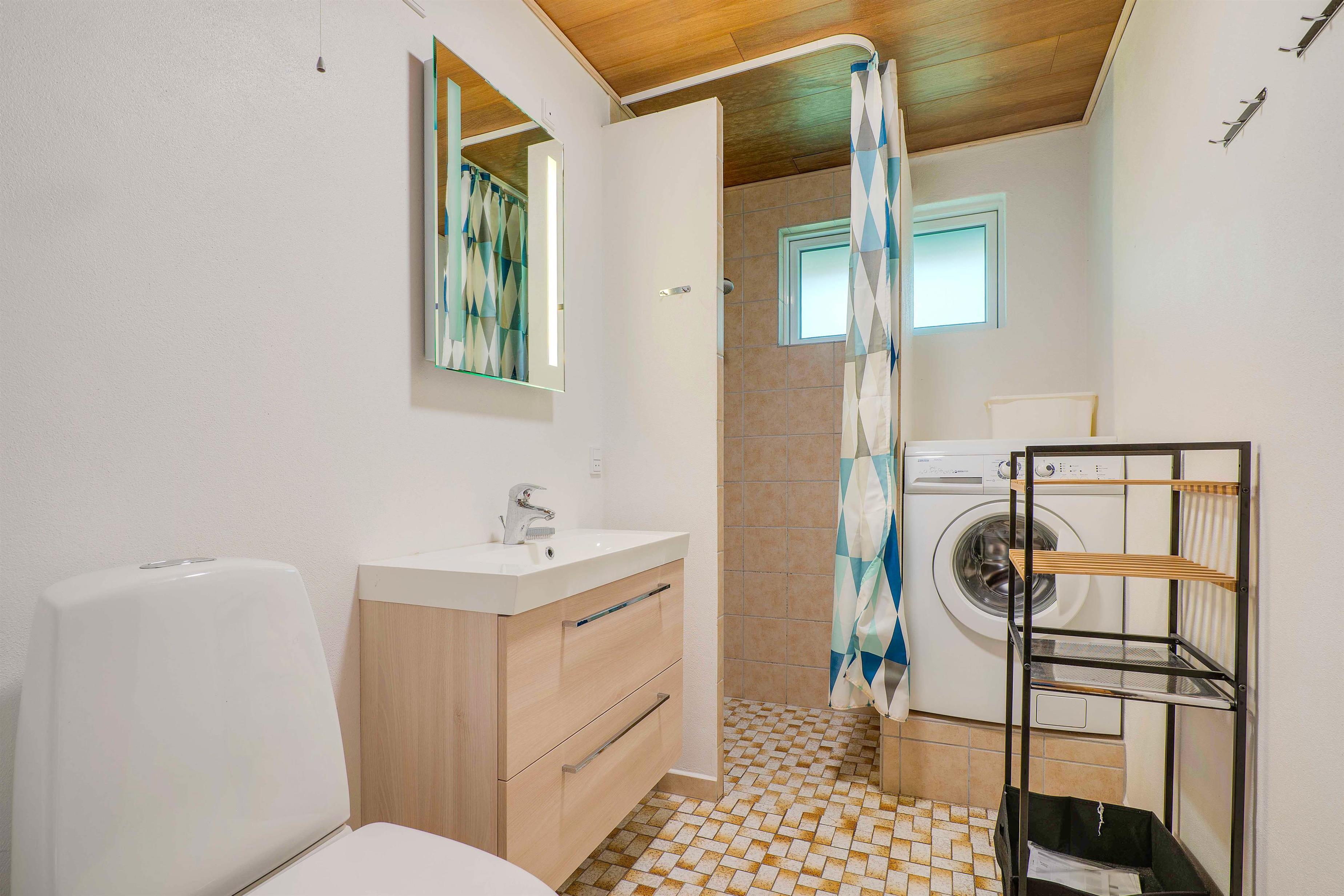 Der er masser af plads til børnenes udfoldelsesmuligheder i sommerhuset på Tambjergvej – både indenfor, men i særdeleshed også udenfor på den store grund. Her har familiens yngste mulighed for at lege i sandkassen, der er praktisk afskærmet. På den måde er børnene i ly for den værste vind.