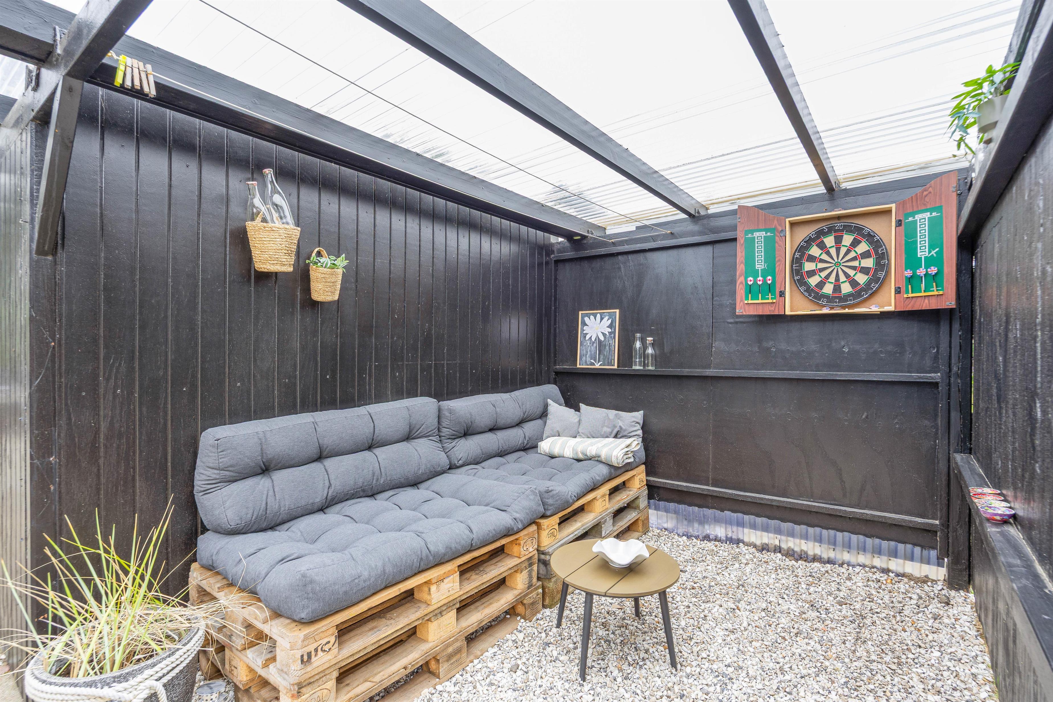 I indkørslen er der desuden lavet en lille hyggelig lounge, hvor man kan sidde ude og nyde den friske danske natur. Selv hvis det skulle regne, kan I forblive i tørvejr, mens I samtidig kan spille et spil dart.