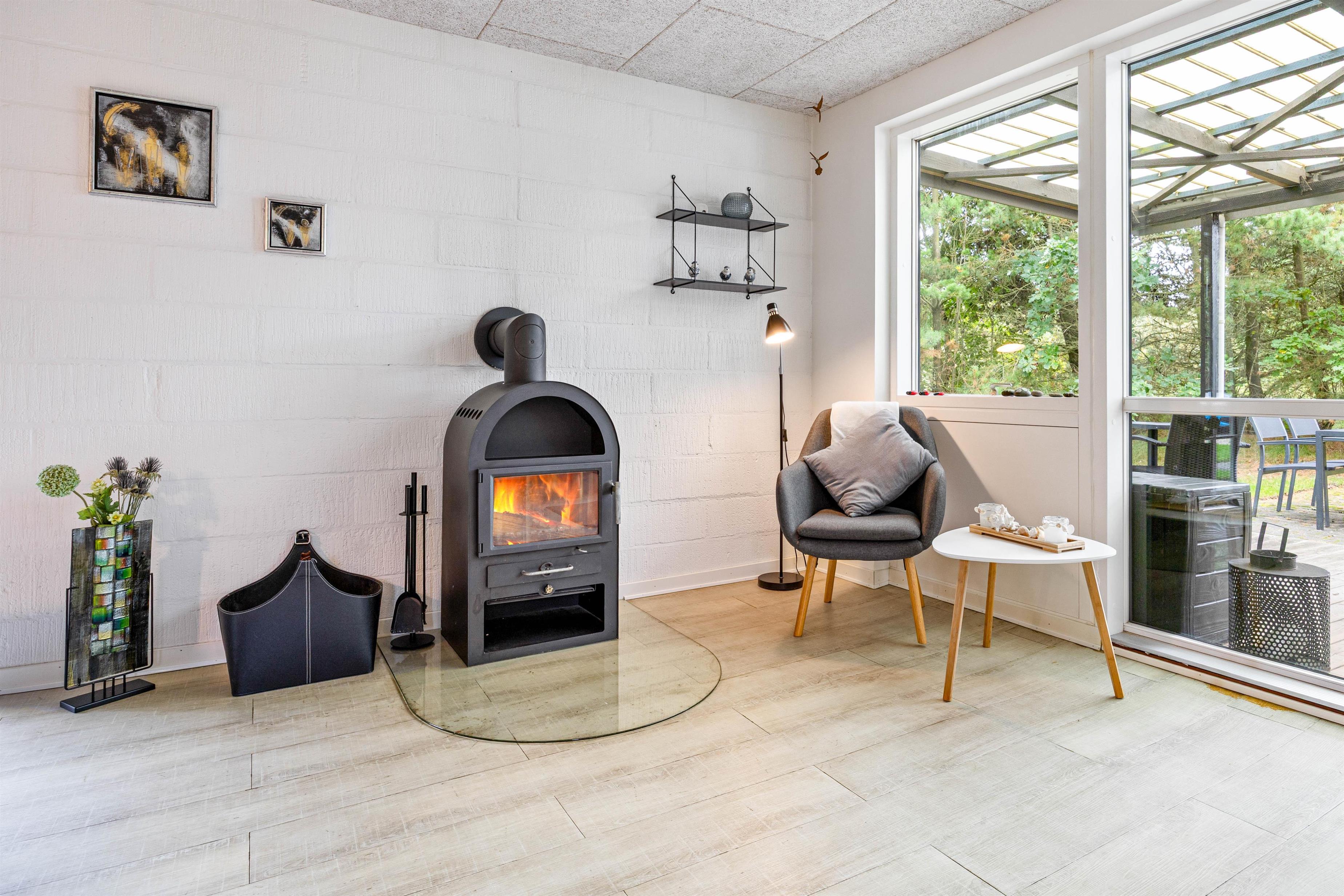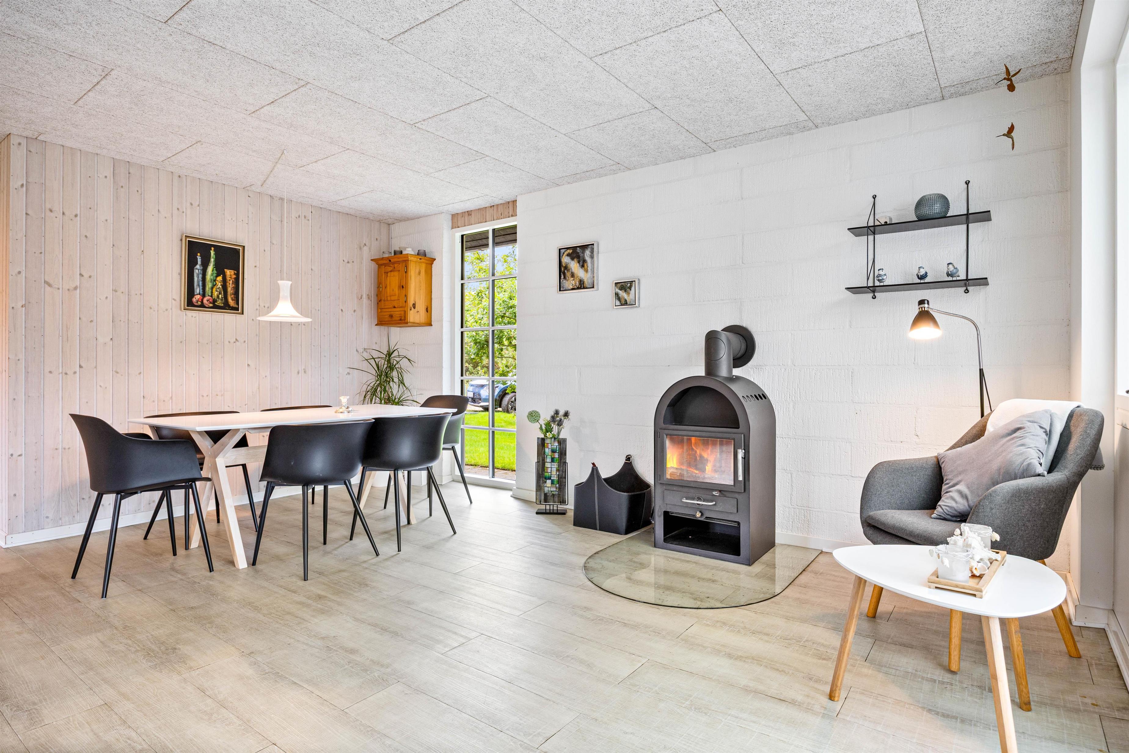 Små pyntedetaljer og en brændeovn skaber en venlig og hyggelig atmosfære, og de store vinduer i stuen giver jer et flot udsyn over Lodbjerg Hedes grønne natur og et dejligt lysindfald i stuen. I alt findes der 3 soveværelser og børnene vælger bestemt køjesengene (70x190) til deres eget imperium.