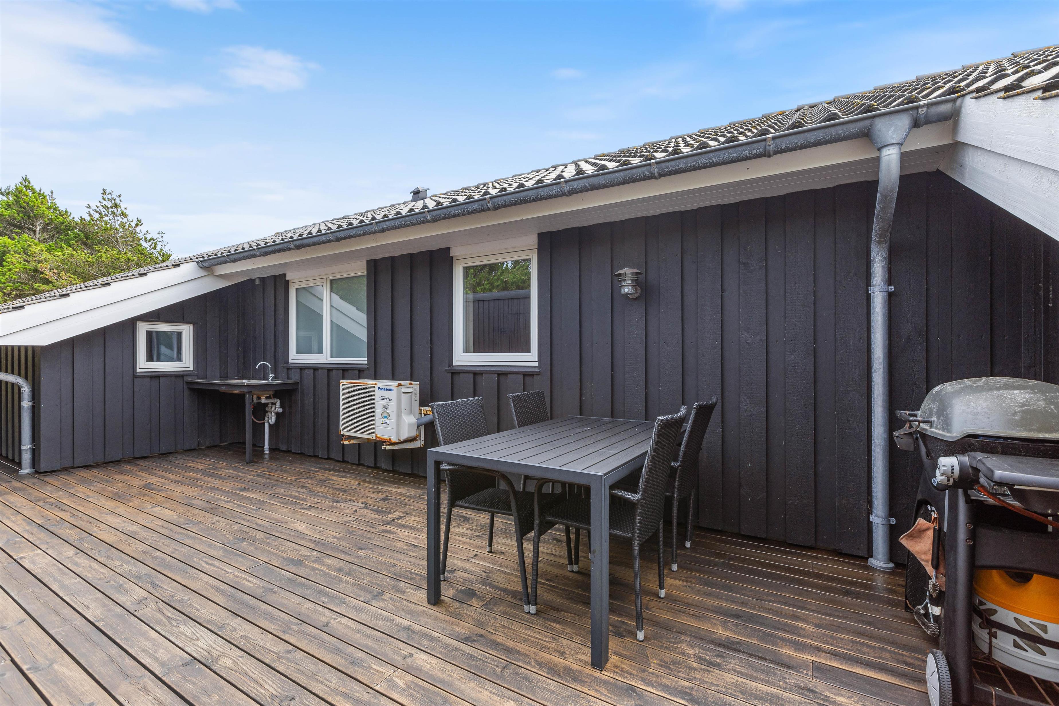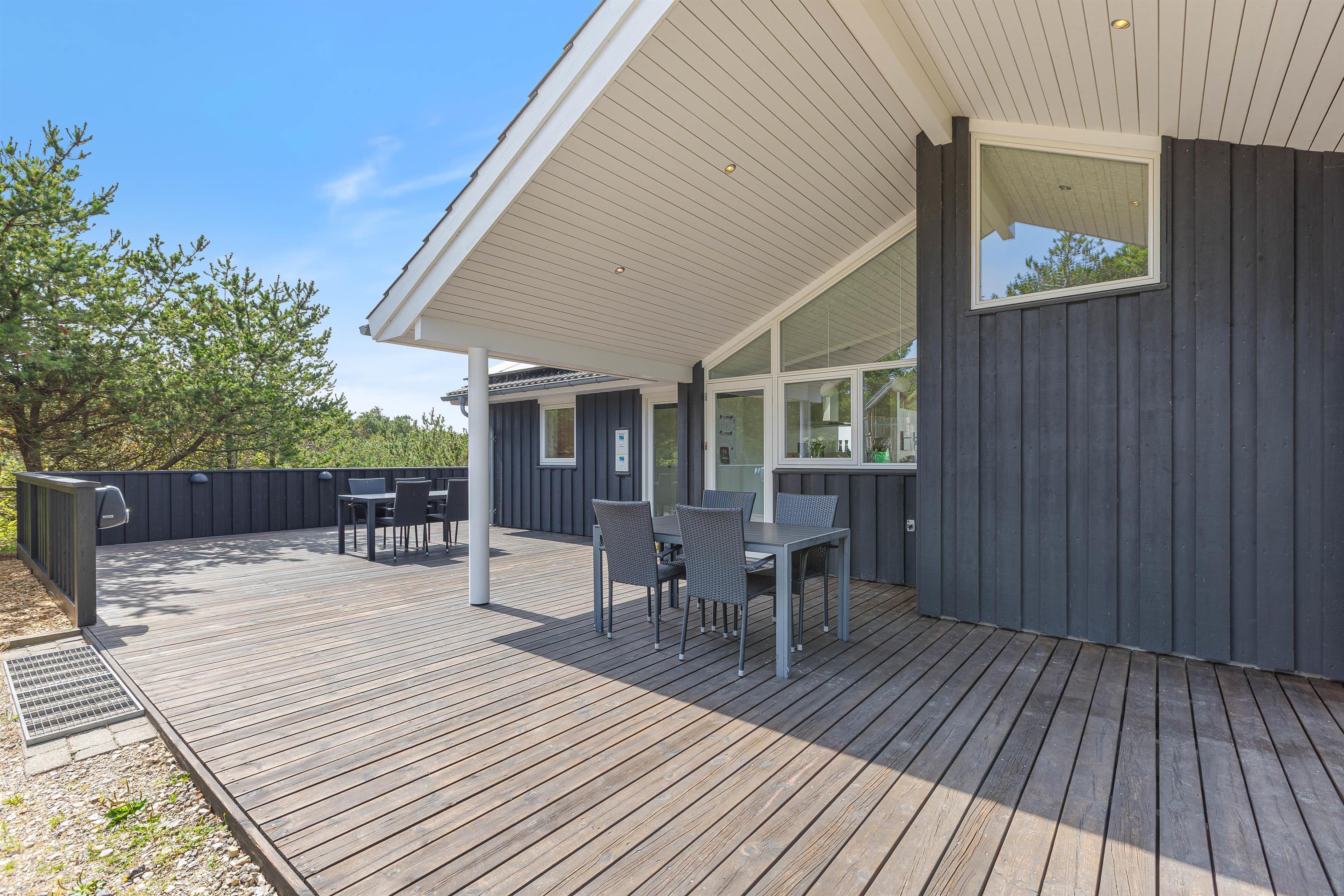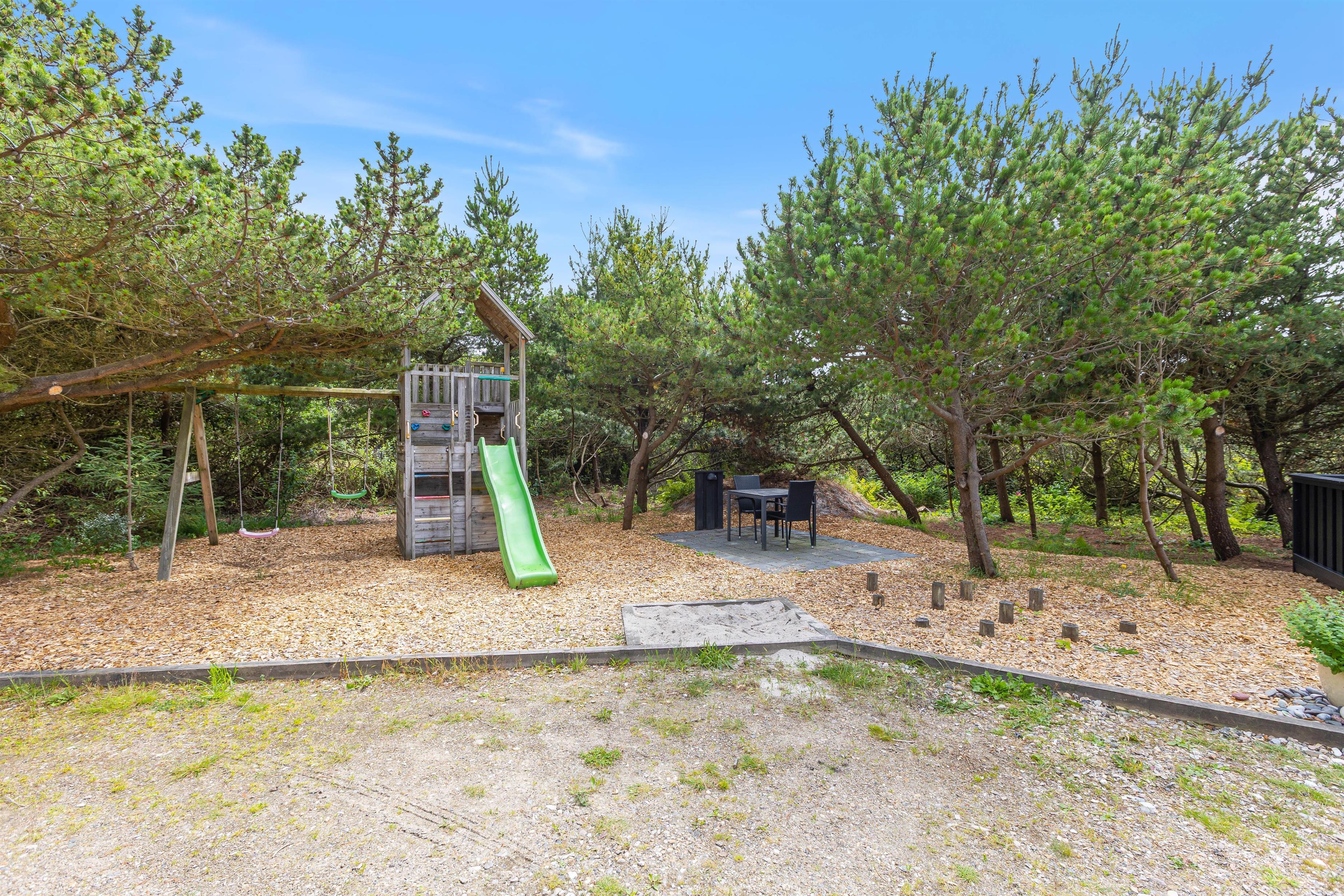 Naturgrunden, som huset er placeret på, er beskyttet af træer mod syd, som giver masser af læ og privatliv på terrasserne. Den meget store terrasse går hele vejen rundt om huset. Mod øst er der en delvist afskærmet terrasse – perfekt på dage med blæsevejr og helt ideelt til morgenkaffen. Mod vest er terrassen lukket og yderst mod vest er den endvidere sænket, så solelskere vil elske den. Har man mindre børn med, vil de elske legetårnet og sandkassen, som er placeret øst for huset. Vesterhavet er kun ca. 20 minutters gang fra feriehuset og den hyggelige badeby Søndervig er kun 5 minutter væk i bil.