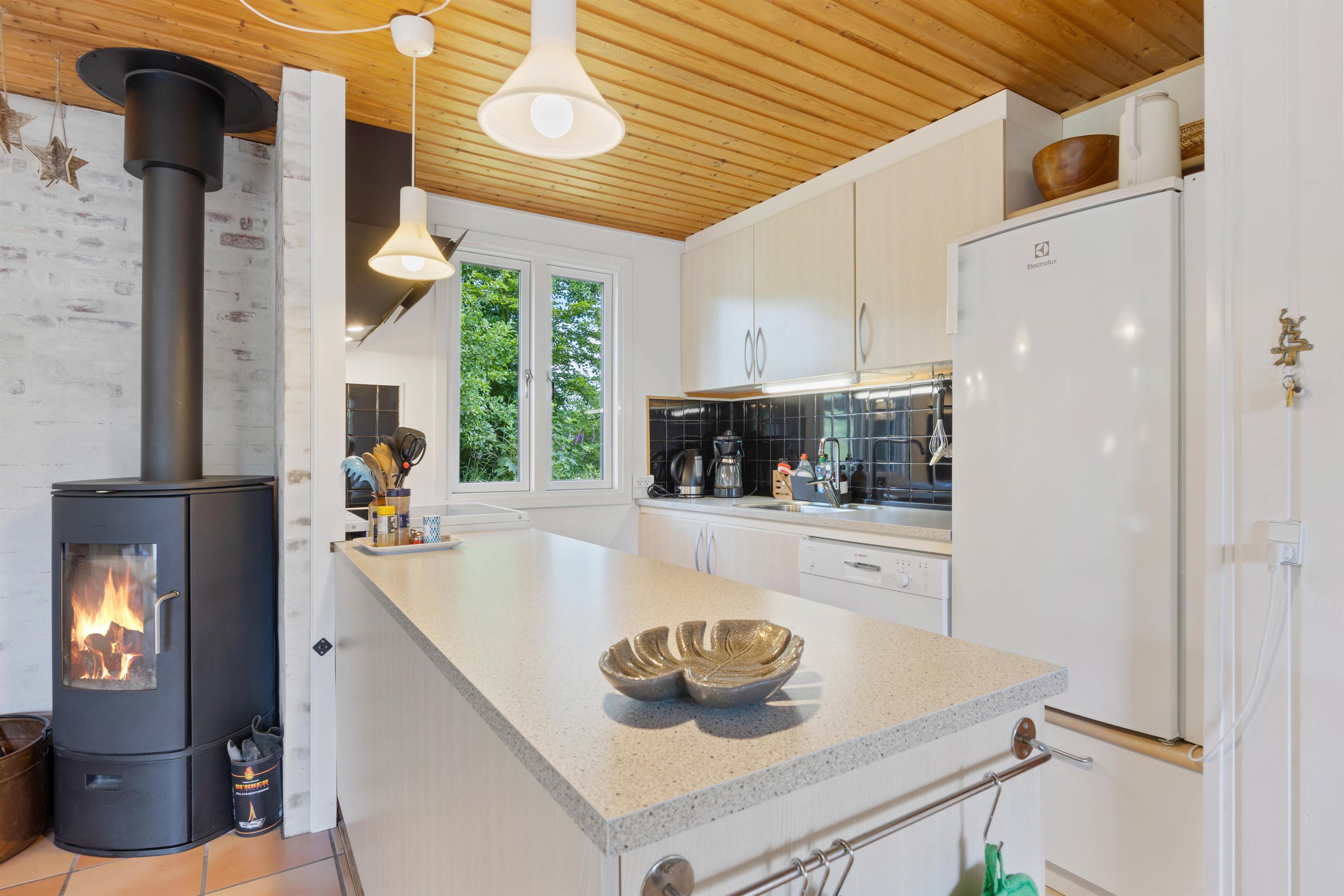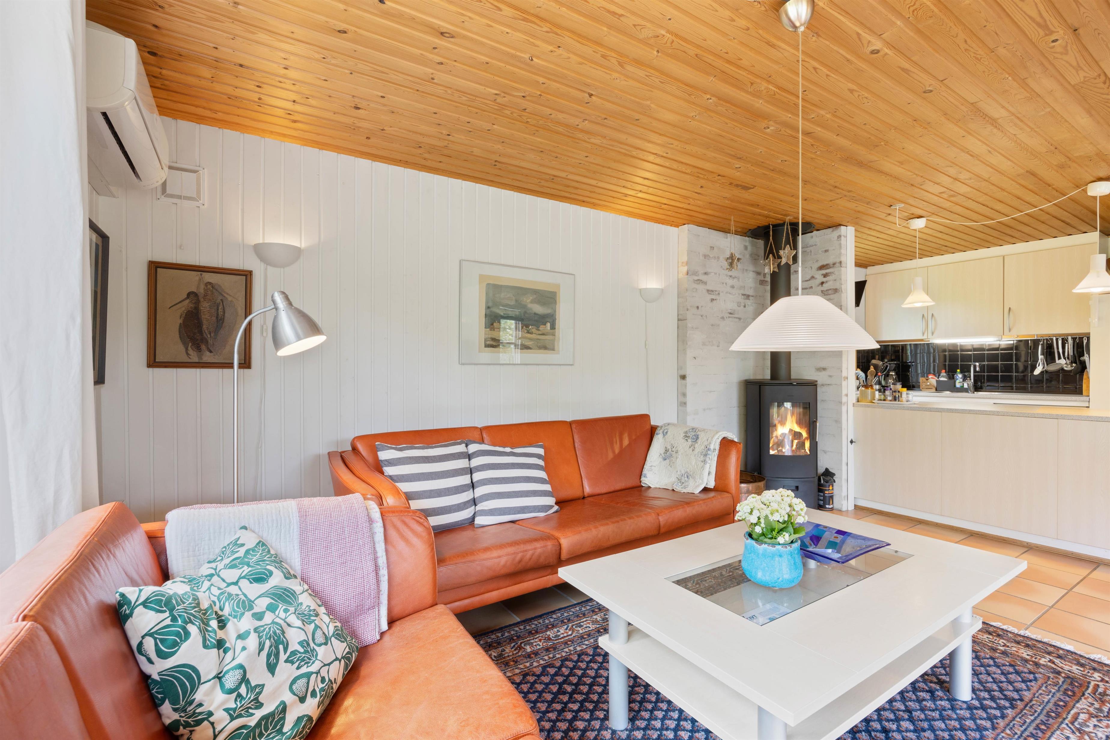 Det dejlige opholdsrum er det naturlige midtpunkt i huset. Her kan I samles omkring madlavningen i det praktiske køkken eller se en film på fladskærmen i stueafdelingen. Og I skal ikke slås om pladserne. Med både sofaer og lænestole er der rigeligt med siddepladser, hvor alle kan slå sig ned og slappe af.