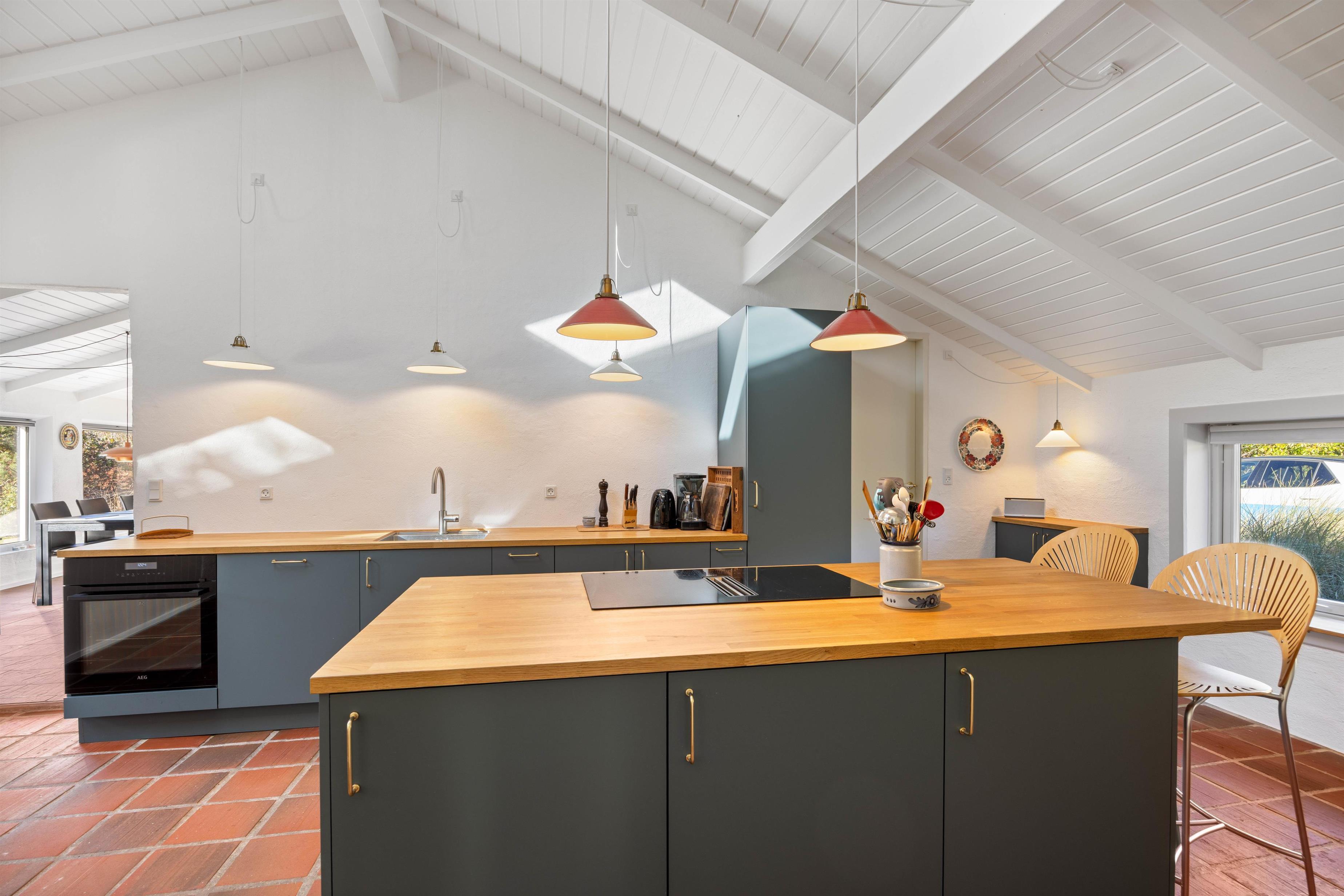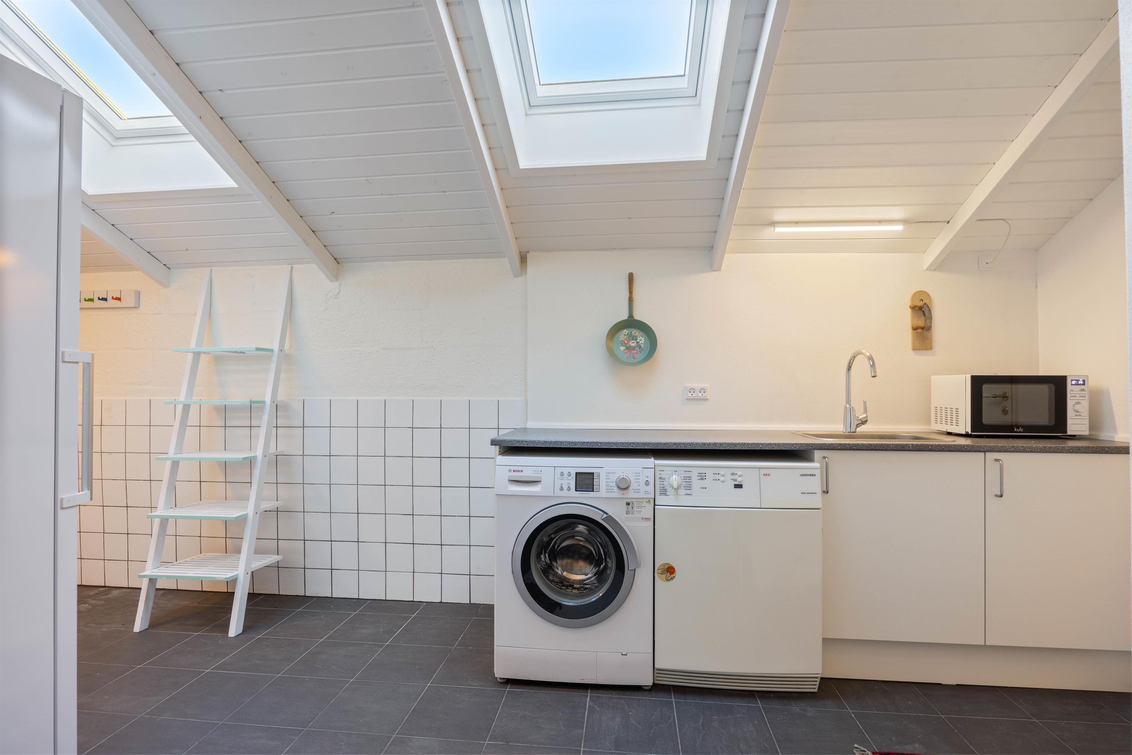 Et højdepunkt i huset er det moderne køkkenalrum, hvor det originale og det moderne smukt er kombineret. De oprindelige klinker er bevaret i det stilfulde køkken, hvilket skaber en unik og charmerende atmosfære, mens ovenlysvinduerne sørger for et dejligt og naturligt lysindfald. Køkkenet er udstyret med en stor separat fryser på 180 liter samt en opvaskemaskine. I bryggerset finder du både vaskemaskine og tørretumbler, hvilket gør det nemt at opbevare og rengøre alle fornødenheder under opholdet.
