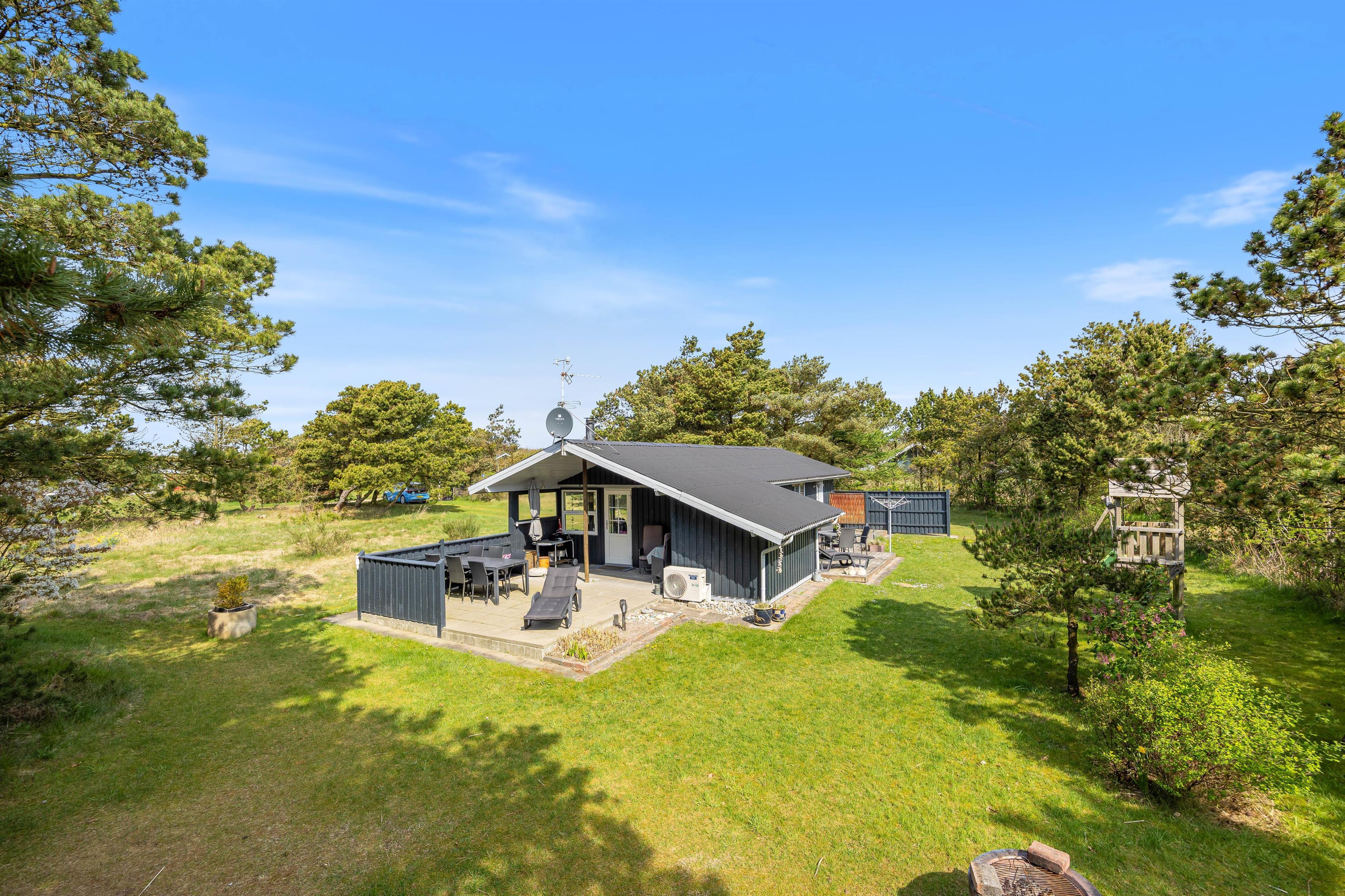 Til den ude-glade familie er dette feriehus ideelt. Fra den afskærmede og delvist overdækkede terrasse i forlængelse af stuen har I et godt udsyn over plænen, ungerne og den firbenede, mens de leger og tumler i legetårnet, i sandkassen og på gyngerne. Men lige så vel som der er lagt op til leg, er der også lagt op til bare at dase på en liggestol og nyde roen i og omkring dette hus, hvor man i sandhed kan få en følelse af at være sig selv. Her er både fodboldmål, legetårn og shelter i haven.