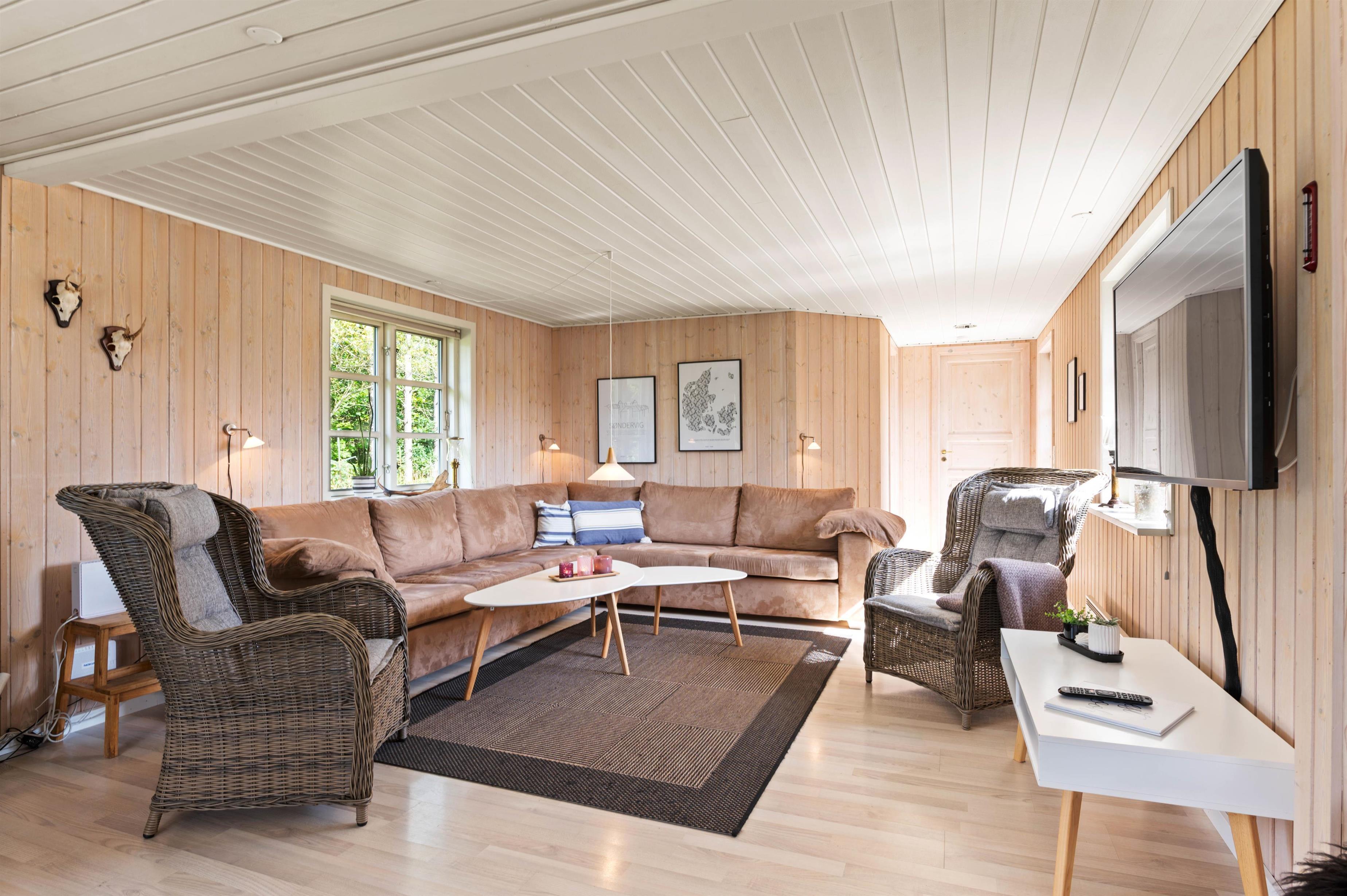 Feriehuset ligger på en stor naturgrund for enden af en rolig stikvej, og rundt om huset finder I 3 skønne terrasser, hvorfra I kan nyde de smukke omgivelser og den friske luft dagen lang. Den overdækkede og afskærmede terrasse fungerer næsten som udestue og giver jer både ly og læ i alle årets måneder. Rundt om havebordet kan I drikke en nybrygget kop kaffe, mens I holder øje med børnene, som leger på den store græsplæne med gyngestativ, sandkasse og fodboldmål.