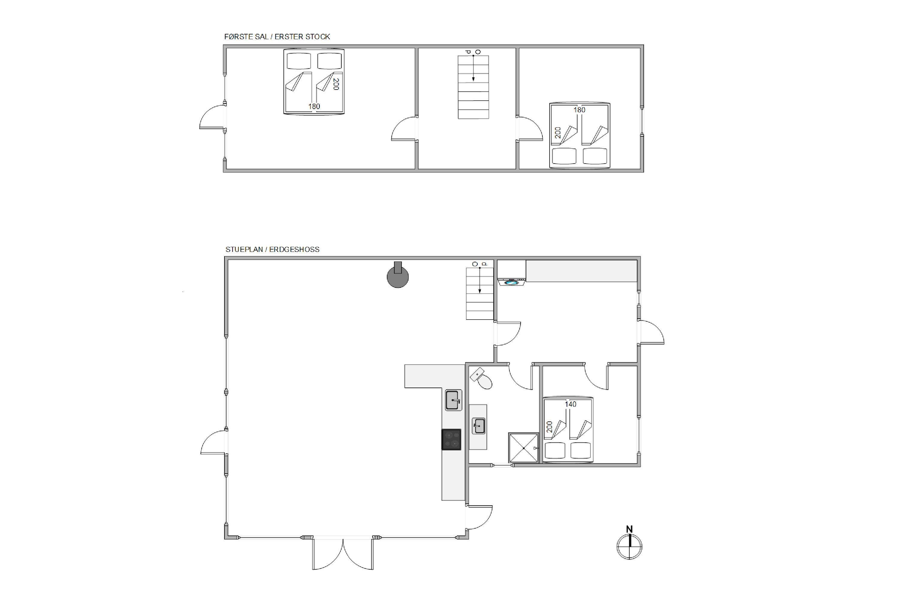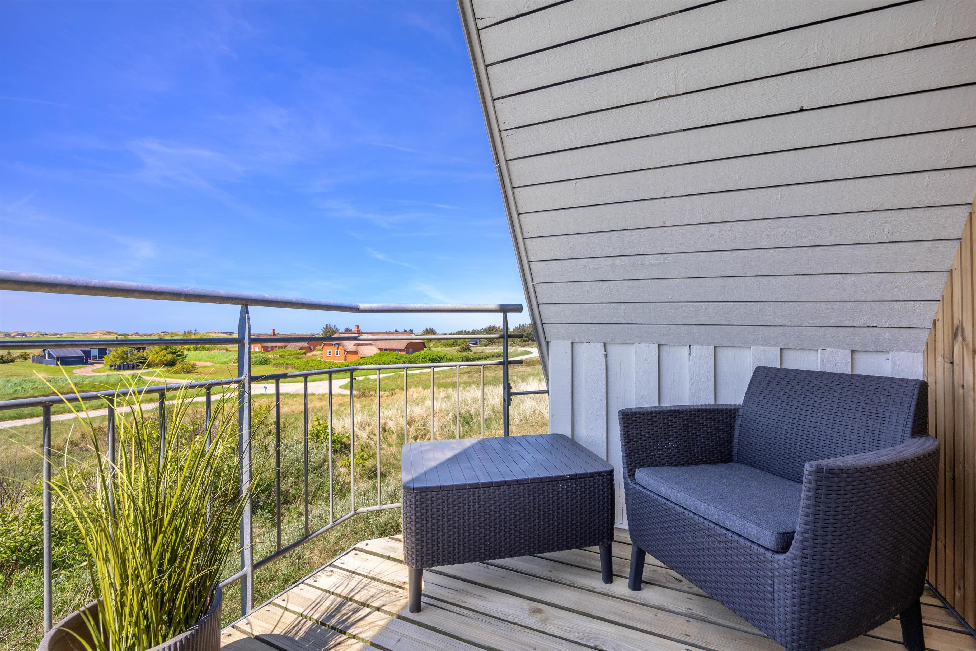 På første sal ligger de to resterende dobbeltsoveværelser. Soveværelset mod vest byder på et ekstra feriehighlight; herfra er der udgang til en altan, med en fantastisk udsigt over ferieområdet og helt til klitterne, hvor det brusende Vesterhav venter på den anden side.