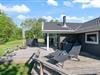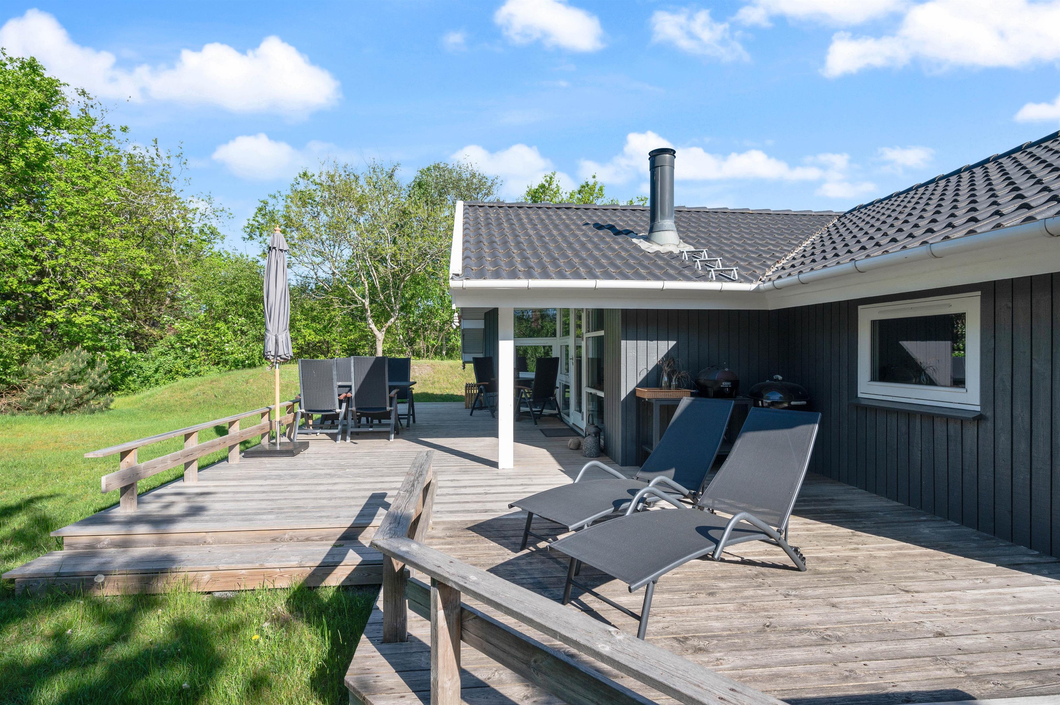 Fra sommerhusets terrasse har I et godt udsyn til legeområdet, således I kan holde børnene under opsyn, mens I selv opholder jer på terrassen. Terrassen består af flere små kroge, er delvist overdækket og bugter sig langs sommerhuset, så I kan flytte jer rundt i løbet af dagen, i takt med at solens placering ændrer sig. I kan med fordel benytte jer af udebruseren, hvis I trænger til at blive kølet lidt ned. Udebruseren kan tages i brug fra april til november måned. På terrassen er der gode havemøbler og behagelige liggestole til rådighed, og det er derfor oplagt at slå benene op og nyde solens stråler eller læse en god bog i disse skønne omgivelser. Når aftenen så småt går på hæld, kan I tilberede jeres aftensmad på grillen og nyde hinandens gode samvær.