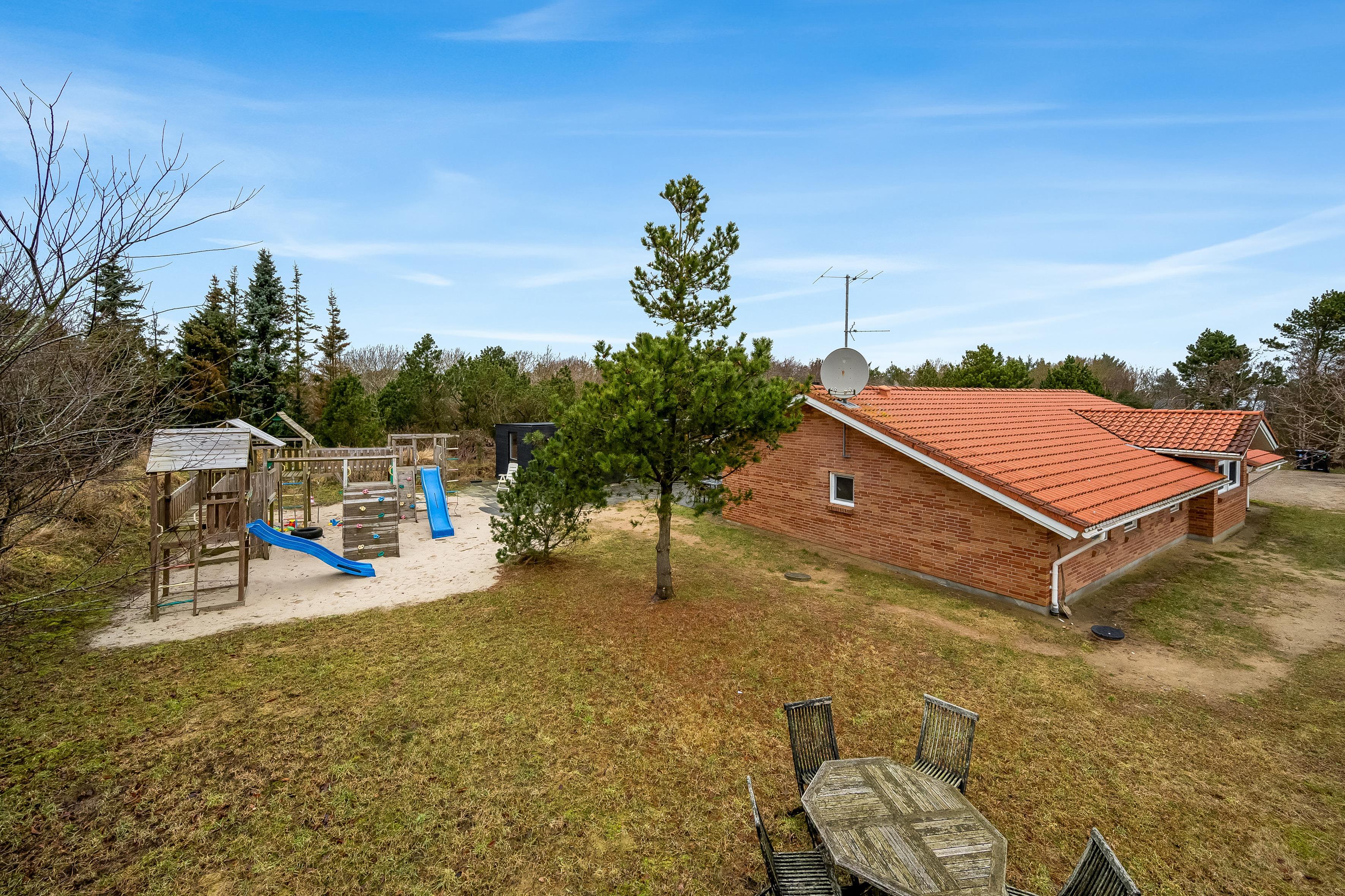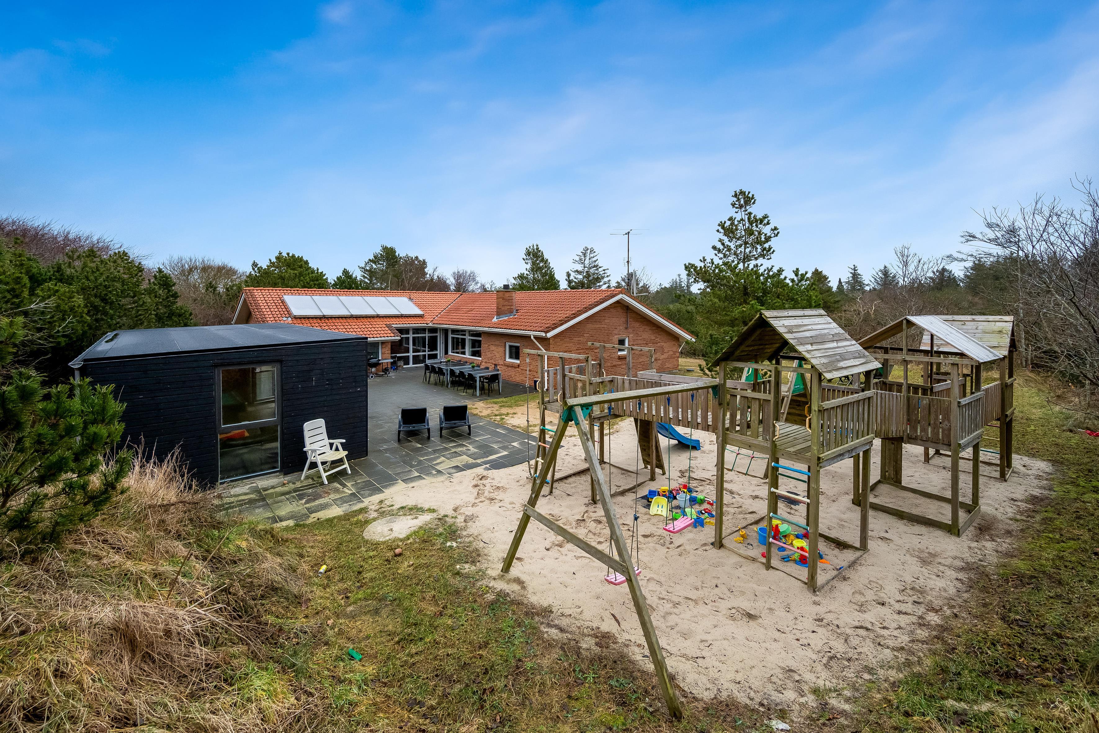 Udenfor kan gæsterne nyde en 50 kvadratmeter stor terrasse med havemøbler og grill, perfekt til udendørs måltider og sociale sammenkomster. En stor legeplads med gynger tilføjer en ekstra dimension af glæde for både børn og voksne.