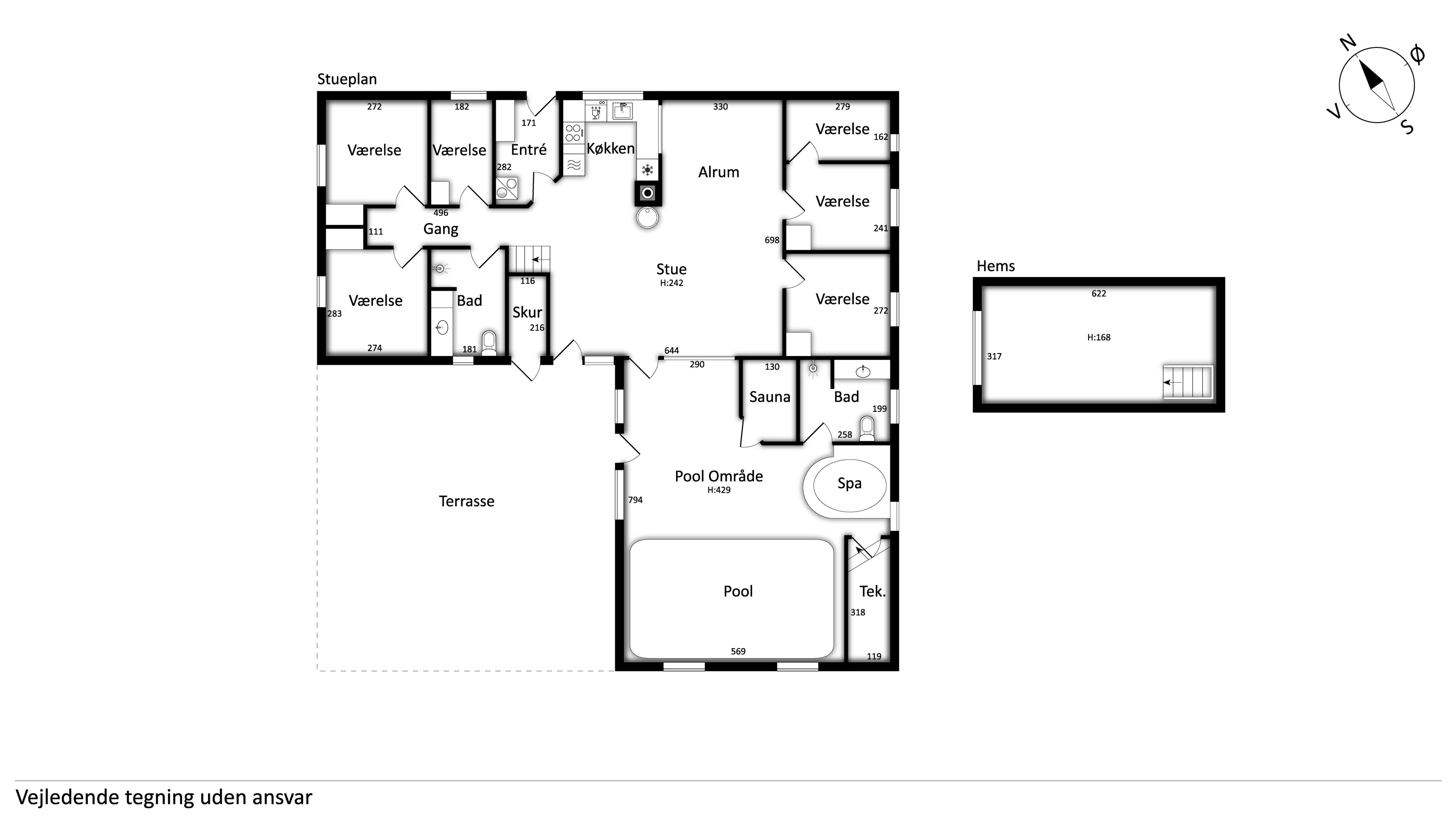Huset er energieffektivt med en varmepumpe til opvarmning af både poolen og stuen, hvilket sikrer et behageligt indeklima og hjælper med at holde strømforbruget nede, samtidig med at vi skåner miljøet.