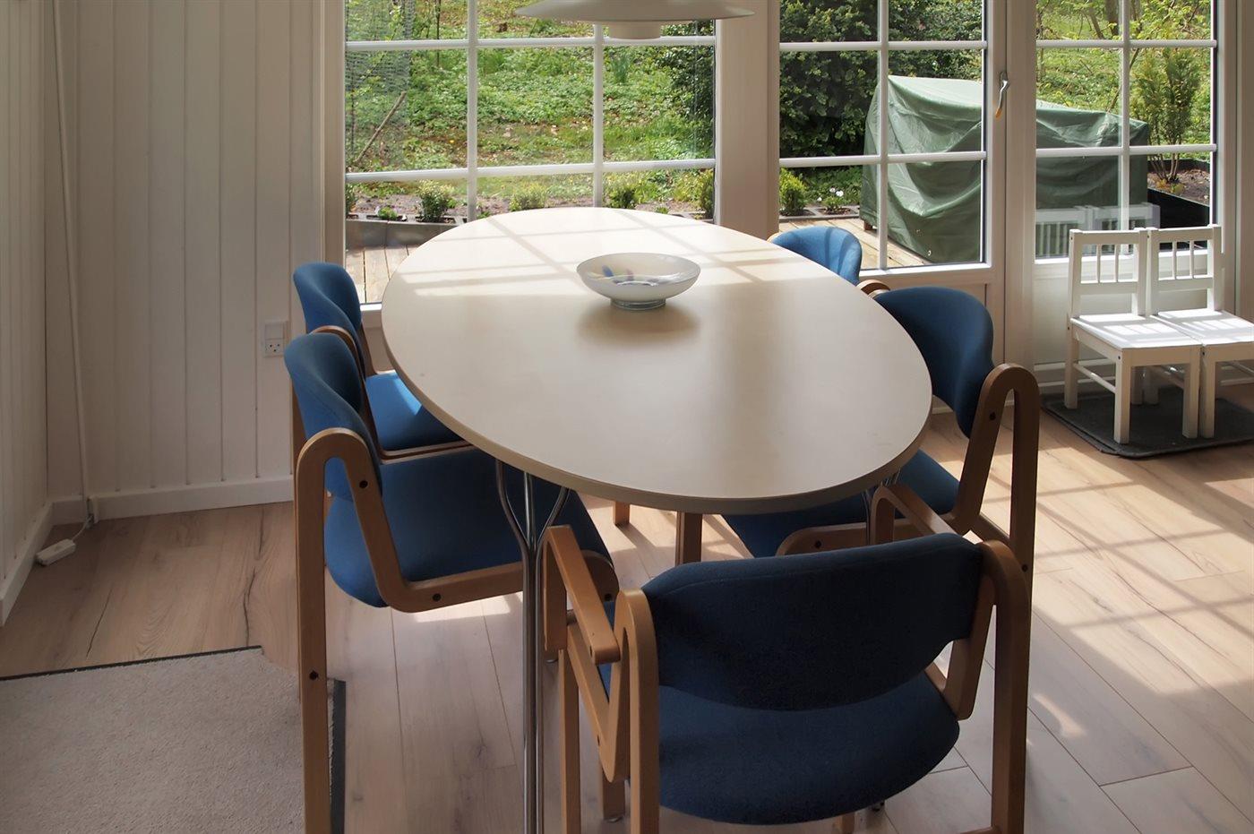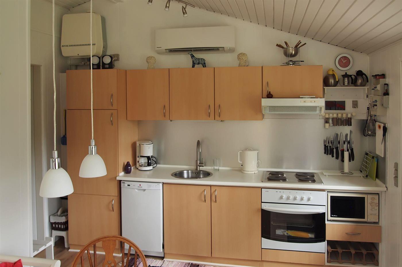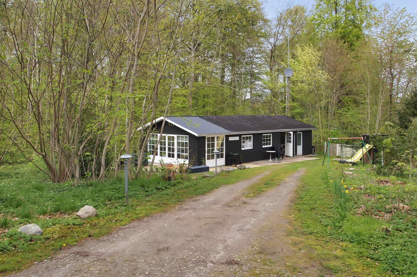Mindre, dejligt sommerhus i træ, bygget i 1982 og løbende vedligeholdt, beliggende på en naturgrund med græs og lige i skovkanten, nær badestranden. Huset ligger på en rolig vej. Udestue med havemøbler og gode legemuligheder for børn. Gulvene er belagt med tæpper. Trævægge og -lofter. Nyere køkken med linoleumsgulv, opvaskemaskine og mikrobølgeovn. Opholdsstuen er pænt møbleret og indeholder TV med parabol (digital). Husets sovepladser fordeler sig på 1 værelse med dobbeltseng og 1 værelse med 2 enkeltsenge. Redskabsrum i anneks. Høj barnestol, barneseng, sandkasse og gyngestativ til børnene.