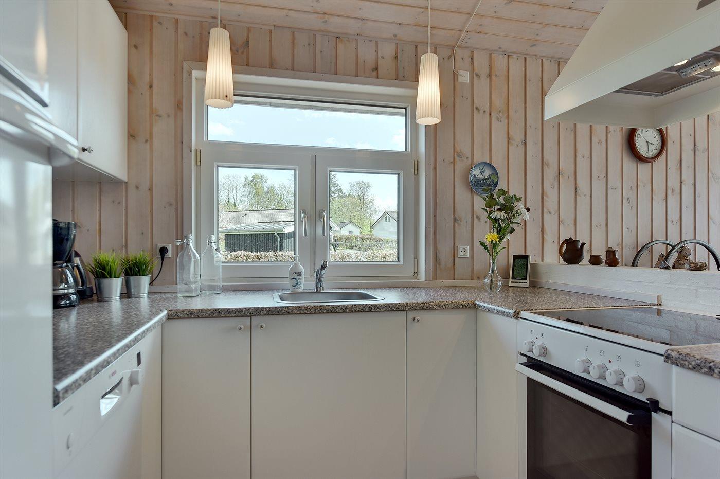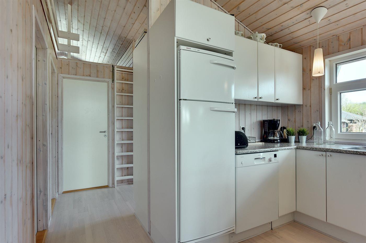 Køkkenet er udstyret med 1 køleskab. Der er 4 keramiske kogeplader, bageovn, mikrobølgeovn samt opvaskemaskine.