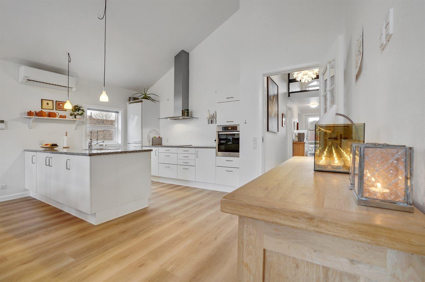 Køkkenet er udstyret med 1 køleskab. Der er 4 induktionskogeplader, varmluftovn, mikrobølgeovn samt opvaskemaskine.
