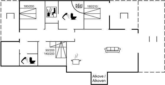 Der er i alt 3 soveværelser. Sovepladserne fordeler sig på: 6 sovepladser i dobbeltsenge. 2 sovepladser i køjeseng. 2 sovepladser i alkove. Derudover er der 1 stk. barneseng.