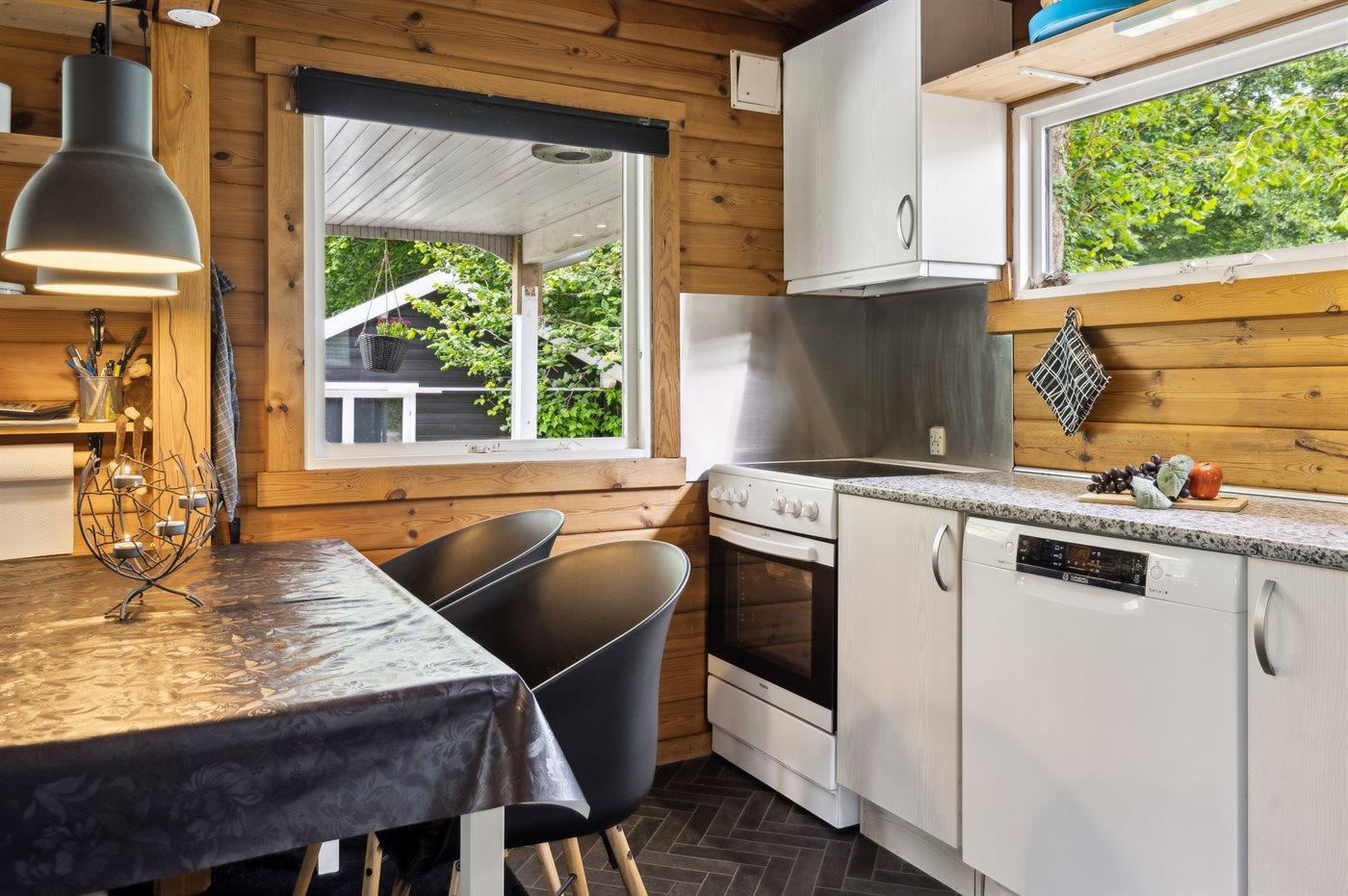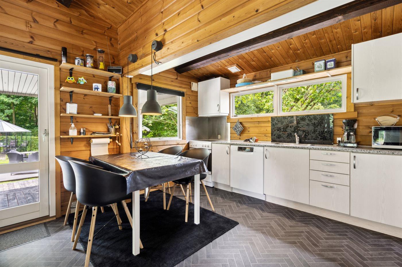 Køkkenet er udstyret med 1 køleskab. Der er 4 keramiske kogeplader, varmluftovn, mikrobølgeovn samt opvaskemaskine.