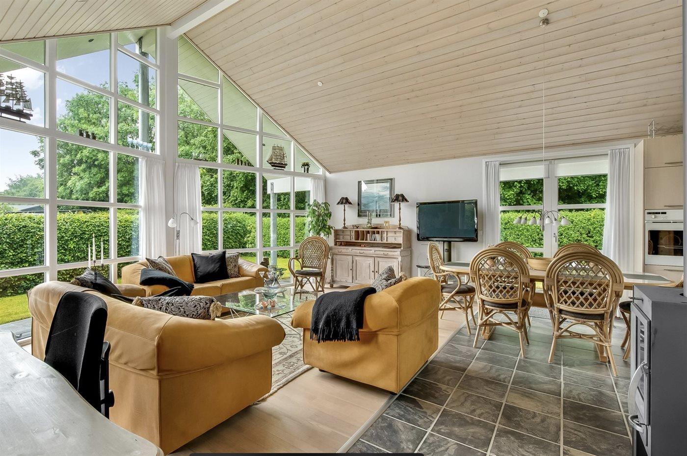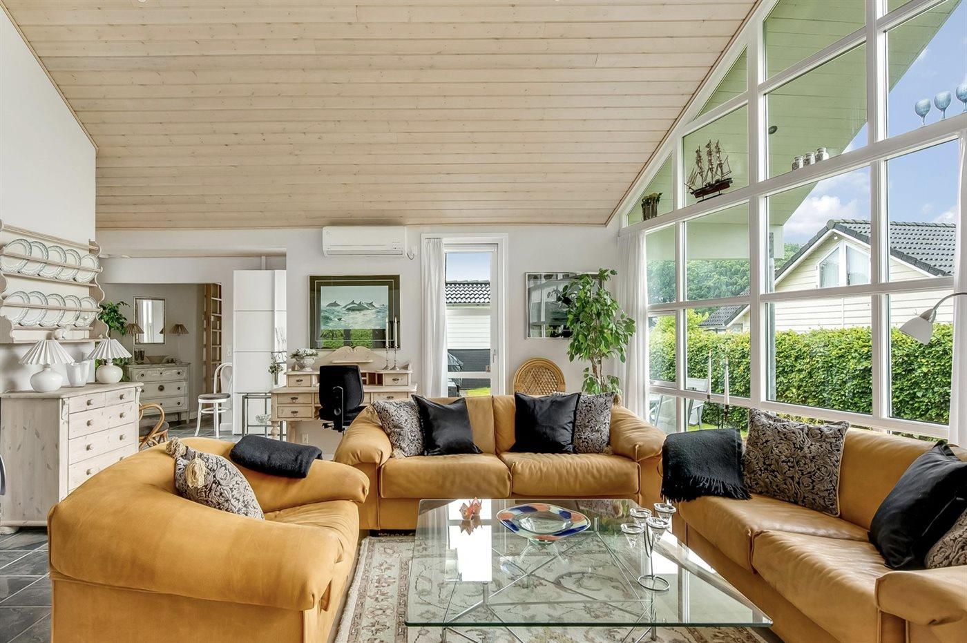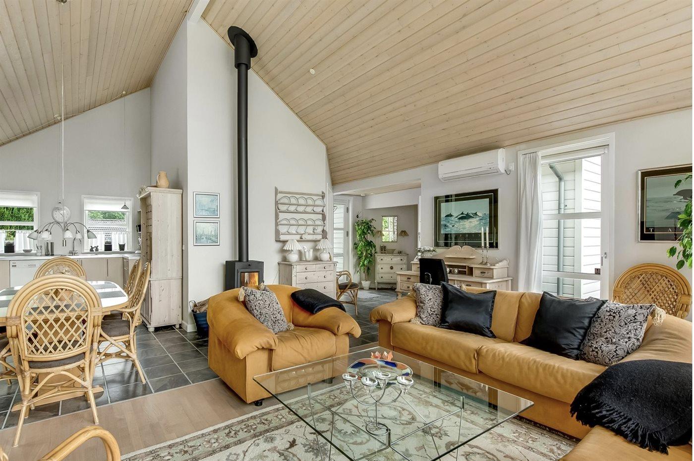 Det rummelige og meget hyggelige sommerhus har et køkken-alrum med et imponerende vinduesparti fra gulv til loft, hvor lyset strømmer ind og giver jer et skønt kig ud til haven. Det store opholdsrum danner den perfekte ramme om feriens indeliv, hvor I kan samles og nyde hinandens selskab. Her finder I et flot sofasæt i en frisk orange farve, som sammen med spisepladsen indbyder til mange hyggelige stunder med god mad, lange samtaler eller et spil ved køkkenbordet.