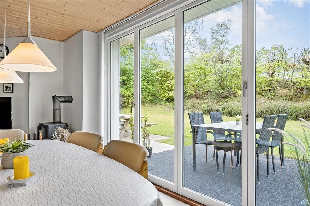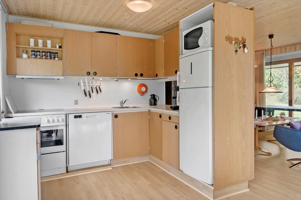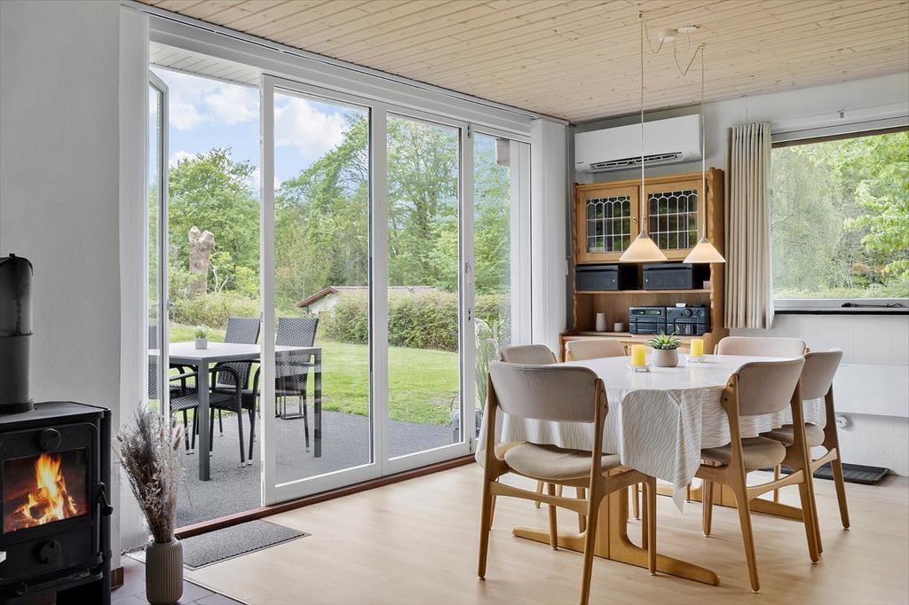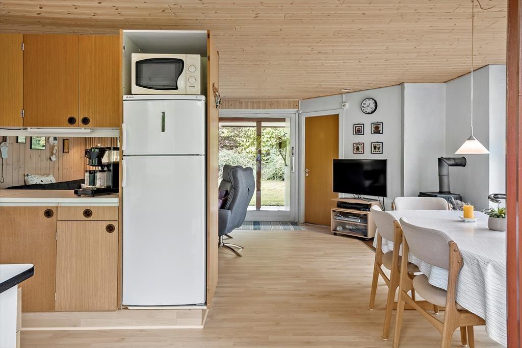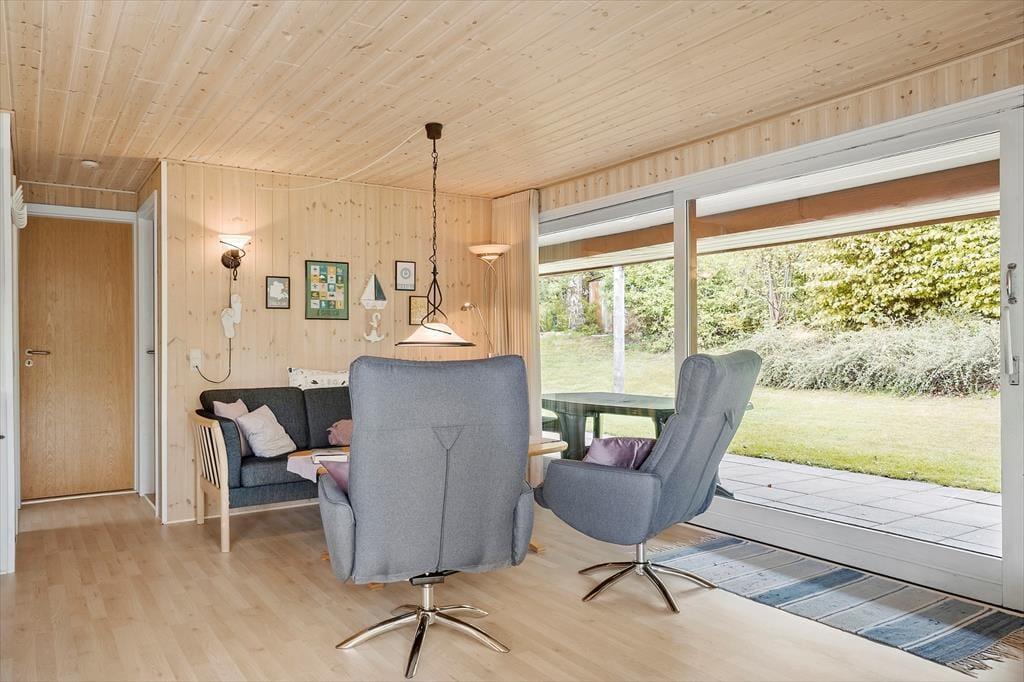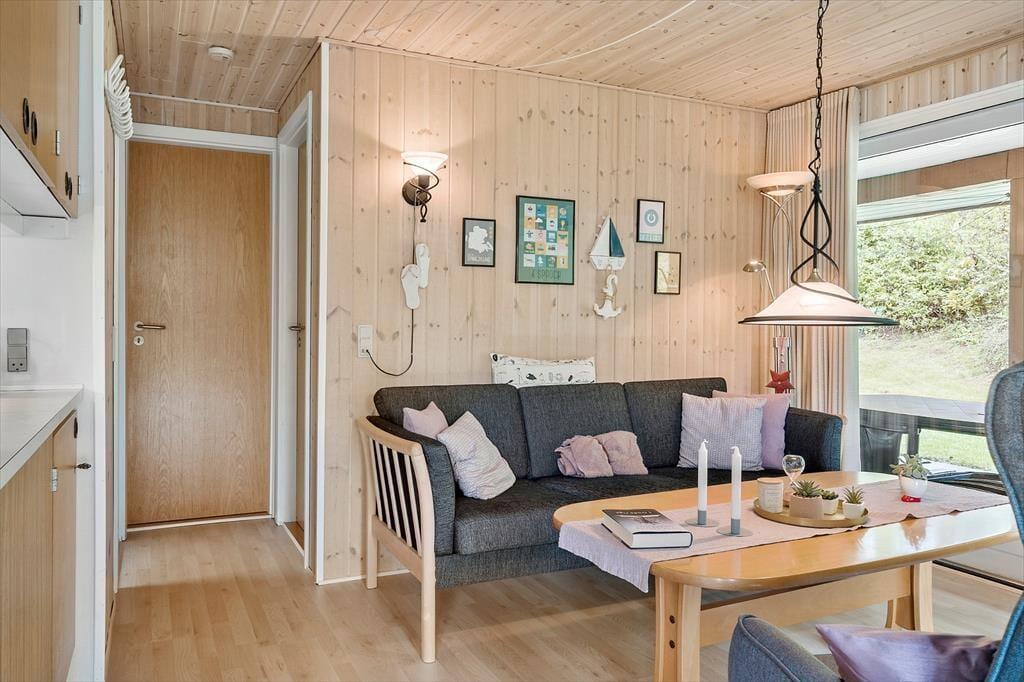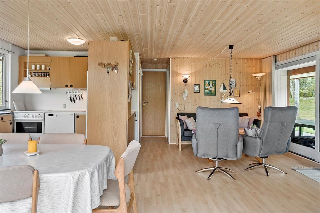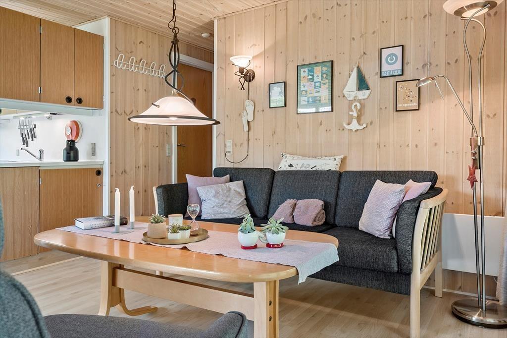 Når du træder indenfor i sommerhuset, bliver du mødt af en varm og hyggelig stemning, der straks får skuldrene til at sænke sig. Indretningen er enkel og indbydende med fokus på feriehygge og samvær. Her er plads til at samle familien omkring spisebordet til lange måltider, brætspil og gode samtaler, mens dagens oplevelser vendes. Lyset strømmer ind gennem vinduerne og skaber en behagelig atmosfære, hvor det er let at finde ro. Stuen indbyder til afslapning med en god bog eller en rolig stund, mens du lytter til stilheden og mærker feriefreden brede sig. Sommerhusets indretning giver en hjemlig fornemmelse, hvor det er nemt at føle sig tilpas og nyde feriens afslappede rytme – her er ingen krav, kun tid til hinanden.
