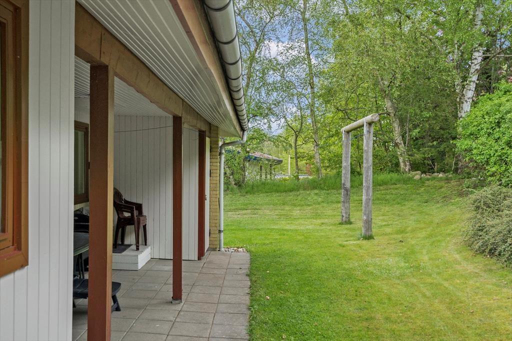 Udendørslivet er en af sommerhusets helt store kvaliteter. Den store grund giver rig mulighed for masser af udfoldelse, hvad enten det er boldspil, leg med børnene eller rolige stunder i solen. De gode terrasser omkring huset – delvist overdækkede – gør det nemt at følge solen dagen igennem. Start morgenen med en kop kaffe i læ, mens fuglene kvidrer, og afslut dagen med en hyggelig grillaften, hvor du kan nyde den friske luft og den rolige stemning. Her er plads til både fælles aktiviteter og stille øjeblikke, hvor du kan læne dig tilbage i havemøblerne og lade tankerne vandre. Terrasserne bliver hurtigt samlingspunktet for ferien og indbyder til lange, lyse sommeraftener i godt selskab.