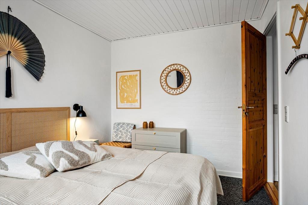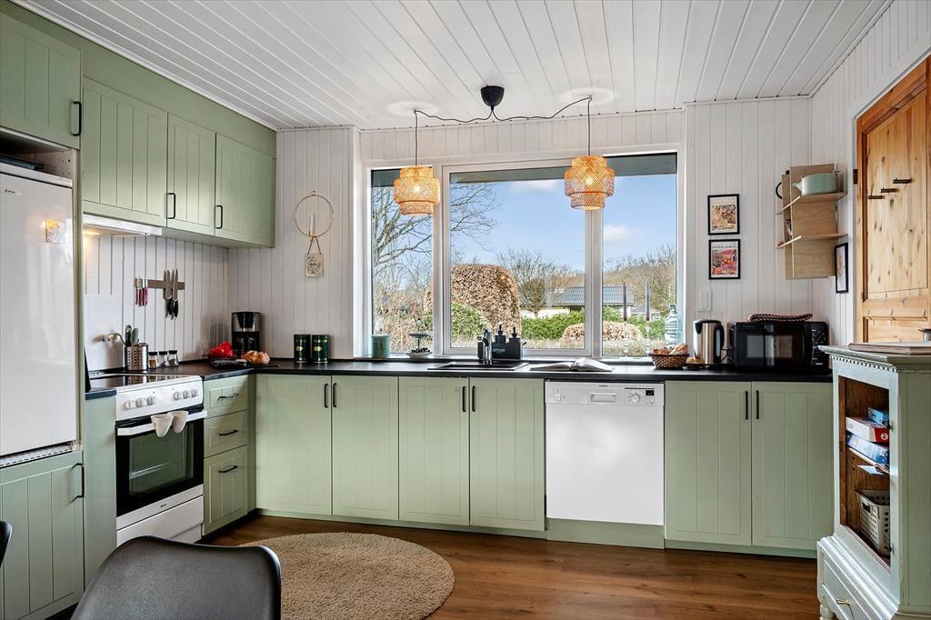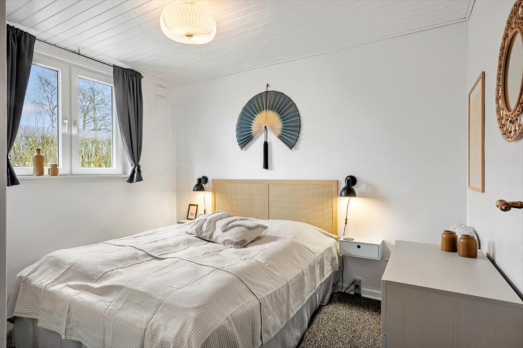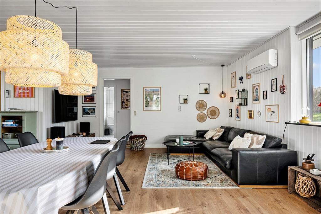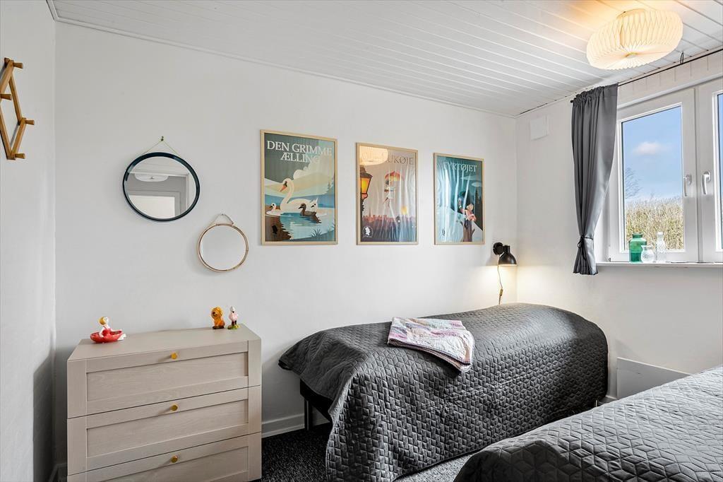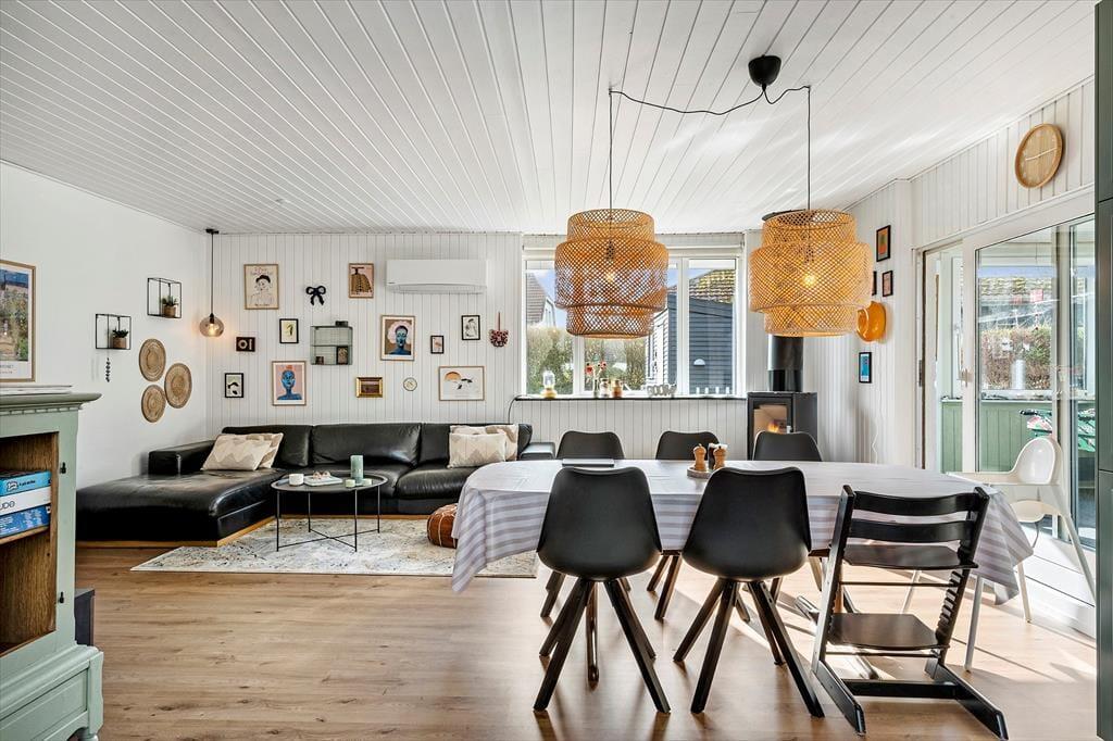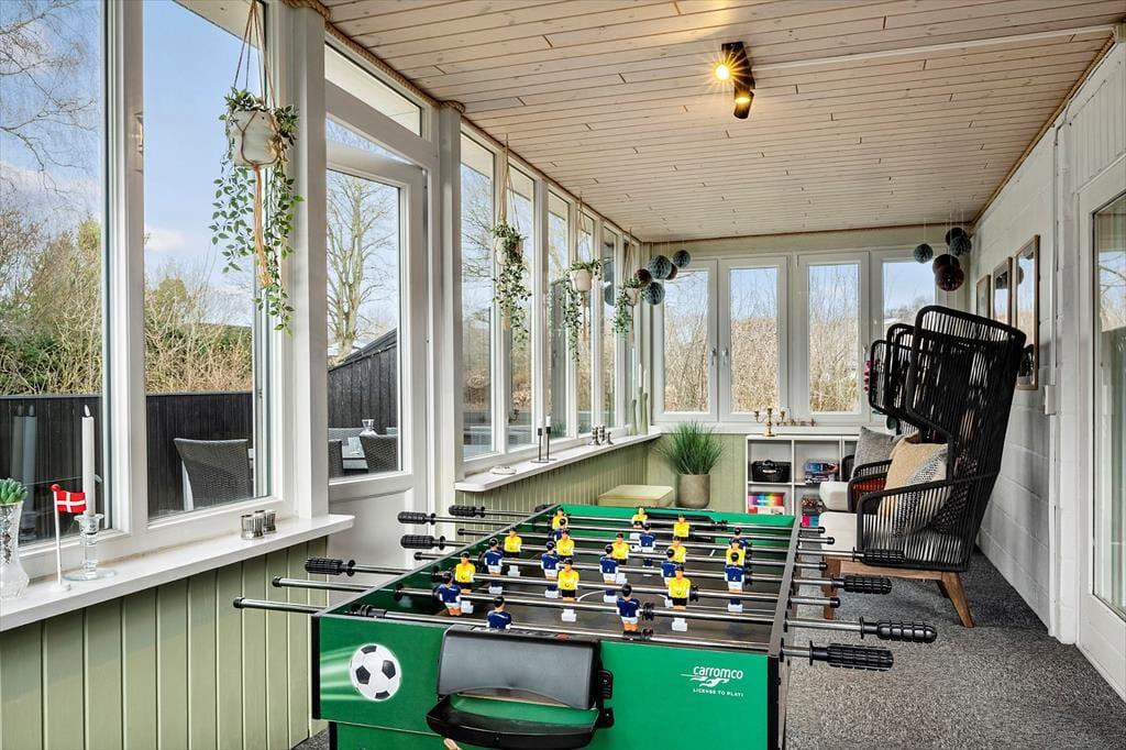 Når du træder indenfor i sommerhuset, mødes du af en varm og indbydende atmosfære, hvor hyggen er i centrum. Indretningen er personlig og afslappet, så du hurtigt føler dig hjemme og kan finde ro efter en dag i naturen. Stuen indbyder til samvær, hvad enten det er med en god bog, en kop kaffe eller hyggelige stunder omkring bordfodbolden i havestuen, som uden tvivl vil samle både børn og voksne til sjove turneringer og masser af grin. Lyset strømmer ind gennem vinduerne og skaber en behagelig stemning, mens udsigten til haven giver en tæt forbindelse til naturen udenfor. Sommerhuset er et oplagt sted at nyde feriens stille øjeblikke, hvor samtalerne får lov at vare lidt længere, og dagene flyder roligt afsted.