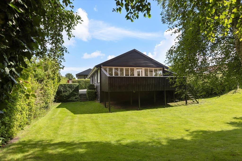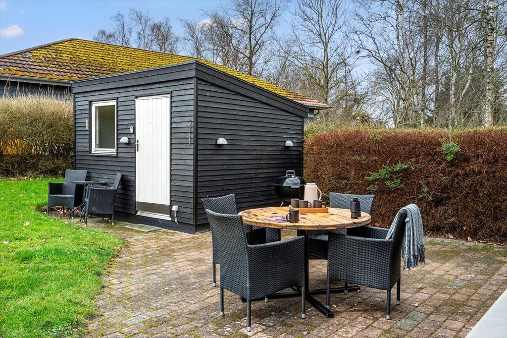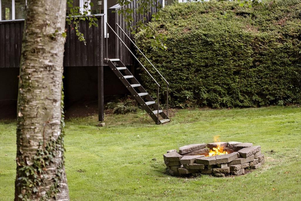 Udendørs venter en dejlig, kuperet have, der nærmest kalder på leg, afslapning og lange dage under åben himmel. Her kan børnene more sig på gyngen, mens de voksne slår sig ned med en kop kaffe og lytter til fuglenes kvidren. Havens bålsted skaber de perfekte rammer for hyggelige aftener, hvor der kan bages snobrød, fortælles historier og nydes den særlige stemning, som kun et knitrende bål kan give. Den hævede terrasse er et skønt samlingspunkt, hvor du kan nyde måltider i det fri og samtidig skue ud over haven og det grønne landskab. Her er der plads til både solrige dage og rolige aftener, hvor solen langsomt går ned, og ferieroen for alvor sænker sig.