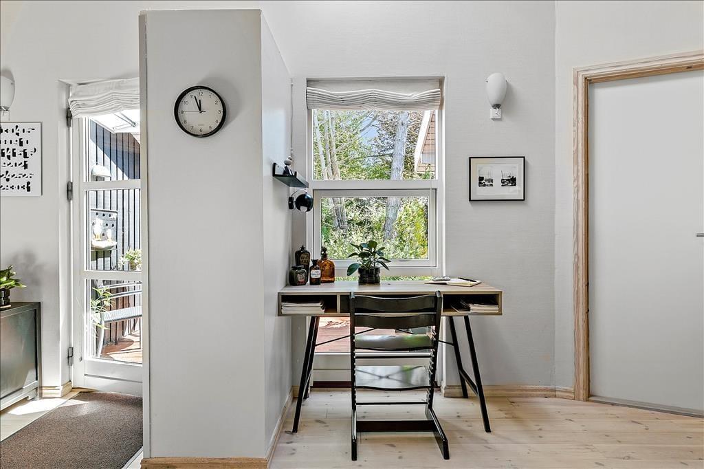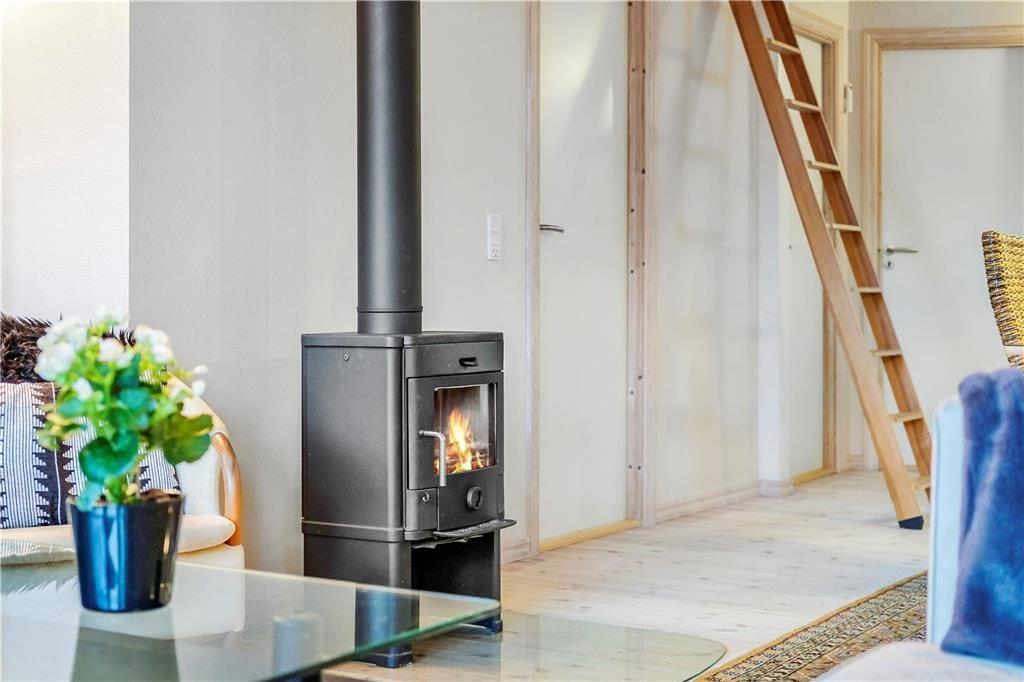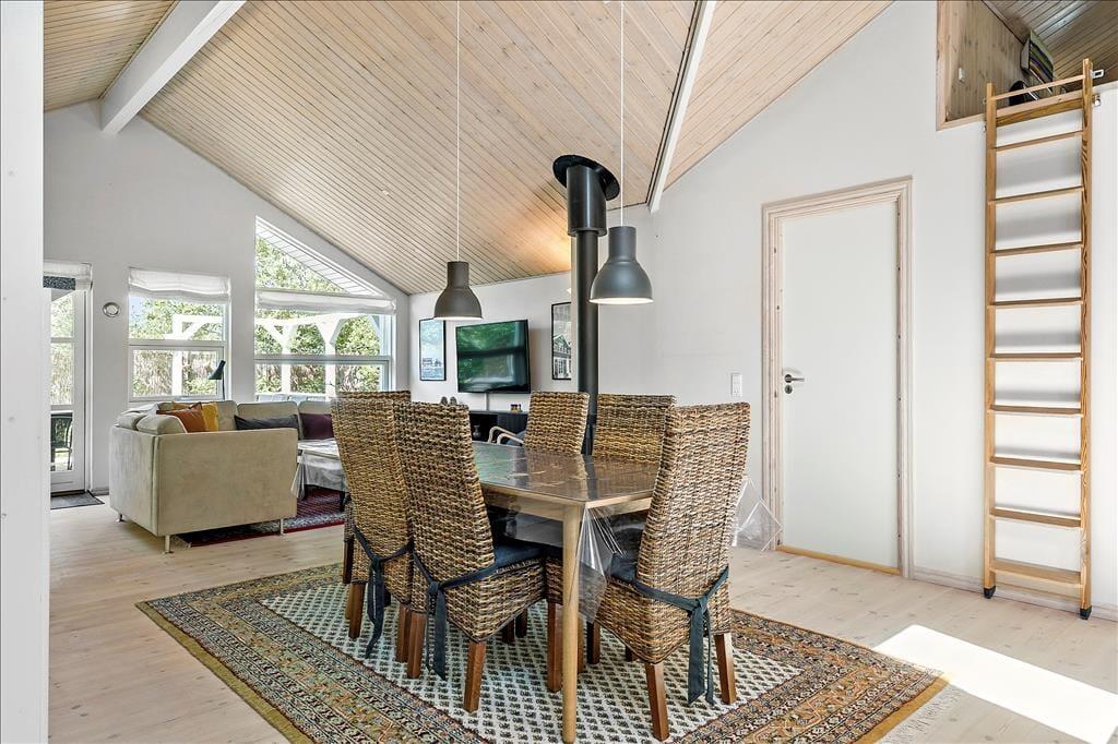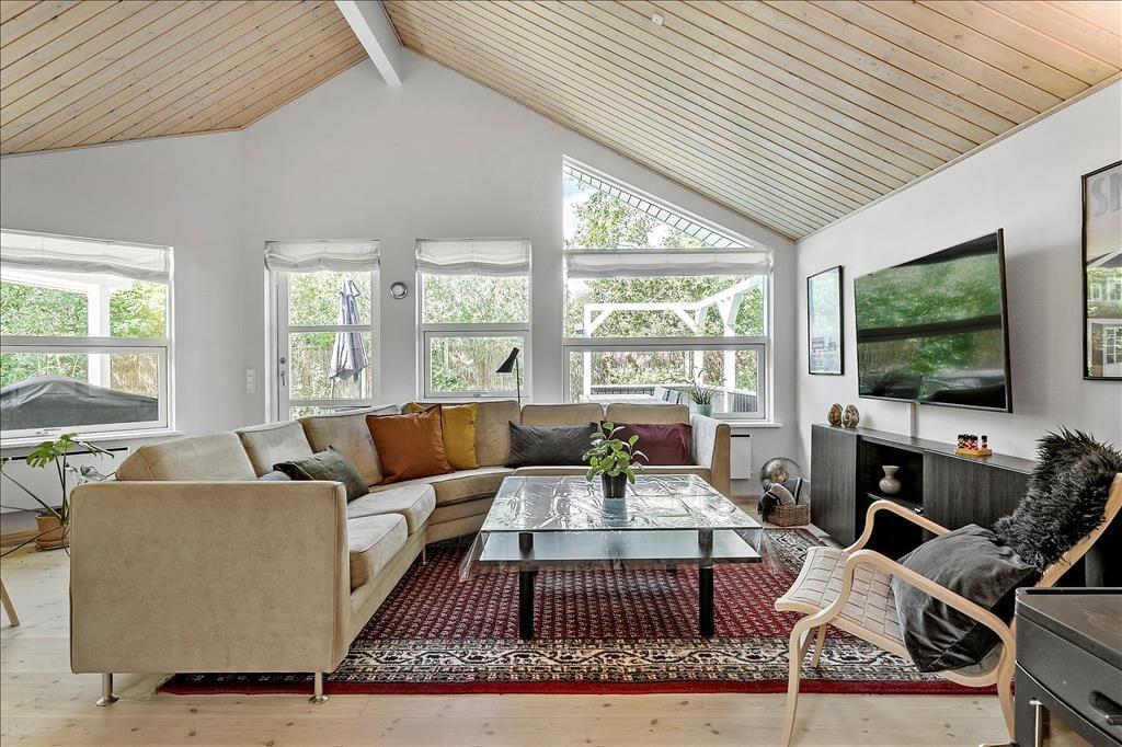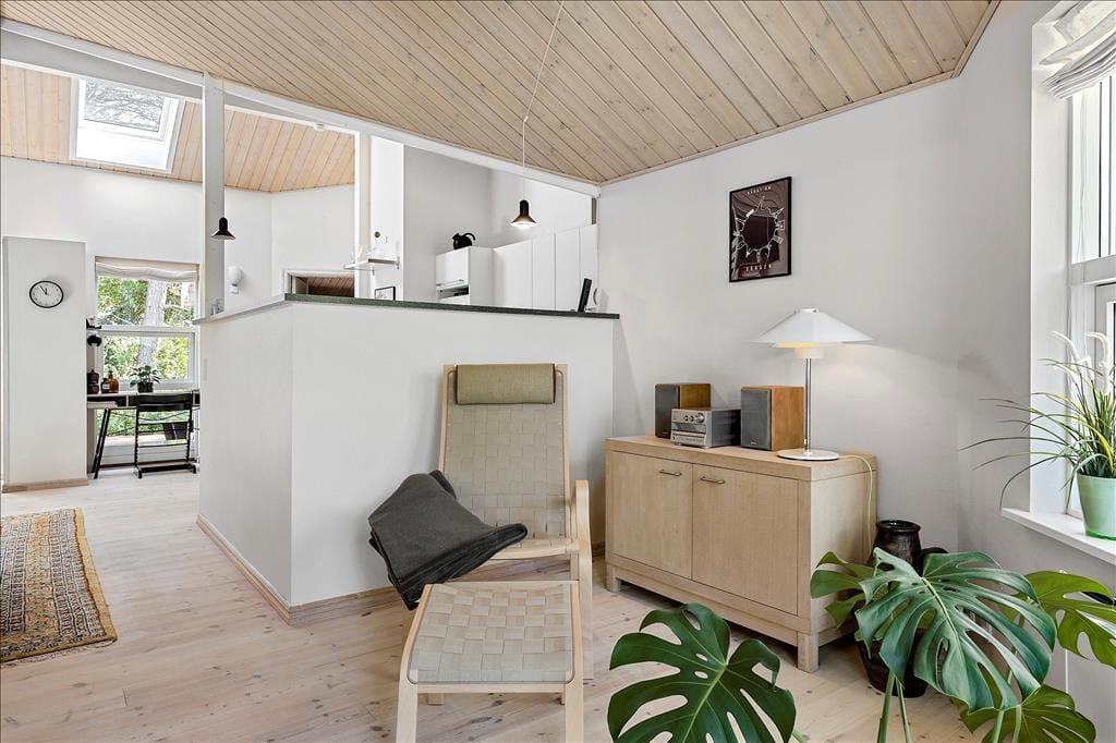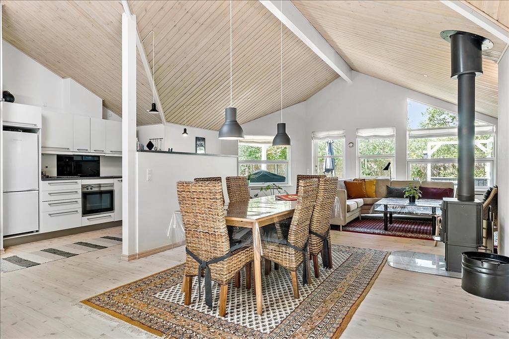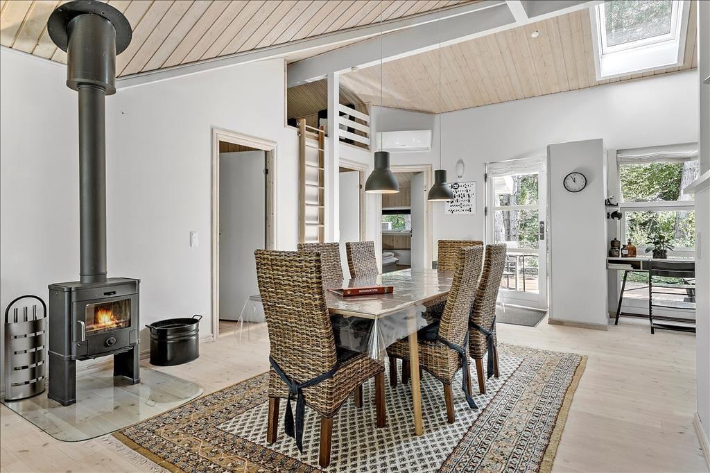 Indenfor venter en indbydende atmosfære med loft til kip og et flot lysindfald fra de store vinduer, der giver en skøn forbindelse til naturen udenfor. Huset er indrettet med fokus på hygge og komfort, så du kan slappe af med dine nærmeste. Den åbne planløsning forbinder stue og køkken, og her kan I samles om madlavning og hyggelige stunder ved spisebordet eller foran brændeovnen. Soveværelserne er lyse og behagelige, og badeværelset tilbyder en dejlig ramme til at starte eller slutte dagen.
