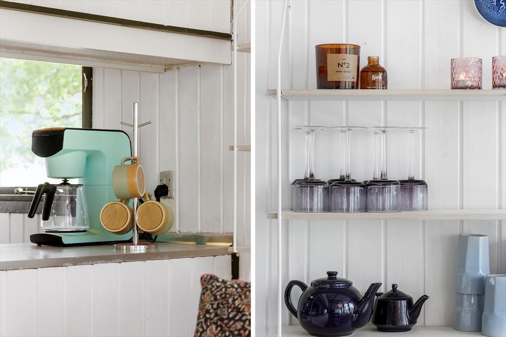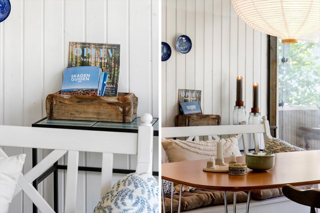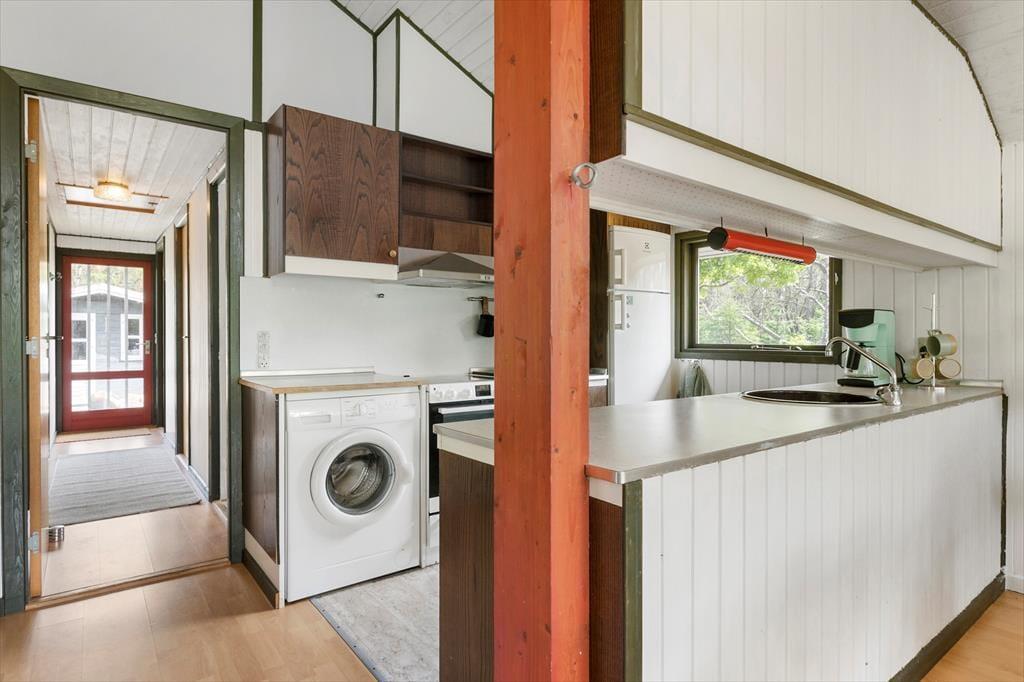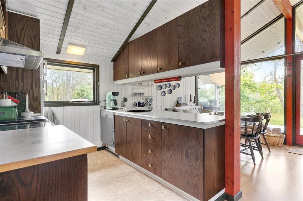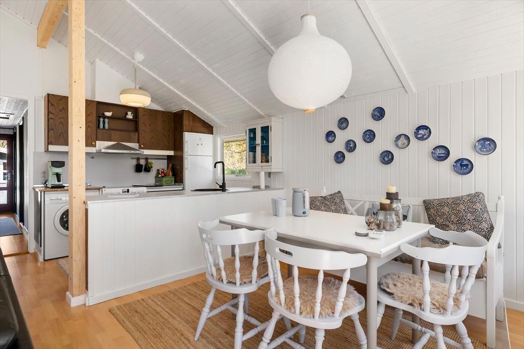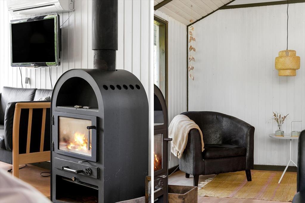 Allerede ved første skridt ind i sommerhuset bliver du mødt af en varm og rolig atmosfære. Her er det lette og lyse interiør i fokus, og det store vinduesparti samt loft til kip skaber en dejlig rumfornemmelse, hvor dagslyset strømmer ind og naturen udenfor bliver en del af oplevelsen indenfor. Den åbne stue gør det nemt at være sammen – uanset om der skal laves mad, hygges med kortspil eller nydes en god film i sofaen. Brændeovnen i stuen sørger for varme og ekstra hygge, når mørket falder på, og det knitrende ildsted samler hele familien om aftenerne. Sommerhuset egner sig perfekt til en familie eller en gruppe på op til seks personer – og din hund er naturligvis også velkommen, så hele flokken kan tage på ferie sammen.