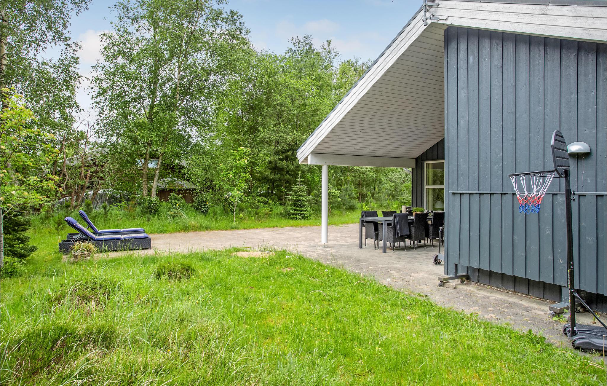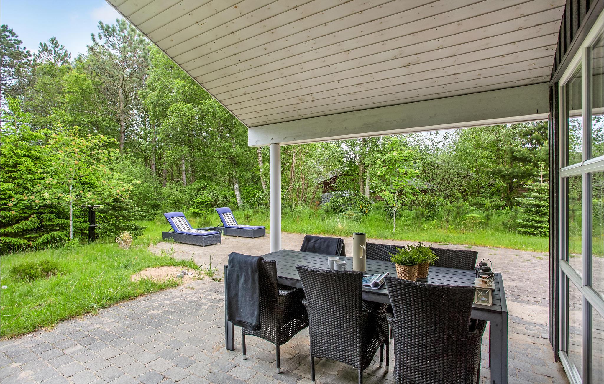Hyggeligt feriehus nær Ålbæk med stor terrasse, brændeovn, sauna og spabad i naturskønne omgivelser.