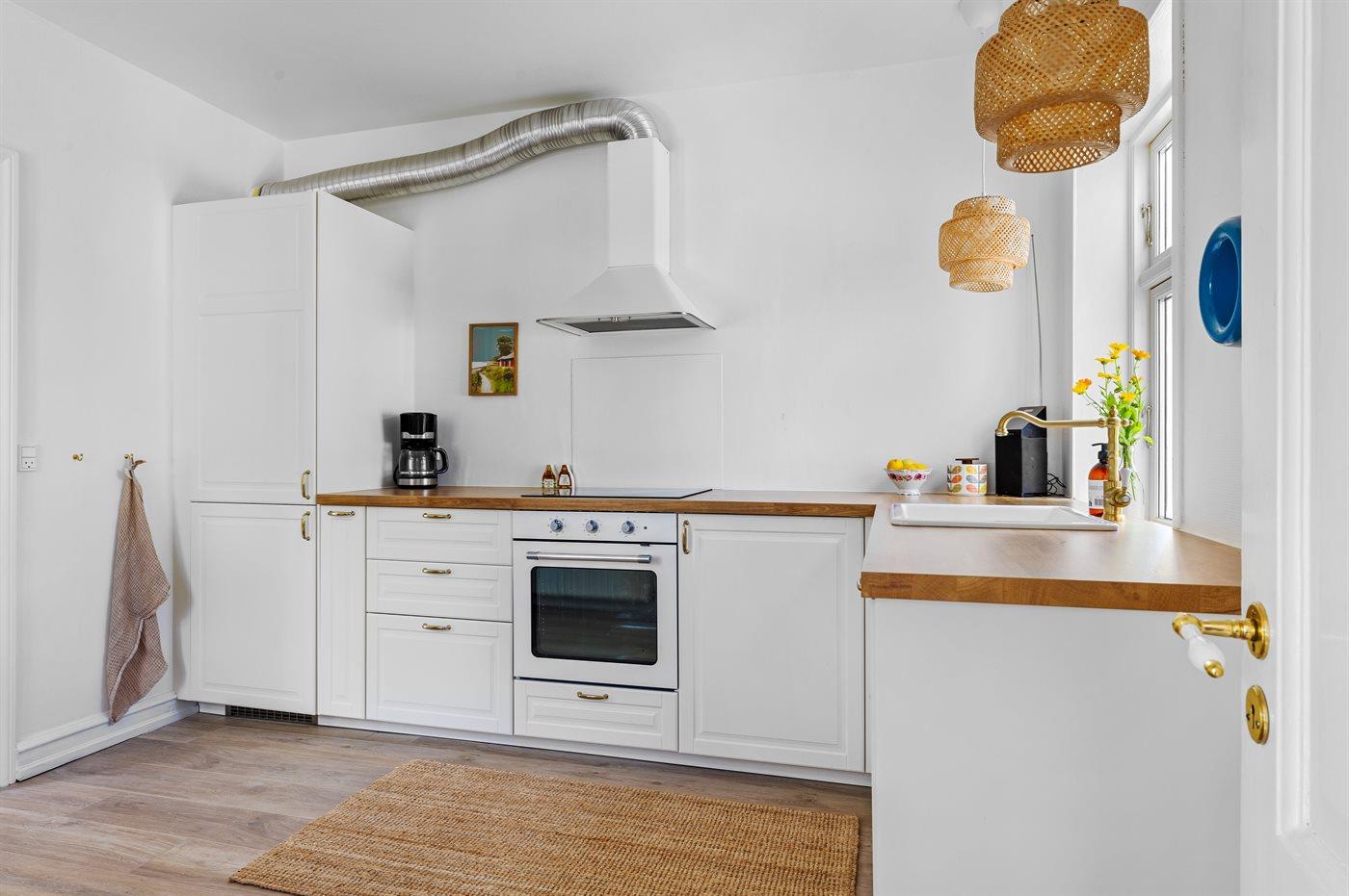 Køkkenet er udstyret med 1 køleskab. Der er 4 induktionskogeplader, varmluftovn samt opvaskemaskine.