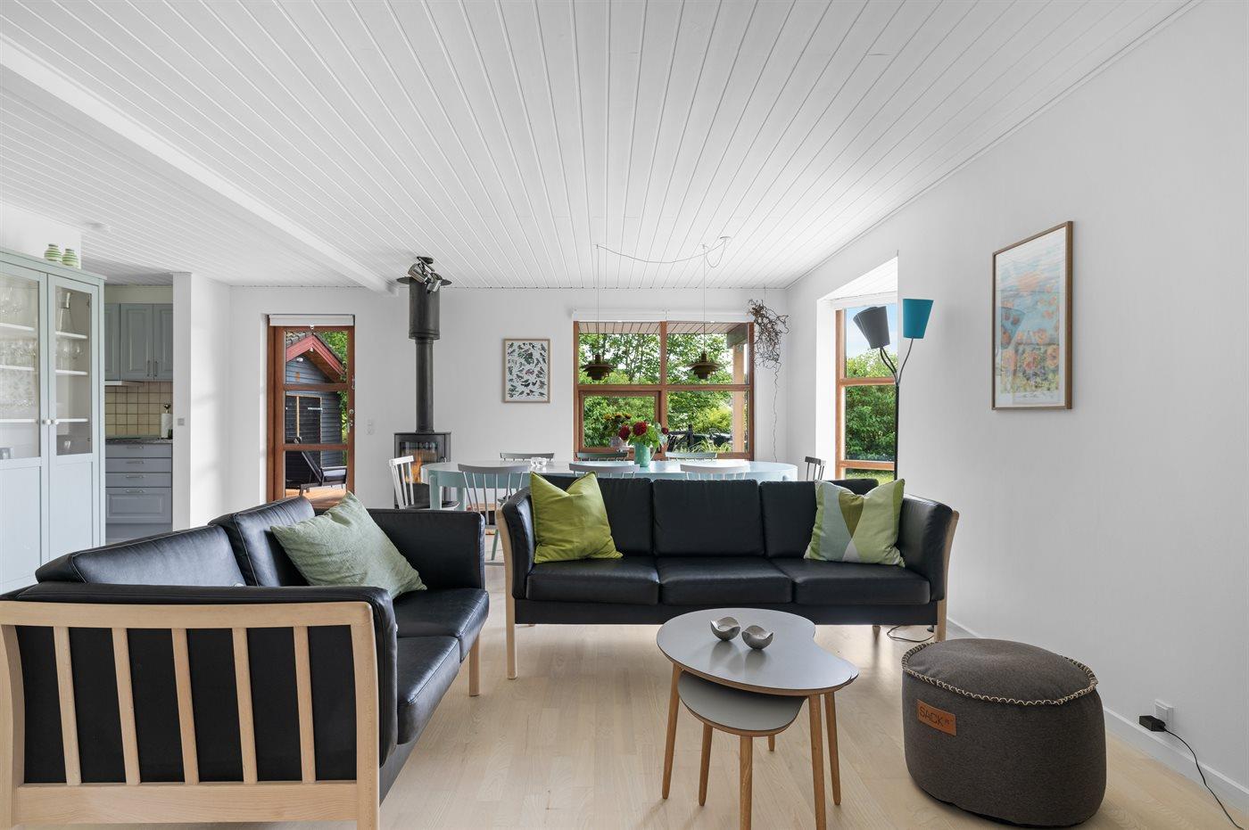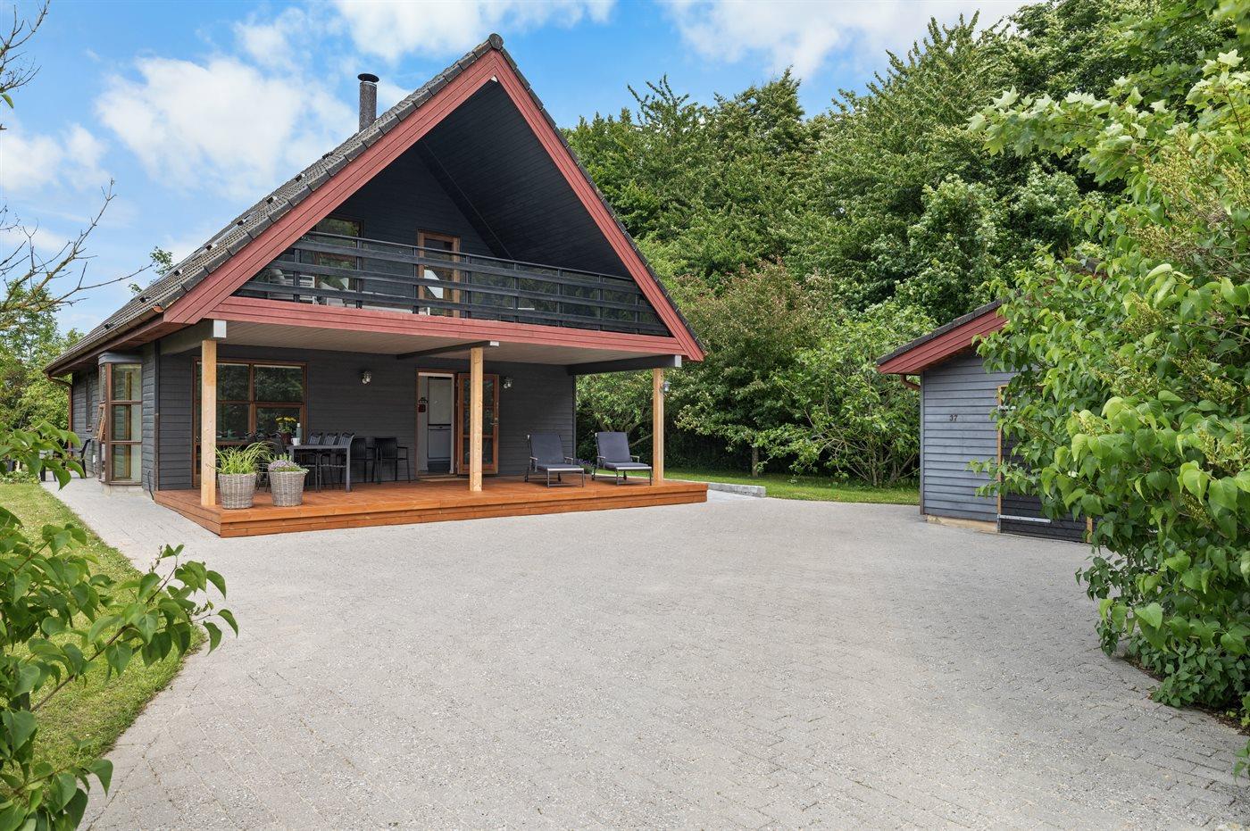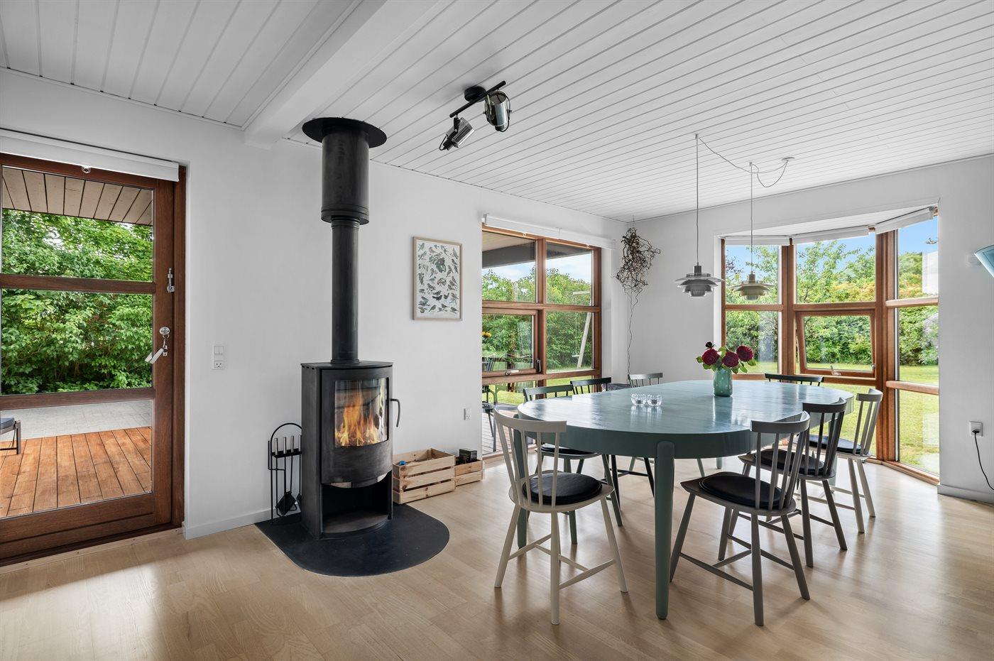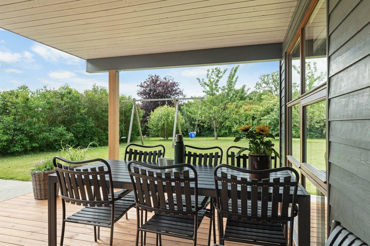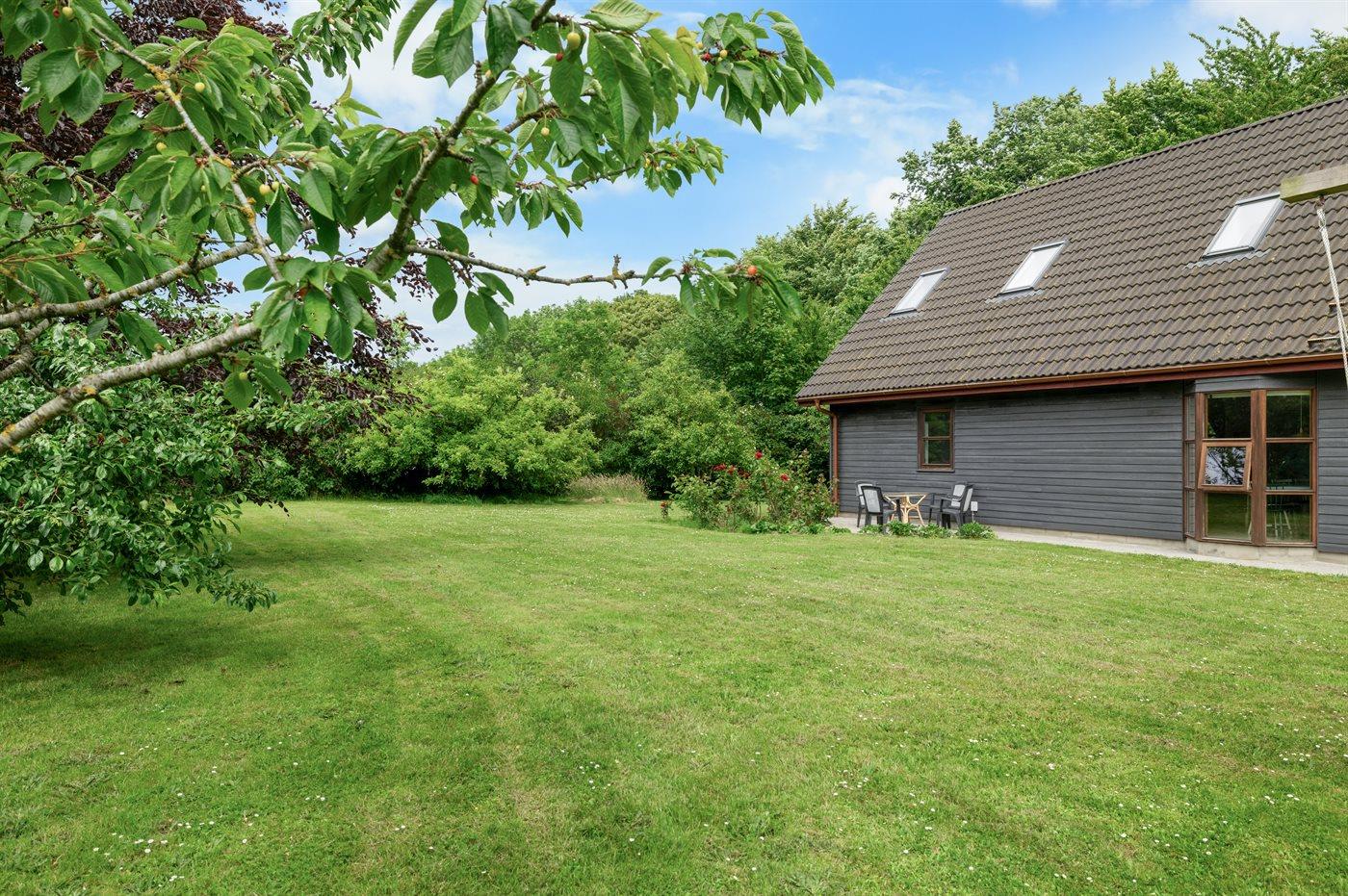 Der er en skøn overdækket terrasse og en stor have med bl.a. frugttræer, bærbuske, bålsted og gynger. Fra haven er der udgang til et stort skovområde, og flere strande i gåafstand.