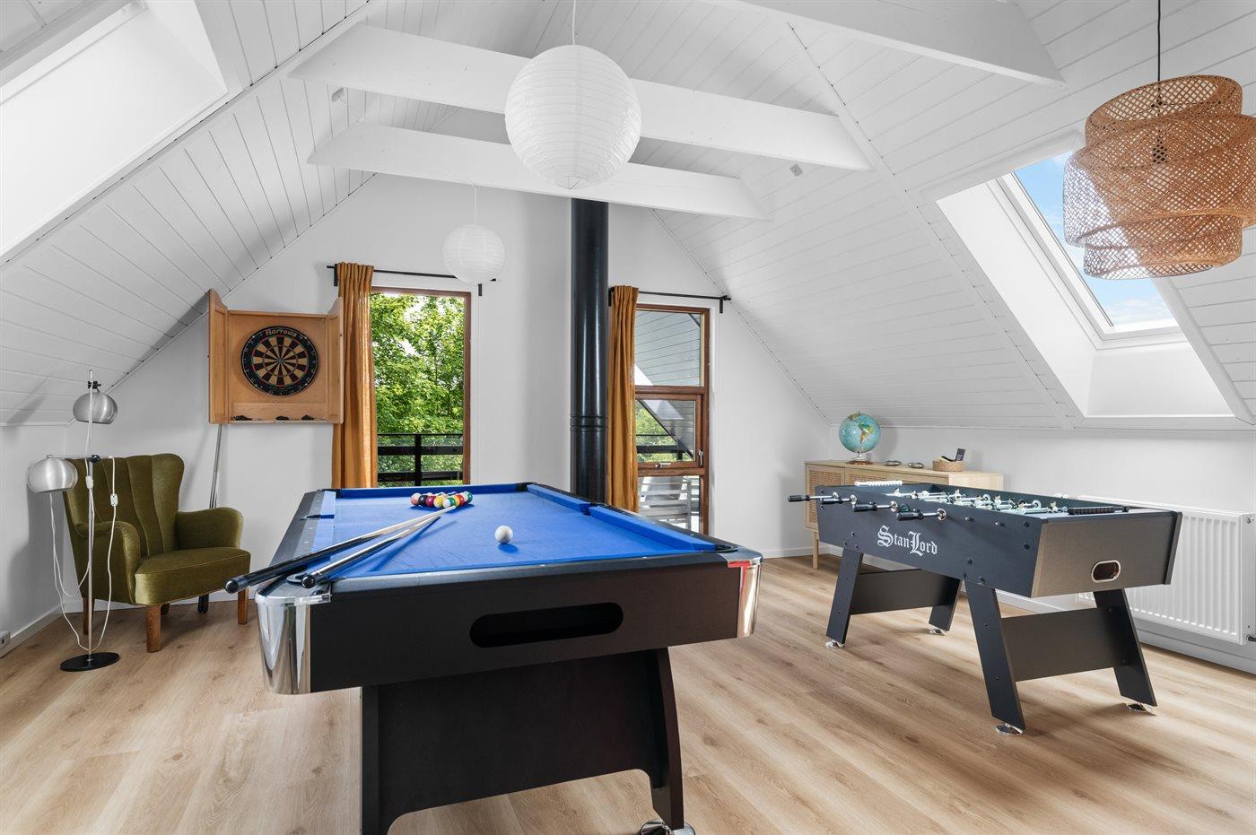 I aktivitetsrummet er der følgende udstyr: Poolbord. Dart. Bordfodbold.